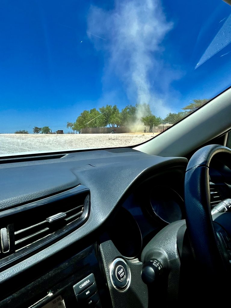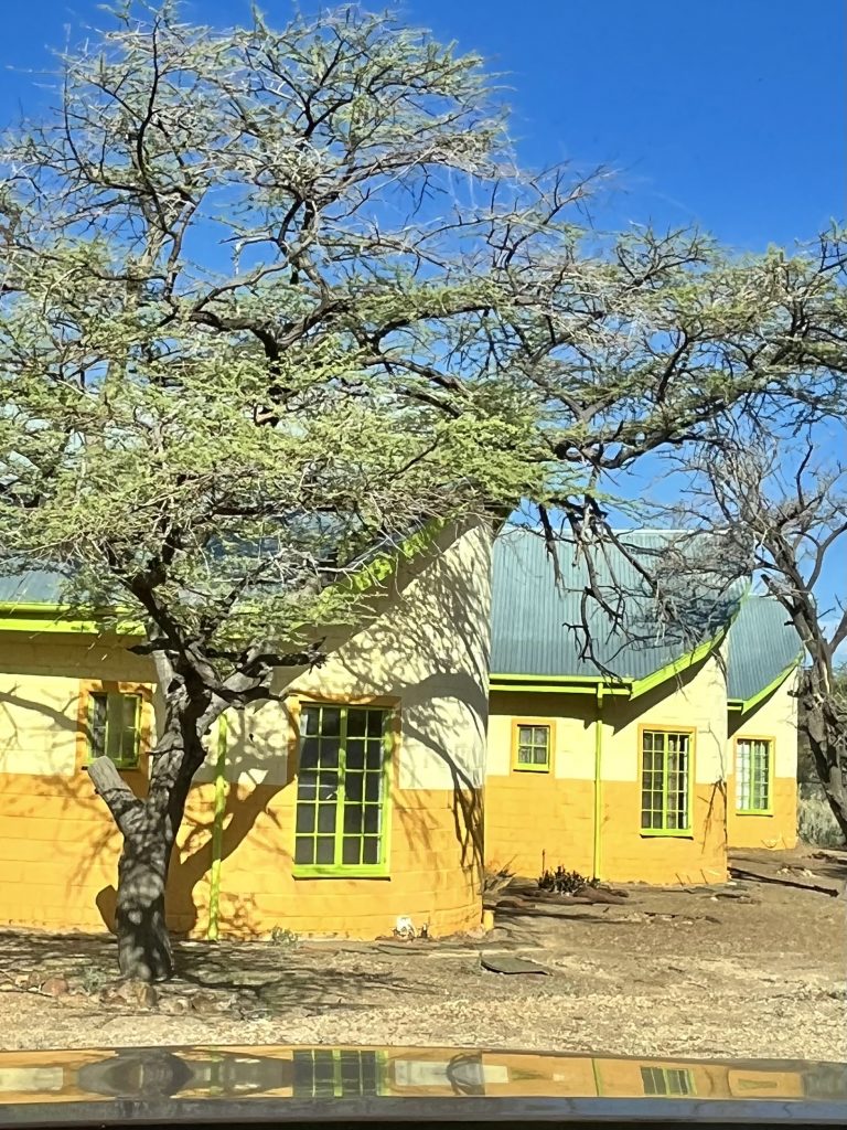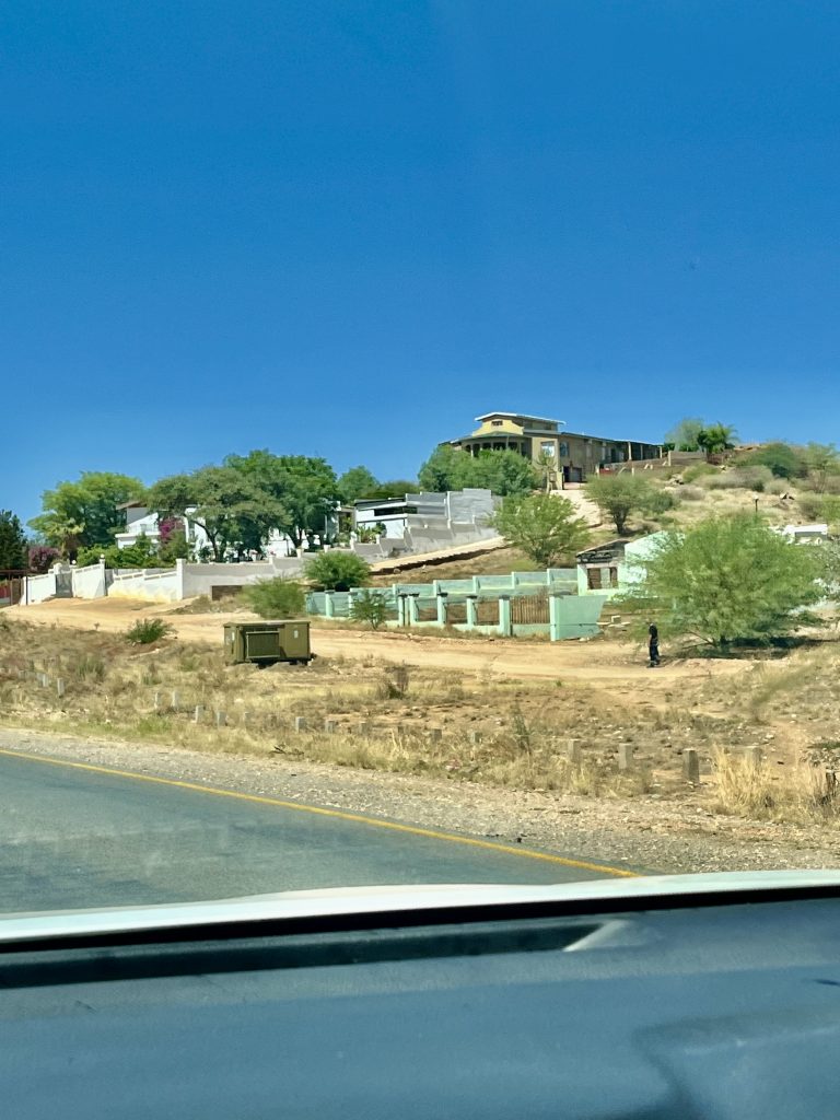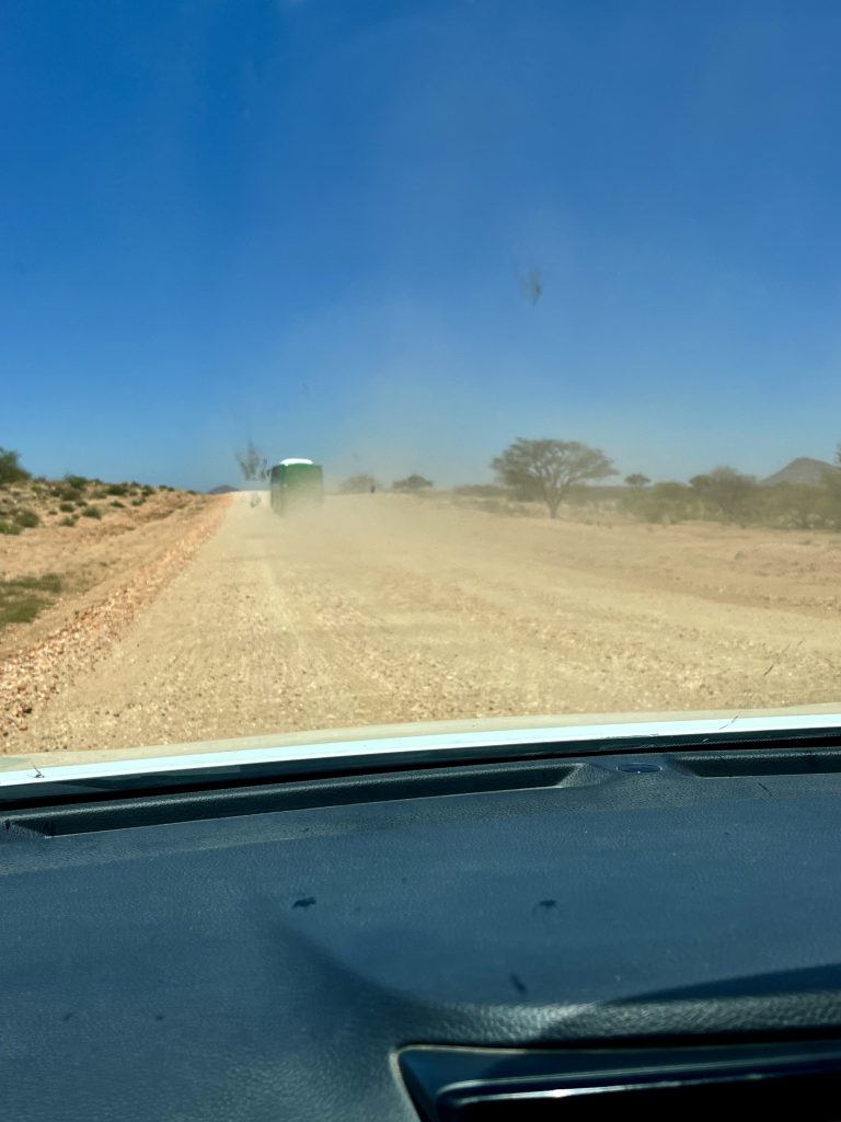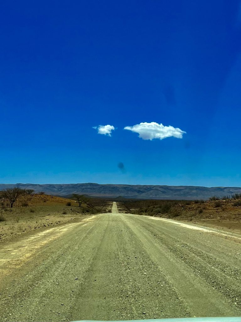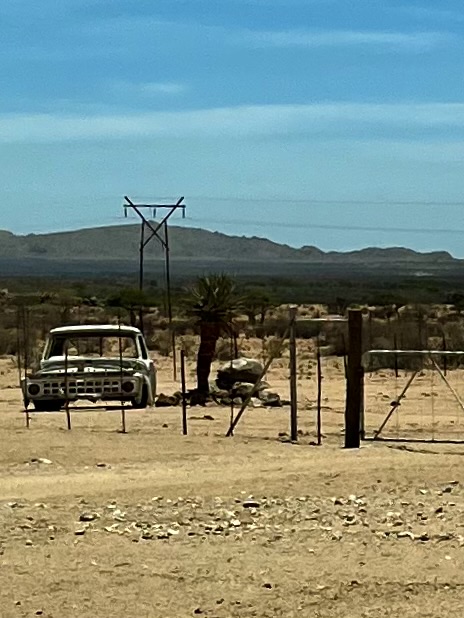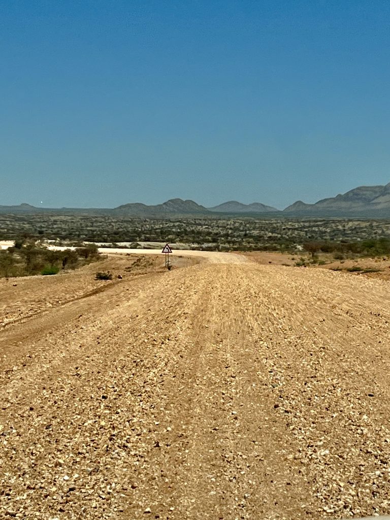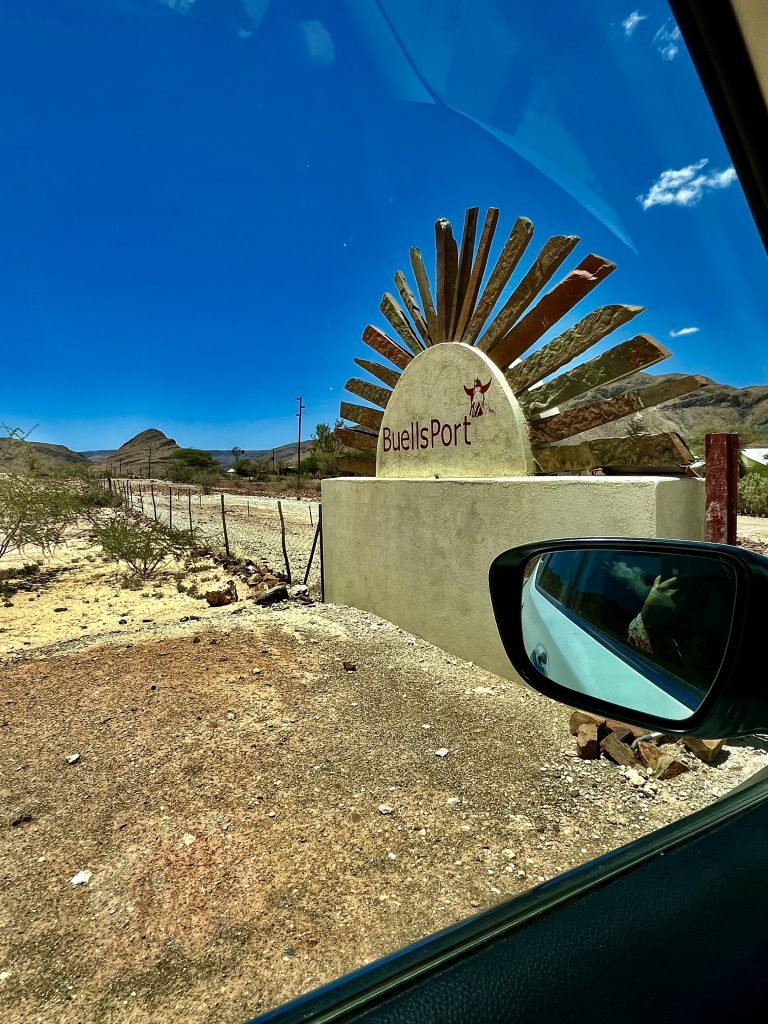 Das sieht ja schon nach Wüste aus 🏜️. Im Nu sind wir da und landen sicher in Windhoek. Silke hat uns in Windeseile eine kleine Rundreise organisiert, 5 Übernachtungen und einen Allrad SUV gebucht. Dafür nochmals ein ausdrückliches und herzliches Dankeschön❣️ Es war wirklich kaum Zeit, und der Reisebeginn musste von unserer Seite dann auch noch um 2 Tage verschoben werden. Aber Silke hat das alles super gewuppt. Nun sind wir also da, in Namibia, nehmen unseren Leihwagen, diesmal einen Japaner, Nissan Allrad, in Empfang und düsen los. Nee, erstmal schauen wir uns noch ein kleines Filmchen beim Verleiher, « Autofahren in Namibia », an. Jetzt fahren wir wirklich los, aber ganz vorsichtig! BuellsPort Gästefarm heißt unser erstes Ziel. Sie ist etwa 250 Kilometer vom Flughafen entfernt, davon sind Minimum 120 Kilometer Schotterpiste.🥴