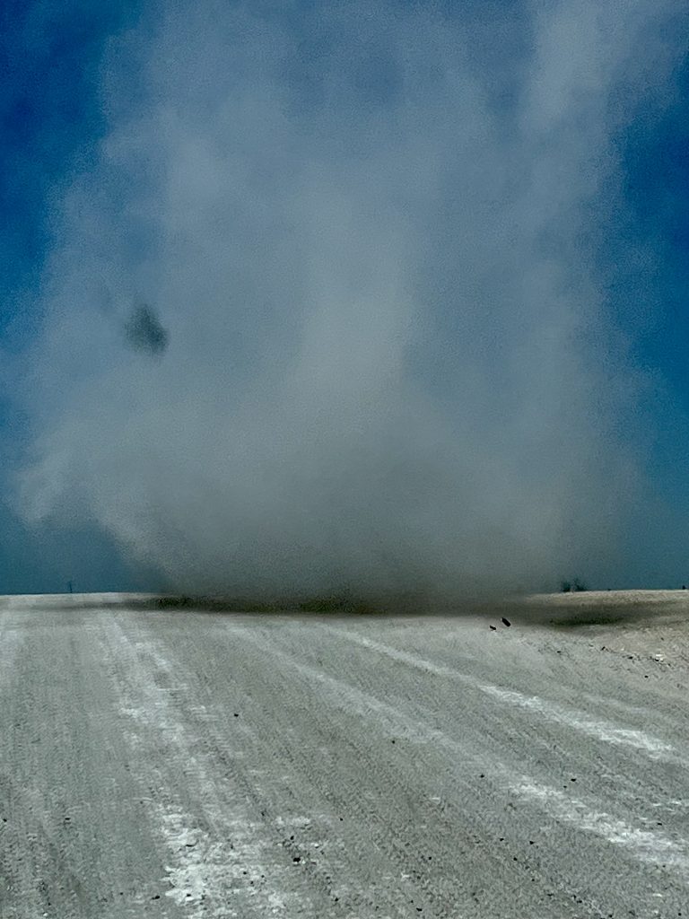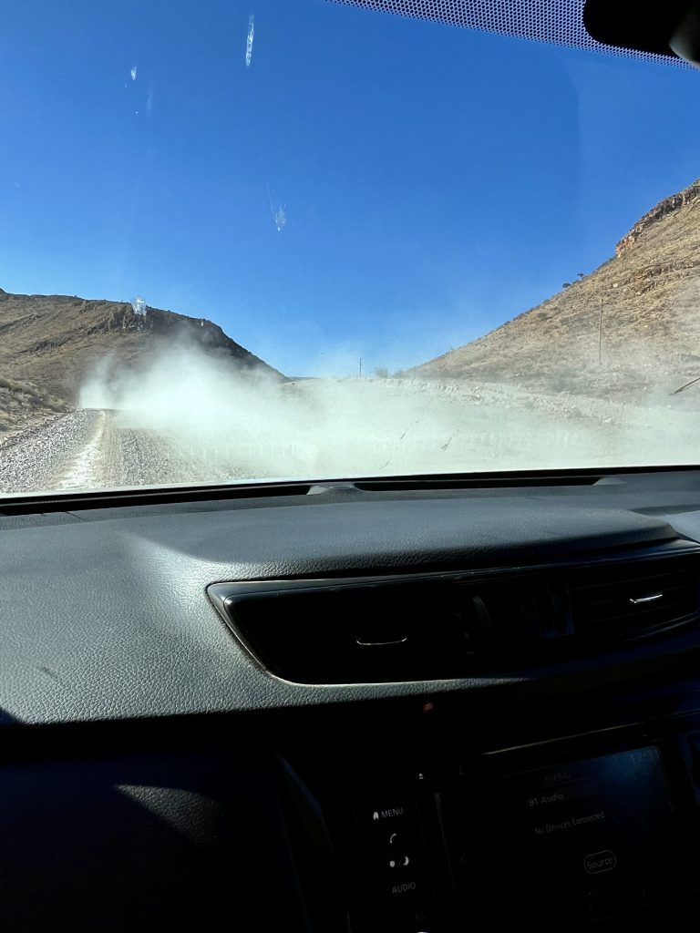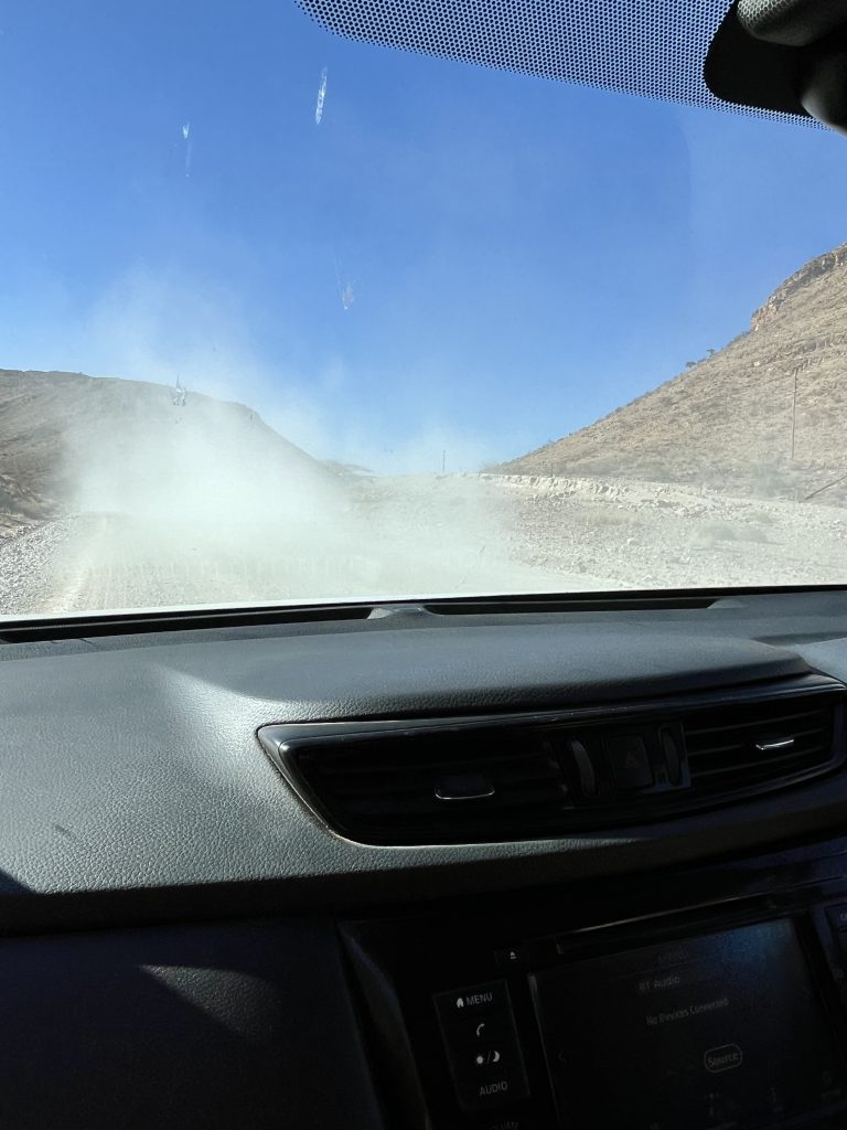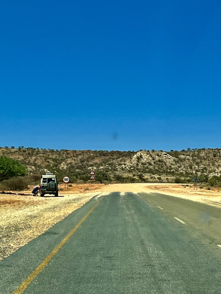 Hier der Übergang von Teer zu Schotter. So wird es mehr oder weniger auch die ganzen nächsten Tage weitergehen. Der Mensch da vorne, an seinem Auto, lässt Luft raus, um die Reifen auf die Belastung der Schotterstrecke vorzubereiten. Bei uns hat das bereits die Autovermietung erledigt. Wir können dann noch entscheiden, ob wir den Antrieb mit 2 oder 4 Rädern wollen, und das jeweils dazu schalten oder wegnehmen. Soweit so gut.