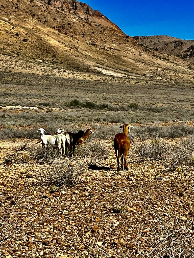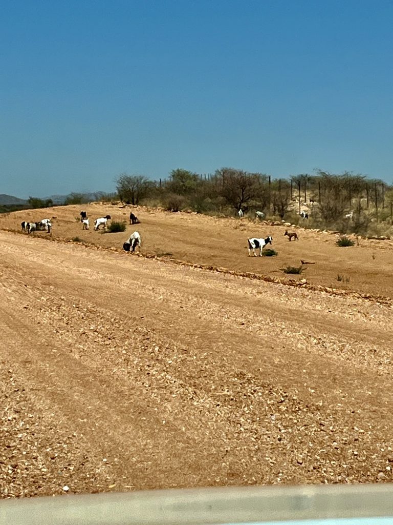 Ziegen weiden am Straßenrand. Okay, was eigentlich?? Ich sehe nichts als Sand und Steine. Ein kleiner Wildhund ist auch mit von der Partie. Wer entdeckt ihn?