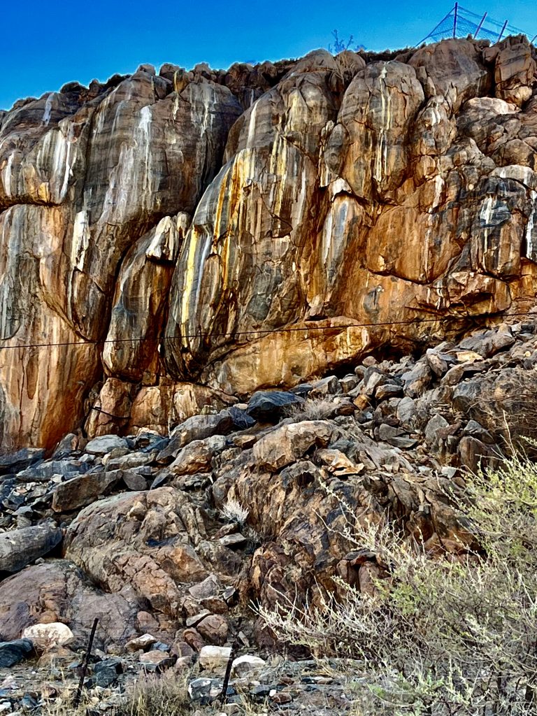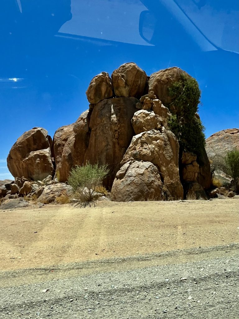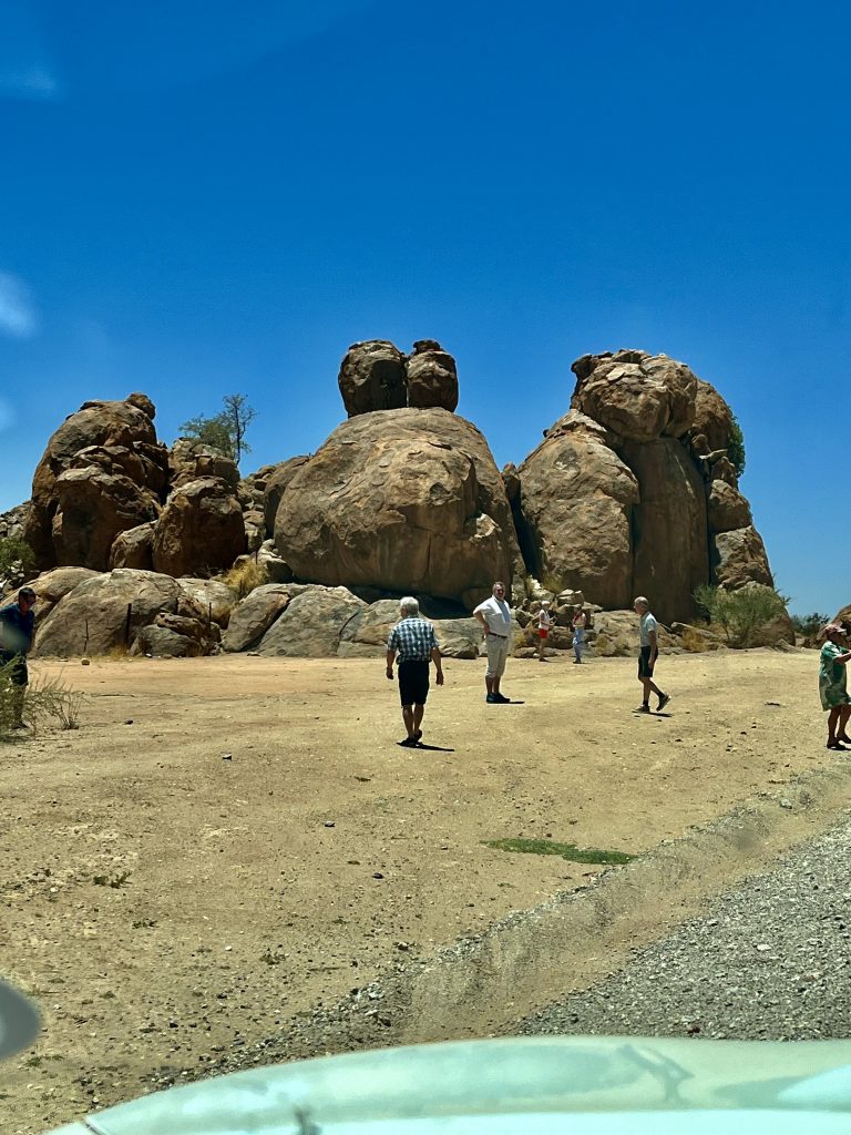 Wir entdecken lustig geformte Steinformationen. Jeder kann sich ausdenken, was er darin sehen mag. Die Busladung bestaunt sie nicht nur, sondern erleichtert sich auch hinter ihnen. ☹️