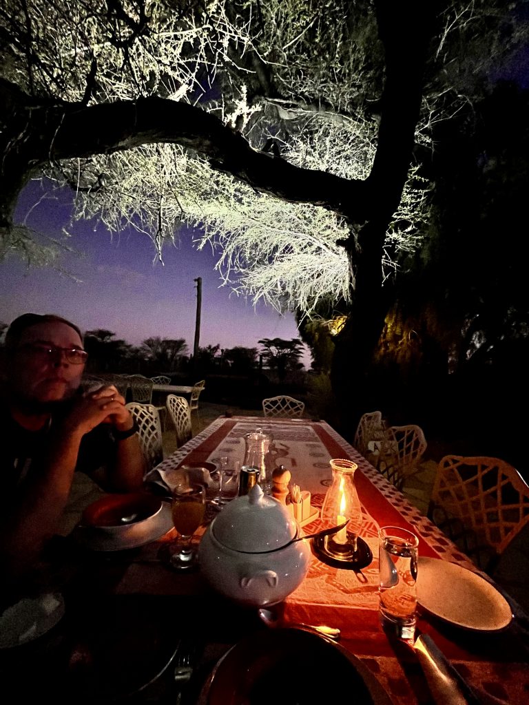 Wir speisen unterm illuminierten Baum und glitzerndem Sternenhimmel, werden nach Strich und Faden bedient und verwöhnt, und das Essen ist preisverdächtig! Alles ist hausgemacht und selbst angebaut oder gezüchtet oder gejagt. Das Brot, die Butter, der Yoghurt, das Gemüse, das Fleisch, einfach alles! Und das schmeckt man auch. Schon der Gemüseeintopf ist sensationell! Jeder Löffel schmeckt köstlich UND absolut gesund. Dazu selbst gebackenes Brot mit selbst gemachter Butter. Ich glaube, nach diesem Essen bin ich wieder gesund. Auch die Darreichung ist toll, wie bei Muttern, in der Suppenterrine. Wir fühlen uns sehr willkommen und zu Hause.