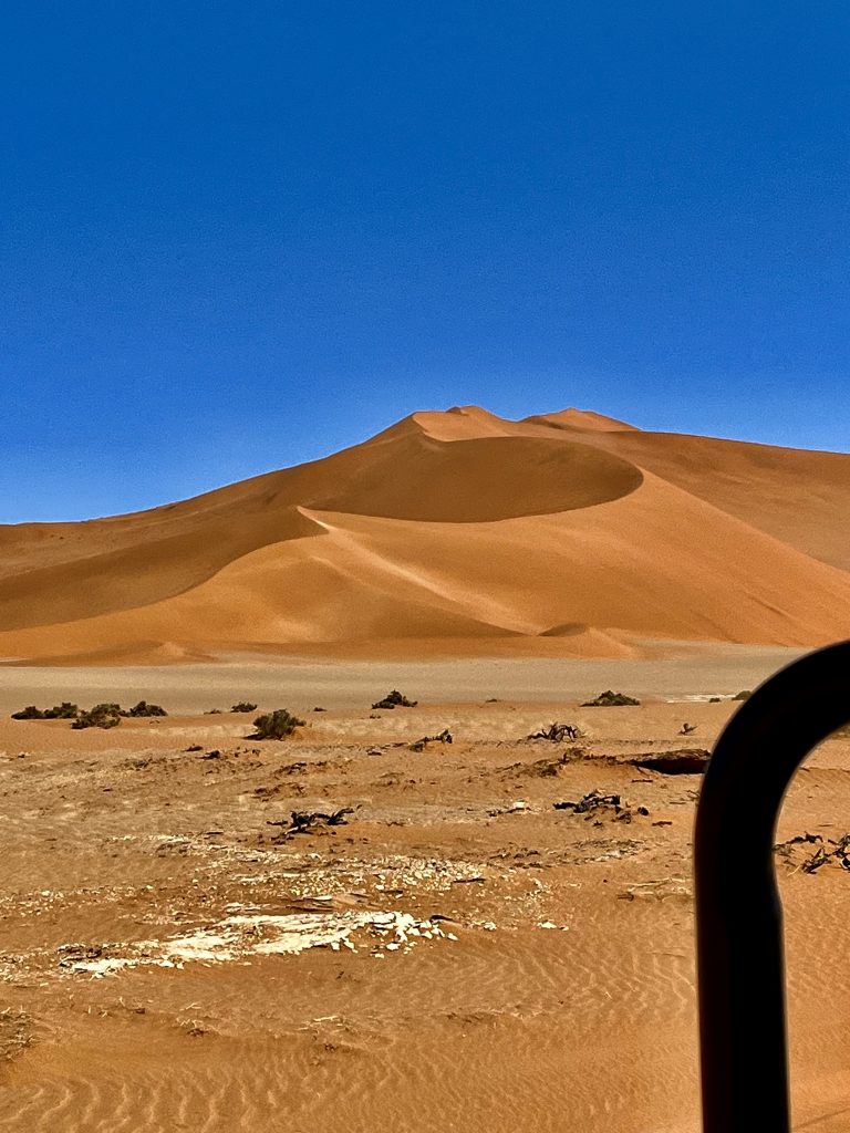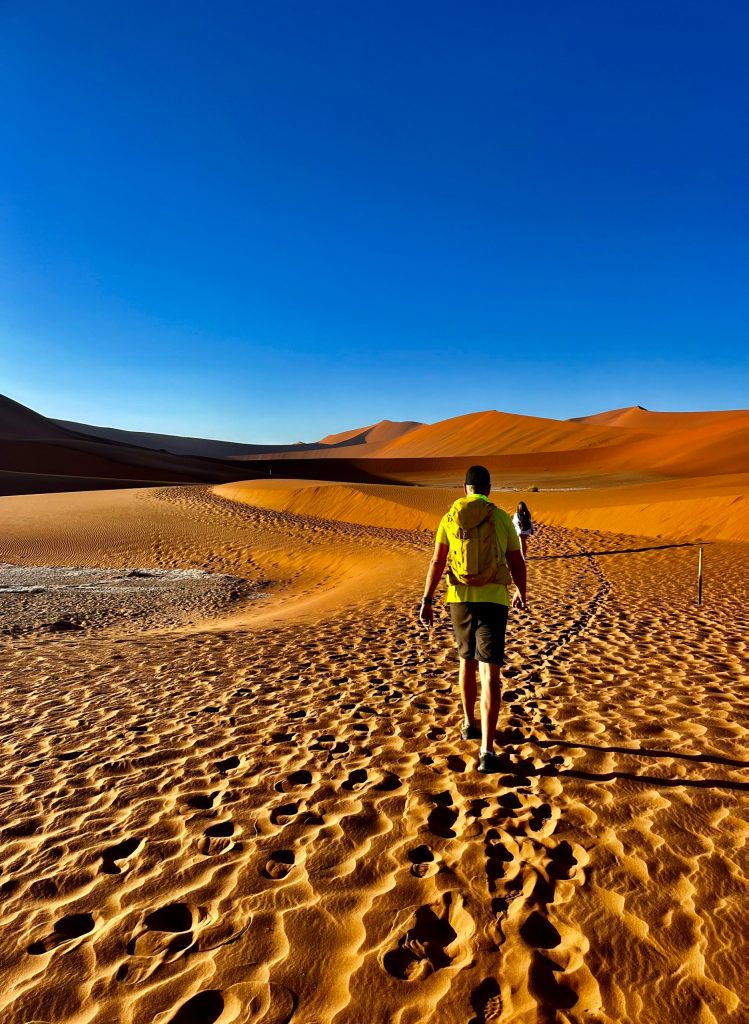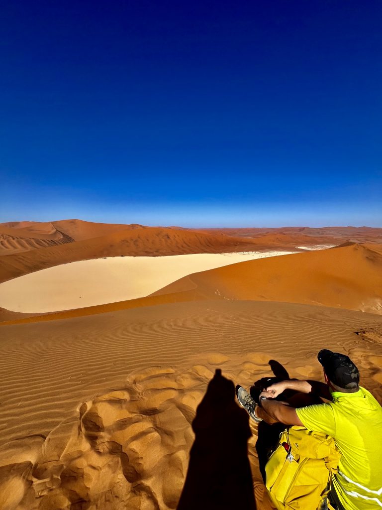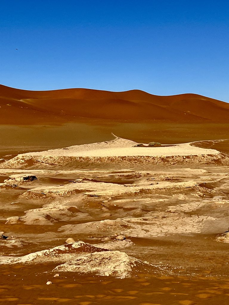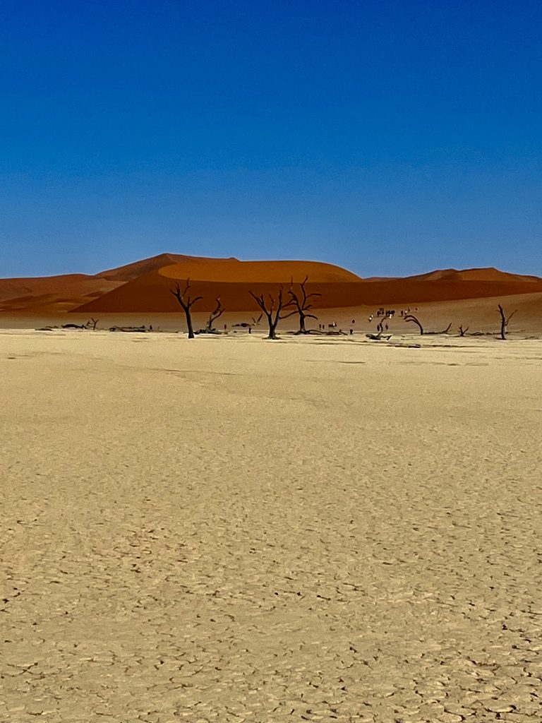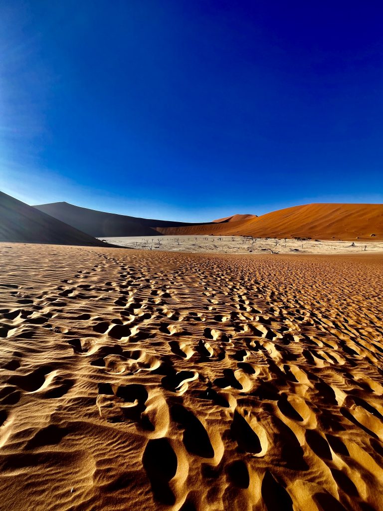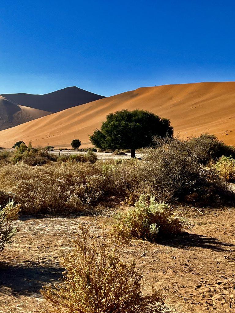 Der Dünensand leuchtet orange-rot, der Himmel azurblau, das sind tolle Farbkontraste im Morgenlicht❣️ Da, da, das Deadvlei ist schon erkennbar. 😃
