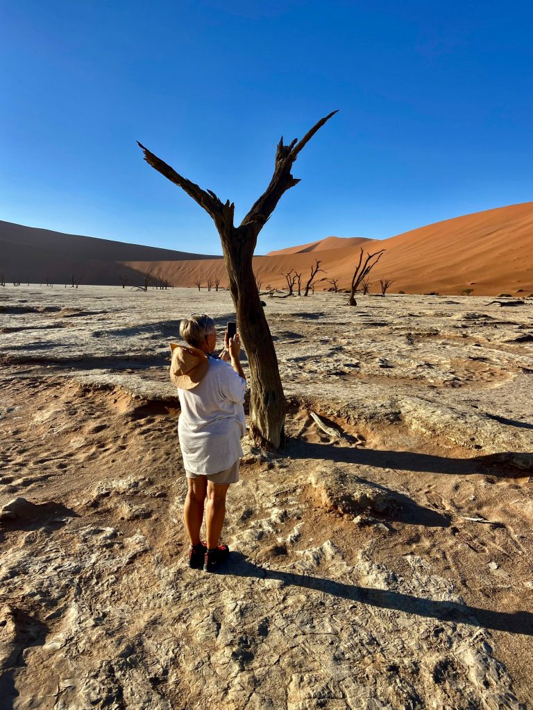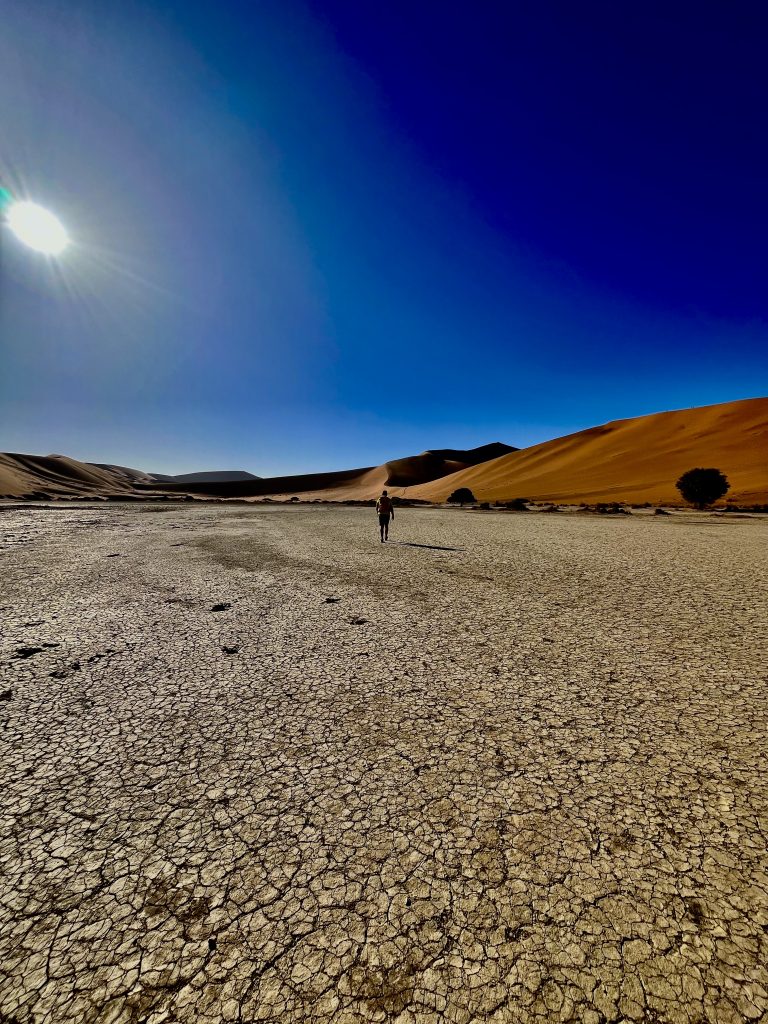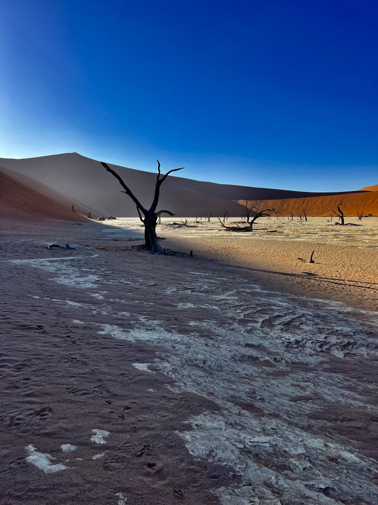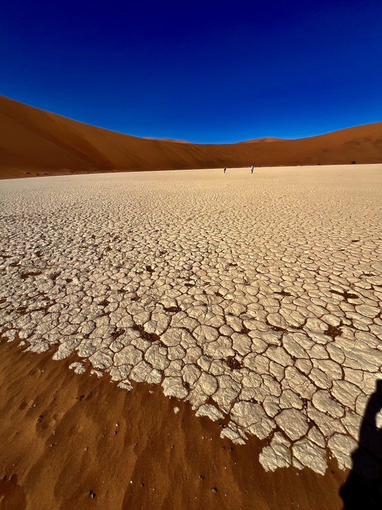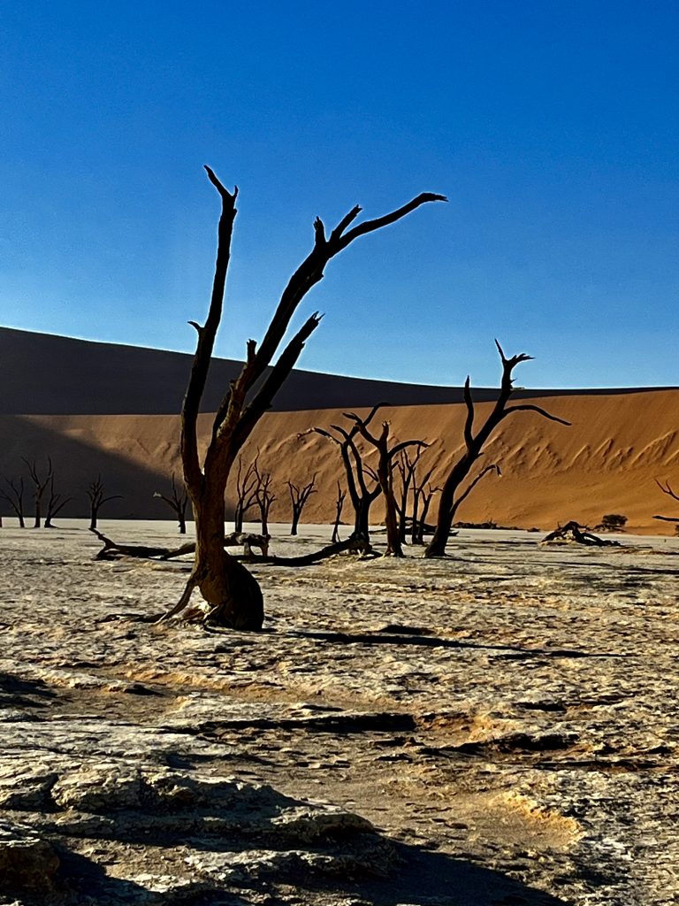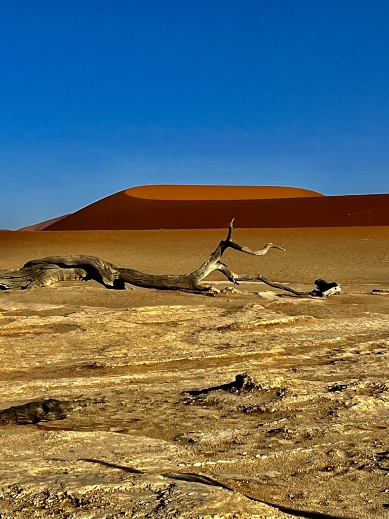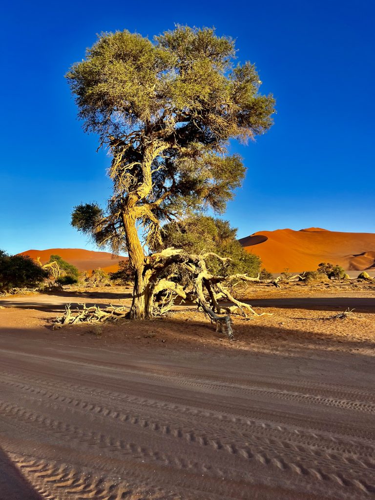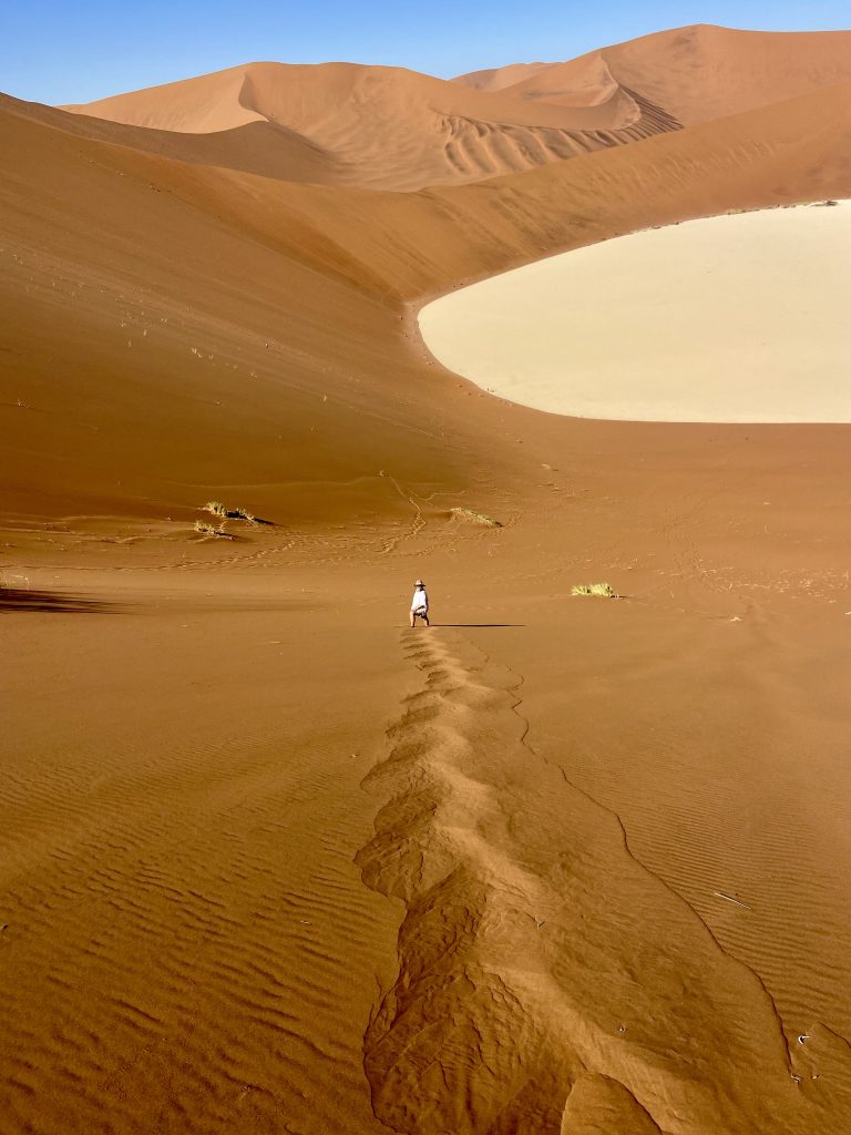 Der Dünensand leuchtet orange-rot, der Himmel azurblau, das sind tolle Farbkontraste im Morgenlicht❣️ Da, da, das Deadvlei ist schon erkennbar. 😃