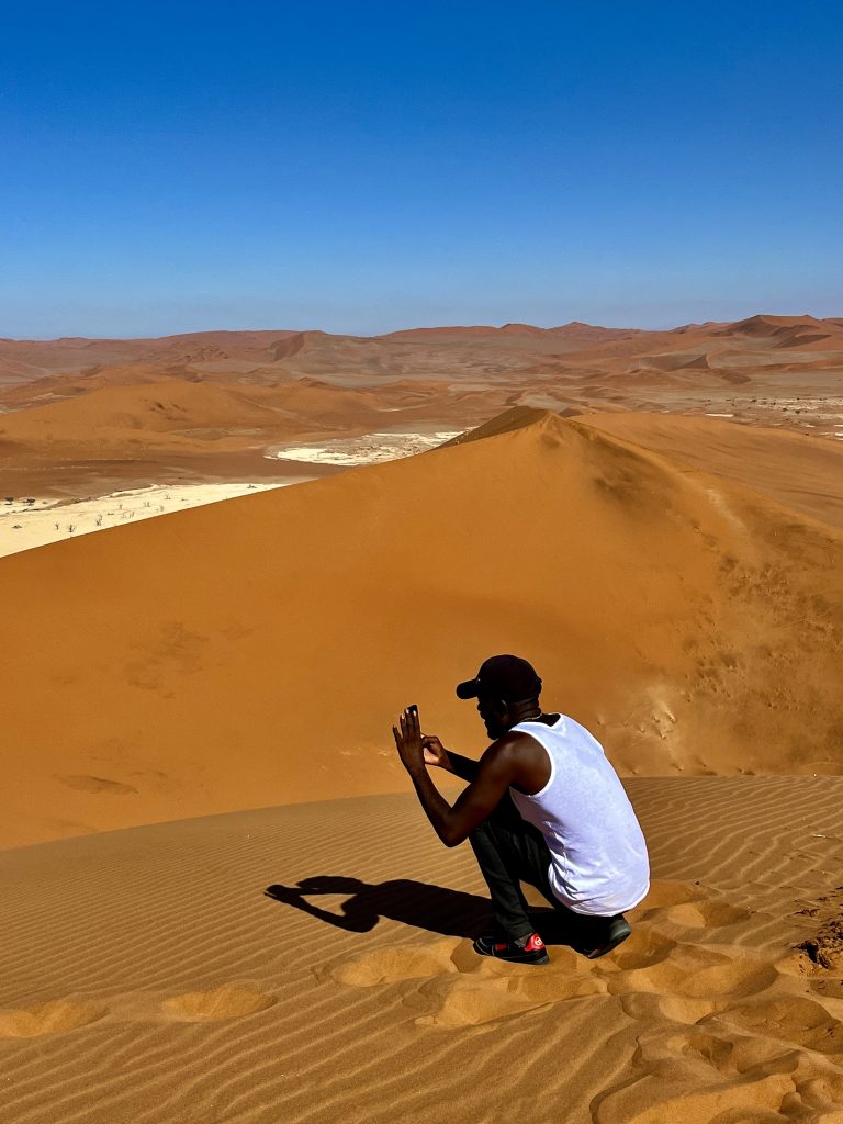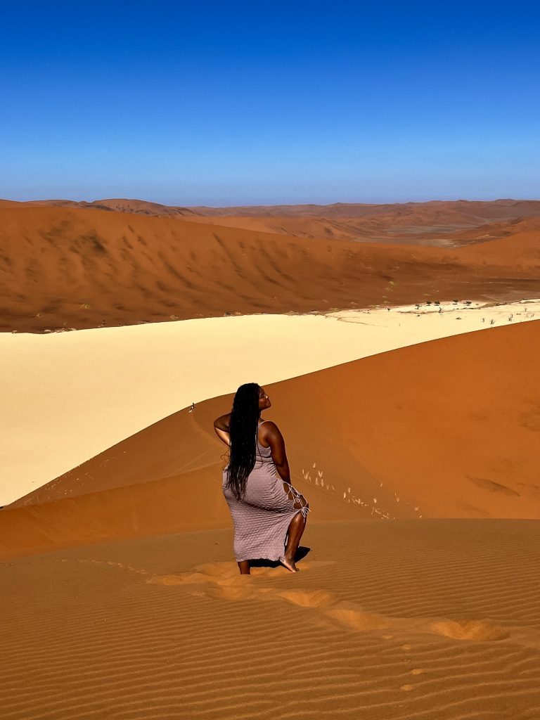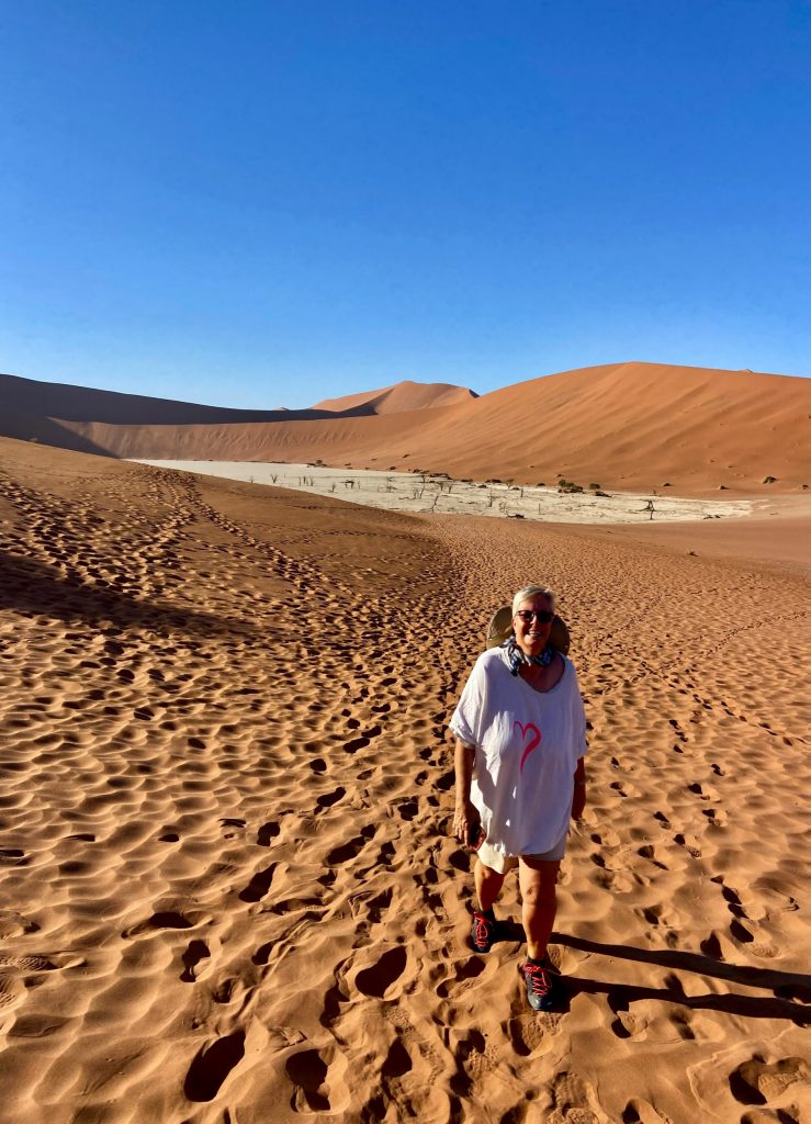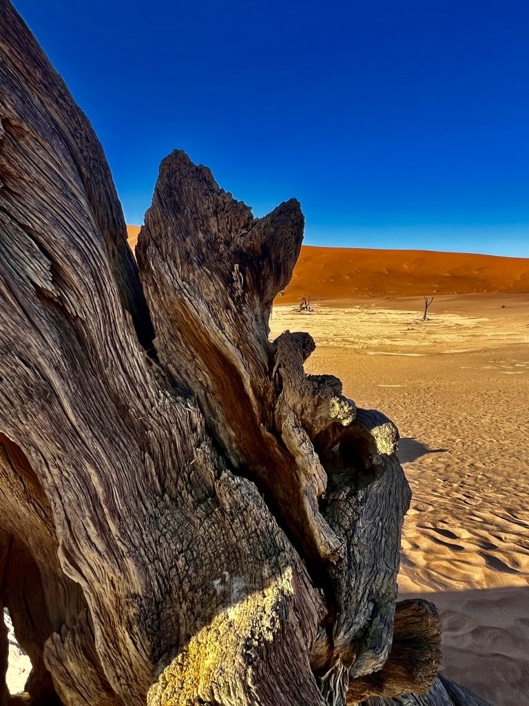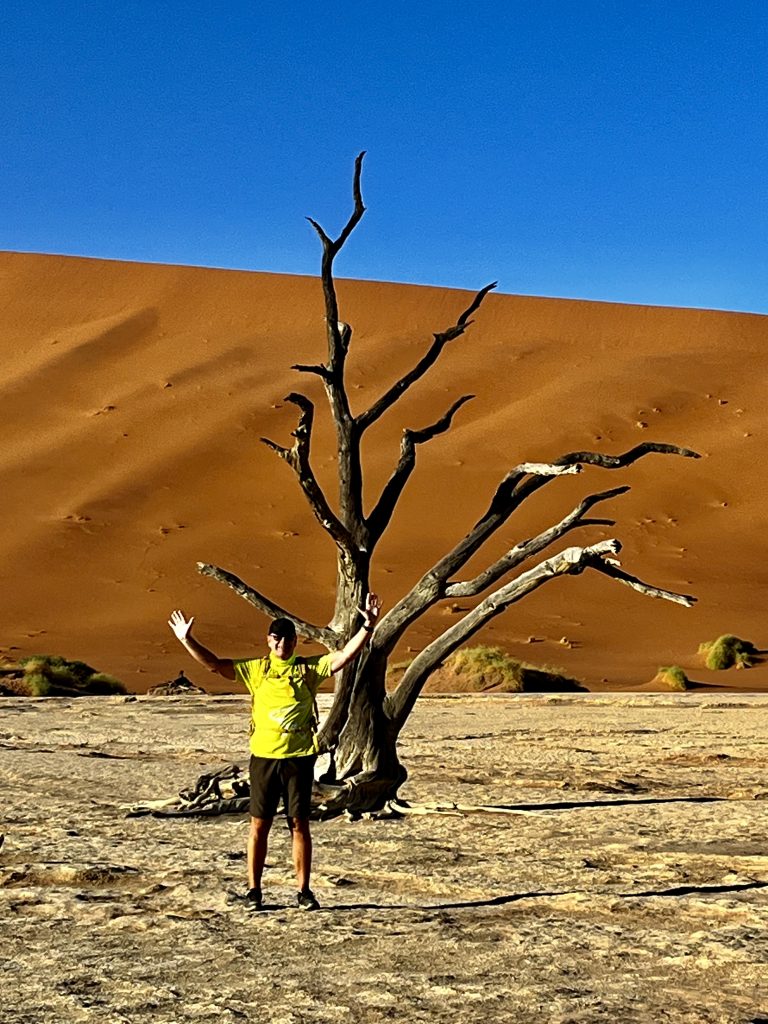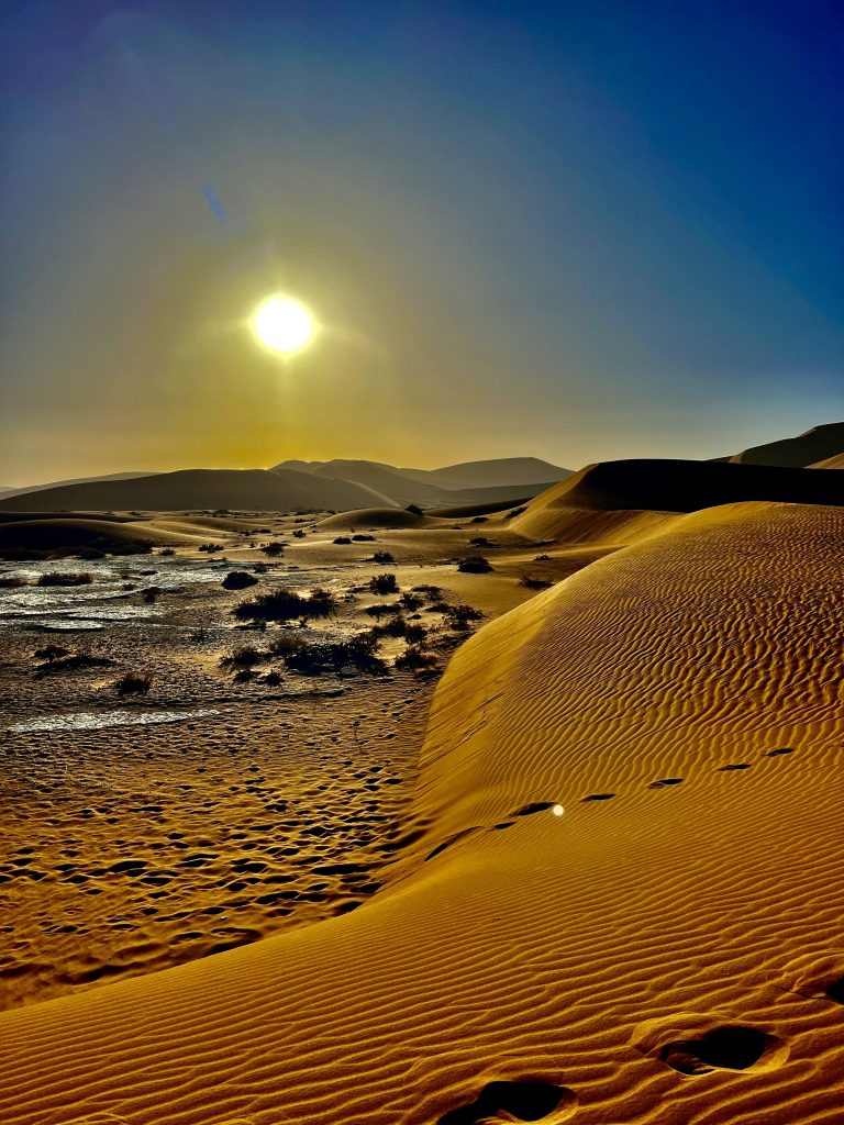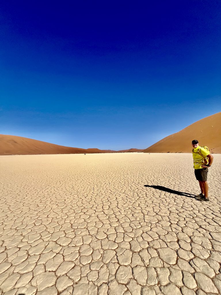 Der Dünensand leuchtet orange-rot, der Himmel azurblau, das sind tolle Farbkontraste im Morgenlicht❣️ Da, da, das Deadvlei ist schon erkennbar. 😃