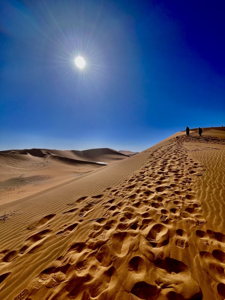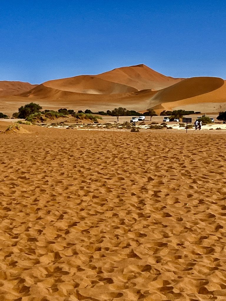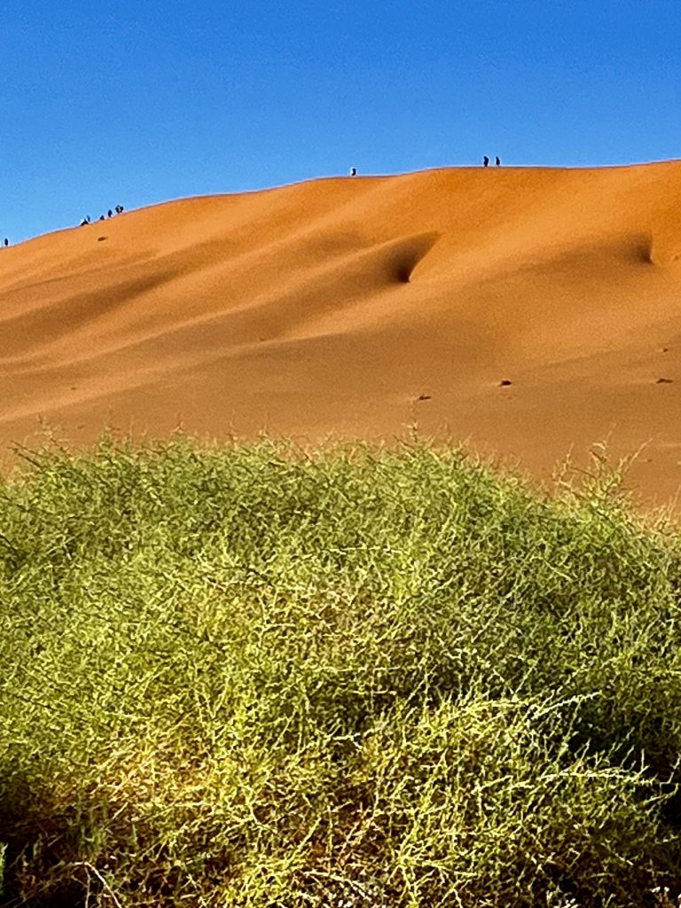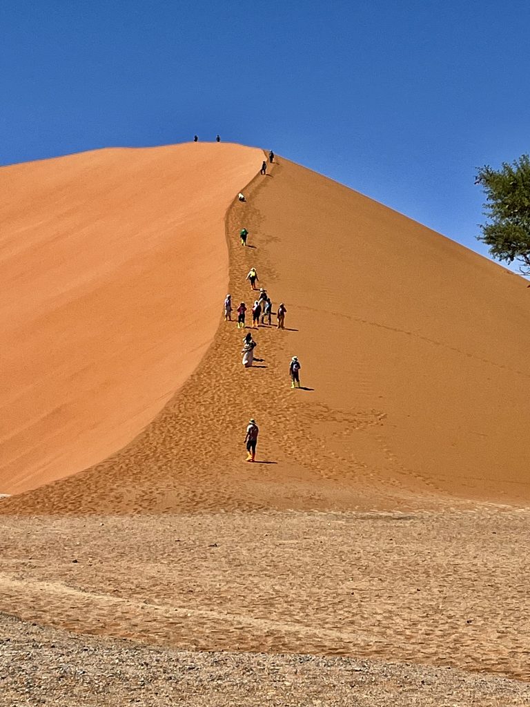 Wir sind zurück am Ausgangspunkt, doch wo ist unser Shuttle Fahrer? Weg! Was sollen wir jetzt machen ? Weiter links verläuft der Aufstieg zur Düne, und die Zeit tickert. Ach, da kommt gerade ein Shuttle Fahrer und bringt neue Touristen herbei. Den fragen wir mal. Ups, das ist ja unser Fahrer. Ja, wir sollen jetzt flott zu Big Daddy. Wir können aber hinten weiter hochsteigen, das wäre weniger kräftezehrend. Ja, er schätzt uns wohl richtig ein. 🥴 Nein, er kann uns nicht bis zur Düne fahren, das ist verboten. Ach, wir hatten ihn vorhin aber genau so verstanden… 😏. Na dann mal hurtig, es ist schon nach 9:00 Uhr! Komisch! Eigentlich war unser Plan, zu allererst die Daddy Düne rauf und dann von dort ins Deadvlei wieder runterzurutschen. Nun ist es schon ganz schön heiß und der Weg noch weit.