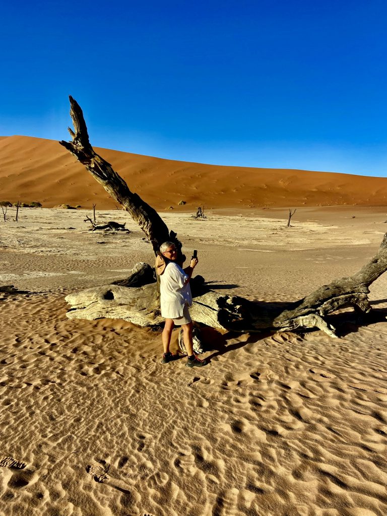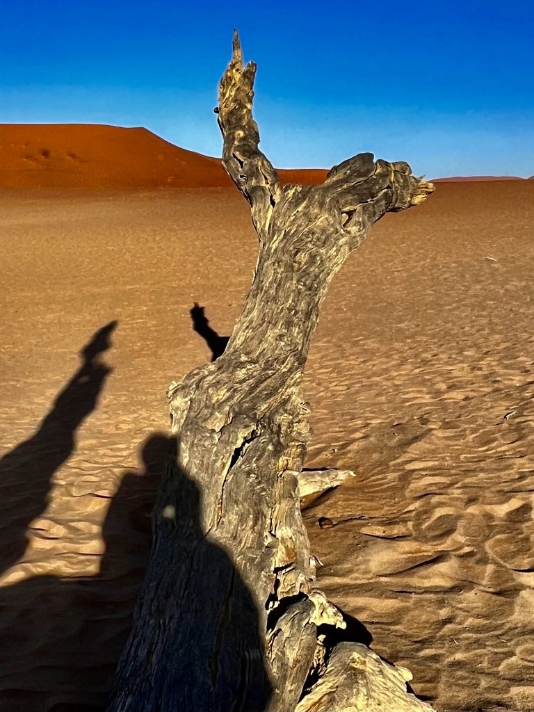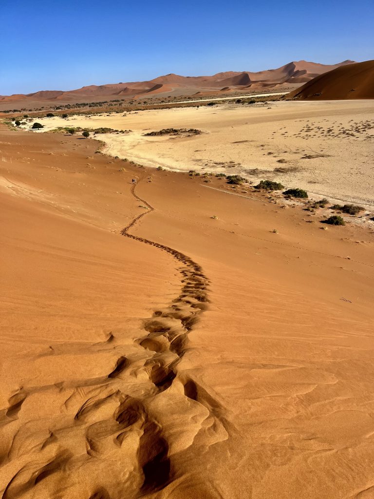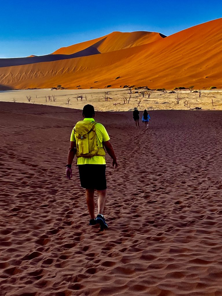 Wir sind zurück am Ausgangspunkt, doch wo ist unser Shuttle Fahrer? Weg! Was sollen wir jetzt machen ? Weiter links verläuft der Aufstieg zur Düne, und die Zeit tickert. Ach, da kommt gerade ein Shuttle Fahrer und bringt neue Touristen herbei. Den fragen wir mal. Ups, das ist ja unser Fahrer. Ja, wir sollen jetzt flott zu Big Daddy. Wir können aber hinten weiter hochsteigen, das wäre weniger kräftezehrend. Ja, er schätzt uns wohl richtig ein. 🥴 Nein, er kann uns nicht bis zur Düne fahren, das ist verboten. Ach, wir hatten ihn vorhin aber genau so verstanden… 😏. Na dann mal hurtig, es ist schon nach 9:00 Uhr! Komisch! Eigentlich war unser Plan, zu allererst die Daddy Düne rauf und dann von dort ins Deadvlei wieder runterzurutschen. Nun ist es schon ganz schön heiß und der Weg noch weit.