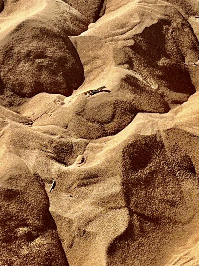 Da, eine kleine Echse. 🦎 Sie saust nur so über den sich erwärmenden Sand und ist fast weiß, um möglichst viel Wärmestrahlung zu reflektieren. Ganz anders als der Tautrinker…