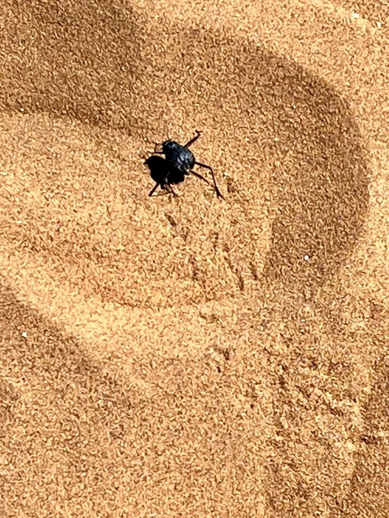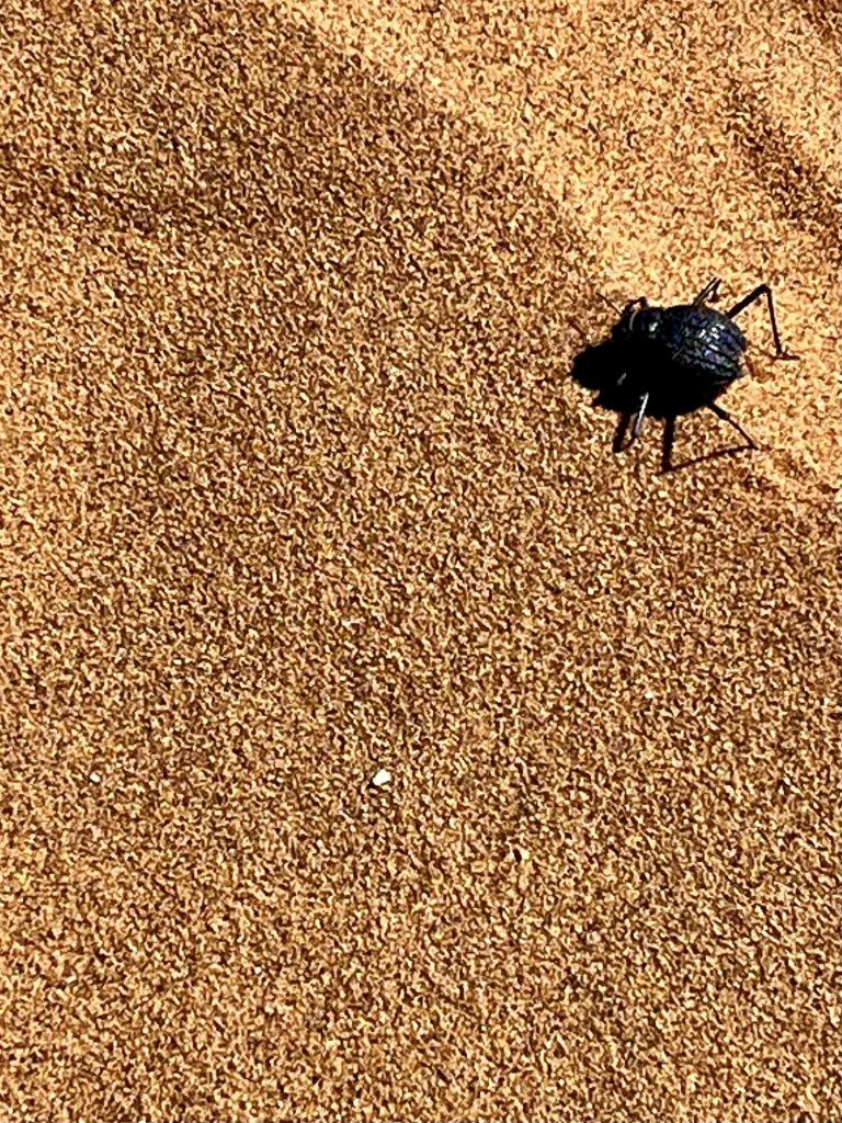 Darf ich vorstellen? Der Nebeltrinker-Käfer. Er ist flink, liebt lockeren Sand, um sich bei Gefahr schnell in ihm zu vergraben. Im Morgentau hebt er den Popo hoch, so dass das Tauwasser auf seinem Panzer kondensiert, und ihm geradewegs ins Mäulchen läuft. Tricky❣️ Und was soll man machen, wenn man in der Namib in Wassernot gerät? Genau! Diese Käfer sammeln und zerkauen. Sie sind in der Regel gut mit Wasser gefüllt. 😝