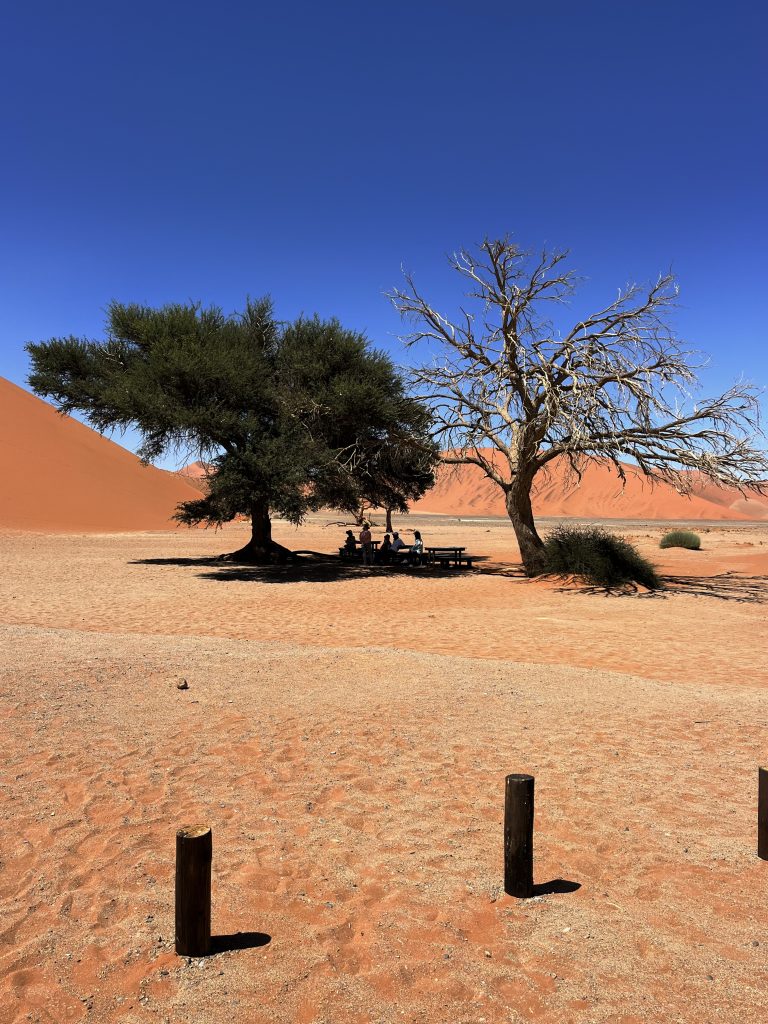 Wir sind nicht die einzigen! Neben vielen Touristen, gibt es noch viel mehr lästige Fliegen 🪰🪰🪰🪰🪰🪰🪰🪰, und wir ergreifen die Flucht. Wieder im Auto düsen wir die 60 Kilometer zum Parkausgang zurück, halten aber noch bei den Dünen 45 und 40.