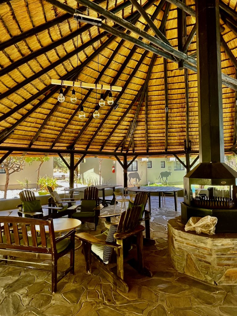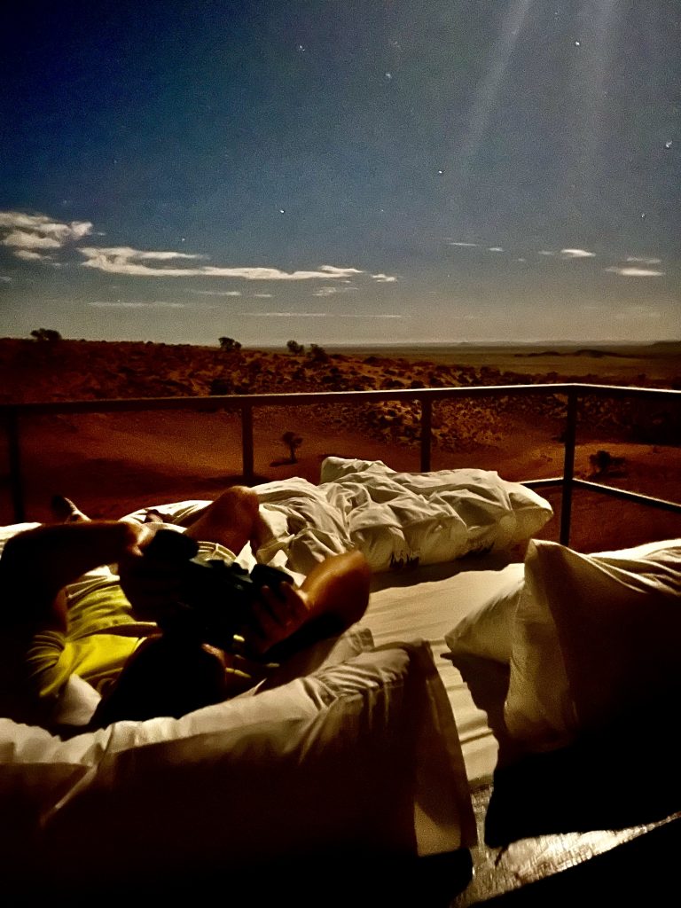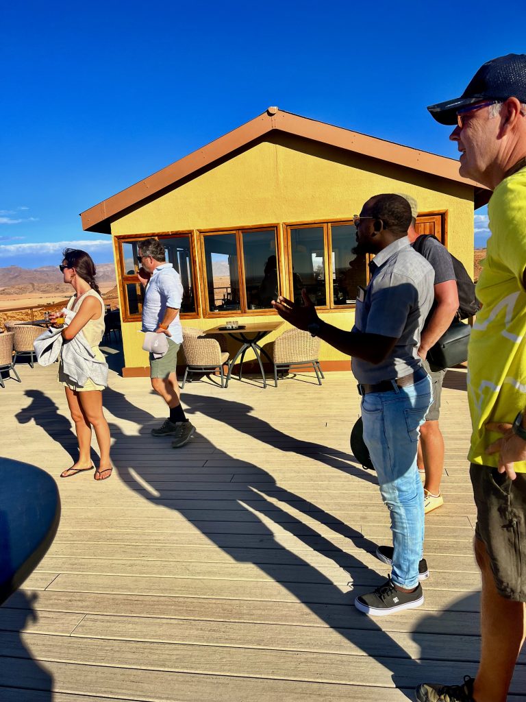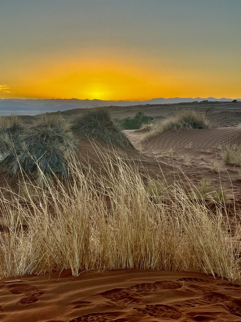 Da ruft uns jemand laut und deutlich zum Abendessen. Die Köchin hat nun das Sagen. Sie fragt ab, wer Fleisch oder Hühnchen haben möchte? Alle wollen Fleisch 🥩 ! Mit kräftiger Stimme und gestrengem Ton führt sie ihr Regiment. Wieder einmal eine echte Big Mama.👩🏿🍳 Gemütlich sitzen wir an schön eingedeckten Holztischen und die Suppe wird aufgetragen. Mmmm, lecker! Wir sitzen mit dem französischen Paar am Tisch. Schnell stellt sich raus, sie, Sophie Breton, ist Travel Blogger und Influenceur. Dolle Sache! Berufe von heute… Sie und ihr Partner reisen fast non stop in der Weltgeschichte herum und betreiben nebenbei noch ein kleines Reisebüro in Paris. Nach Namibia geht’s nach Wien…Sehr kontrastreich! Ihr Leben befindet sich auf der Überholspur. Sie hetzen von Ort zu Ort, und kamen deshalb auch so spät zum Transfer hier her, weil sie zuvor noch in der Namib waren. Am Nachmittag! 🥵 Mit Flip Flops und Turnschuhen. Sie brach den Gang ins Deadvlei ab, zu heiß wurden ihre Füße. Er hielt durch, verlor jedoch seine Turnschuhsohlen, der Kleber schmolz dahin 😳…