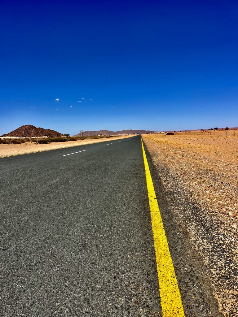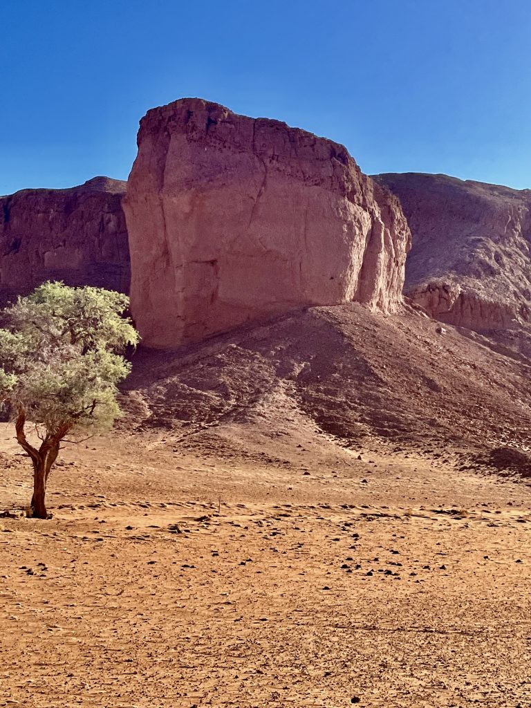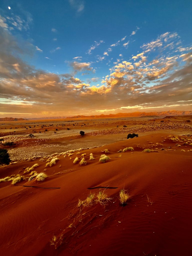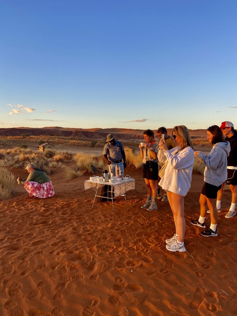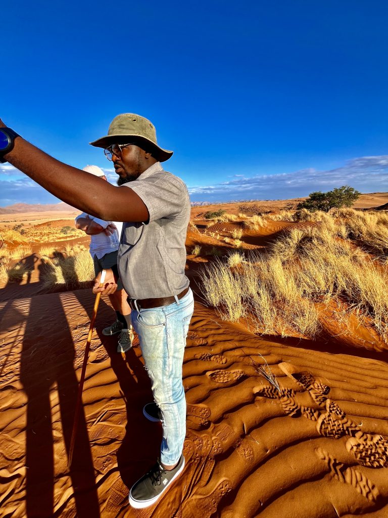 Da ruft uns jemand laut und deutlich zum Abendessen. Die Köchin hat nun das Sagen. Sie fragt ab, wer Fleisch oder Hühnchen haben möchte? Alle wollen Fleisch 🥩 ! Mit kräftiger Stimme und gestrengem Ton führt sie ihr Regiment. Wieder einmal eine echte Big Mama.👩🏿🍳 Gemütlich sitzen wir an schön eingedeckten Holztischen und die Suppe wird aufgetragen. Mmmm, lecker! Wir sitzen mit dem französischen Paar am Tisch. Schnell stellt sich raus, sie, Sophie Breton, ist Travel Blogger und Influenceur. Dolle Sache! Berufe von heute… Sie und ihr Partner reisen fast non stop in der Weltgeschichte herum und betreiben nebenbei noch ein kleines Reisebüro in Paris. Nach Namibia geht’s nach Wien…Sehr kontrastreich! Ihr Leben befindet sich auf der Überholspur. Sie hetzen von Ort zu Ort, und kamen deshalb auch so spät zum Transfer hier her, weil sie zuvor noch in der Namib waren. Am Nachmittag! 🥵 Mit Flip Flops und Turnschuhen. Sie brach den Gang ins Deadvlei ab, zu heiß wurden ihre Füße. Er hielt durch, verlor jedoch seine Turnschuhsohlen, der Kleber schmolz dahin 😳…