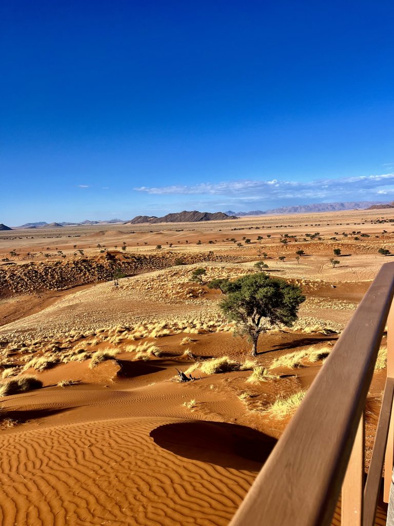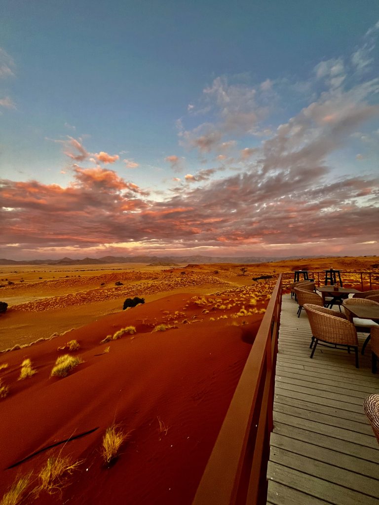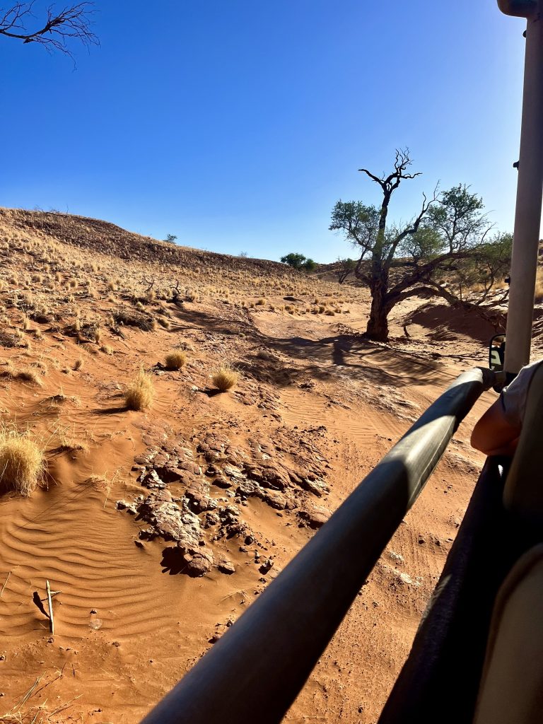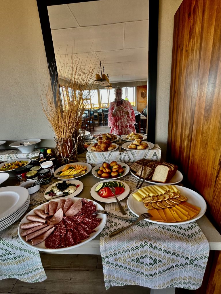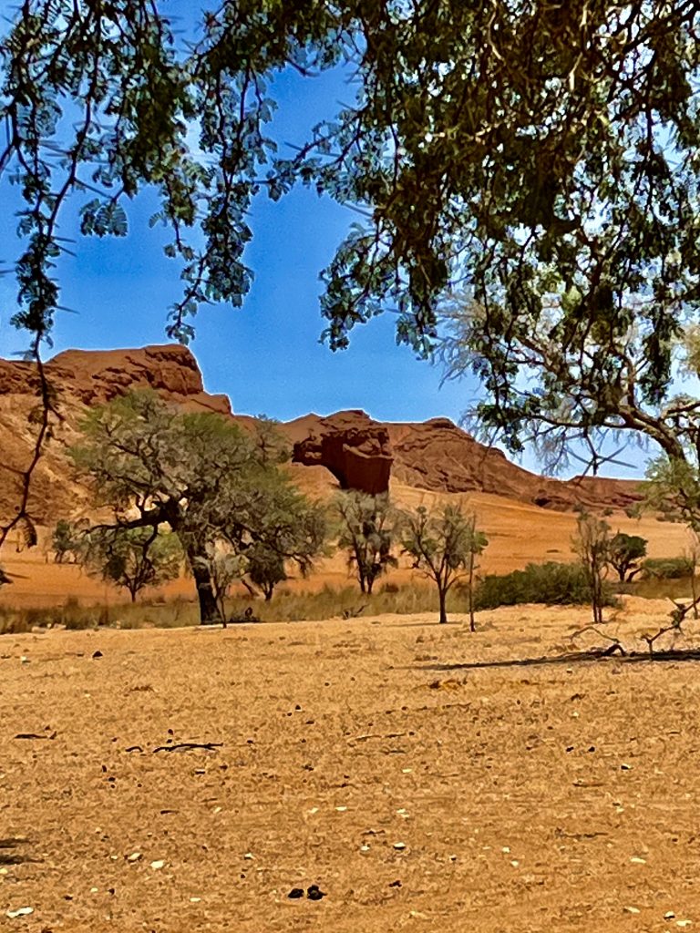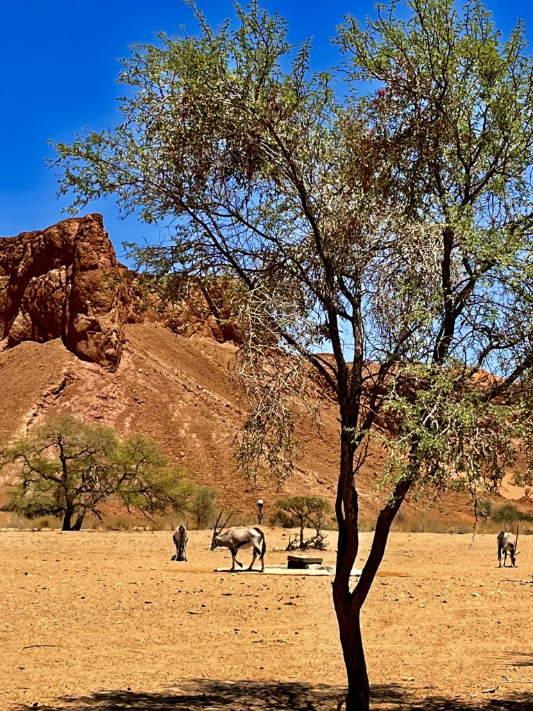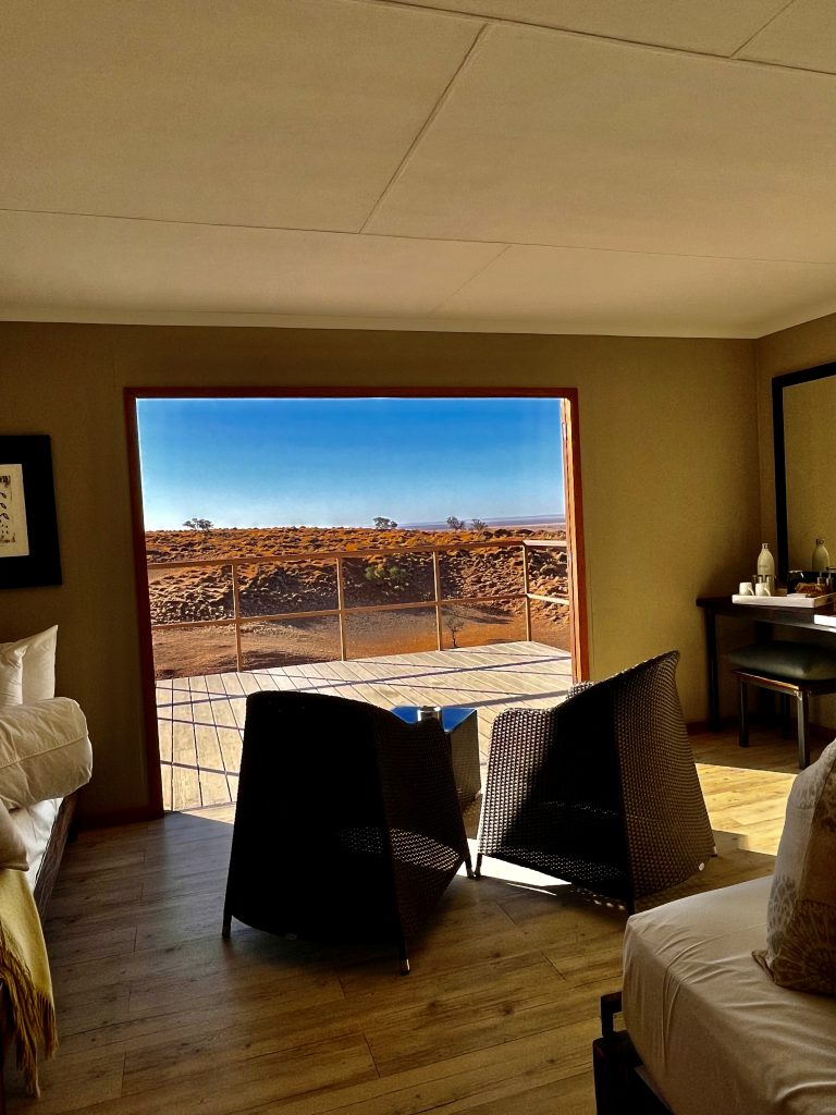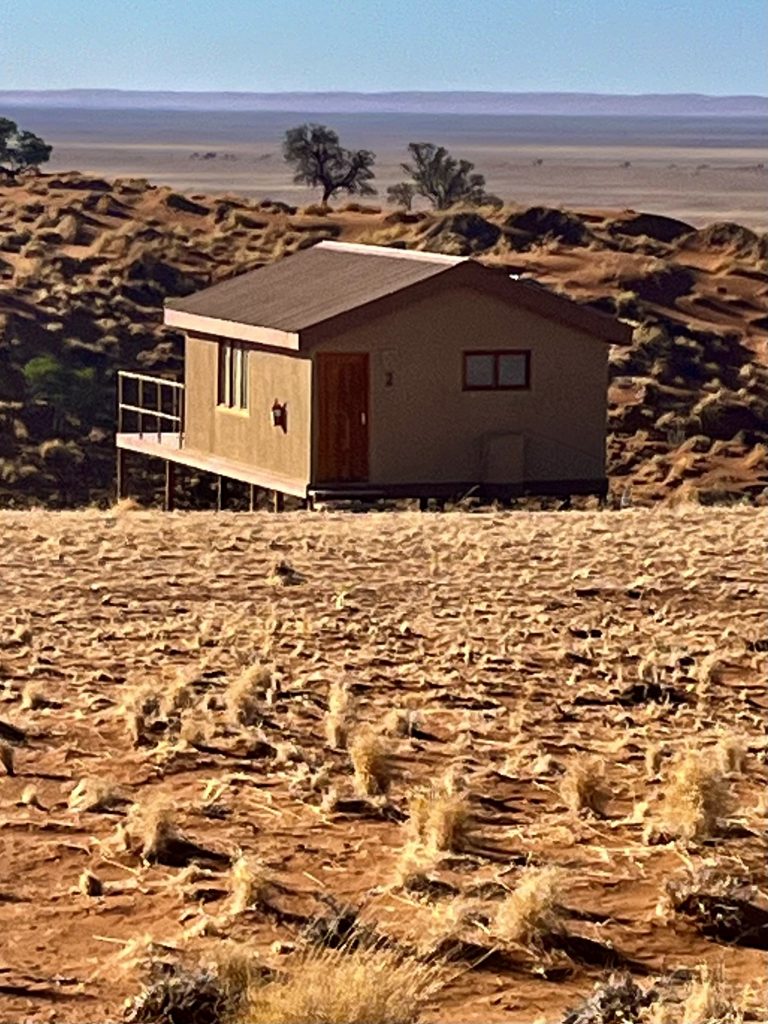 Heute können wir mal ganz in Ruhe frühstücken und müssen nicht schon in aller Herrgottsfrühe aufstehen. Auch mal ganz nett! Aber um 10:00 Uhr müssen wir dennoch unser Zelthaus geräumt haben. Heute ist die Frühstücksterrasse aber leer. Ach, der Bus mit den österreichischen Gemüsebauern ist abgefahren. Das war lustig. Mindestens 30 Gemüselandwirtsehepaare 🧑🌾👩🌾waren hier eingekehrt, um eben auch die Wüste zu erkunden. Einer meinte, sie könnten ja nur in dieser Jahreszeit reisen, wo es zu Hause nichts Wichtiges zu tun gäbe. Stimmt! Wir lassen es uns erstmal schmecken, packen dann unsere sieben Sachen zusammen und machen uns auf den nicht so langen Weg zur Namibia Desert Lodge, von der wir dann weiter zum Dune Star Camp gebracht werden.