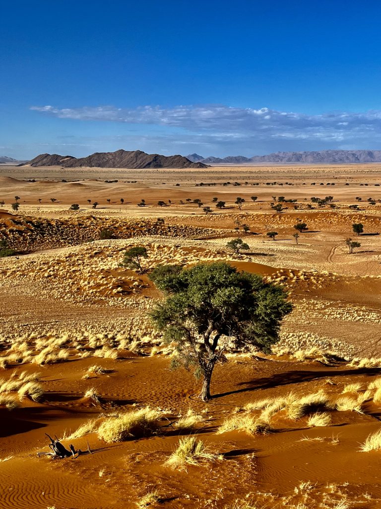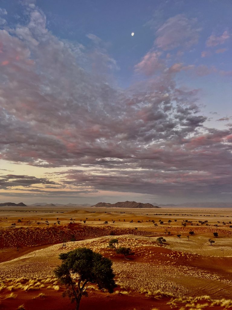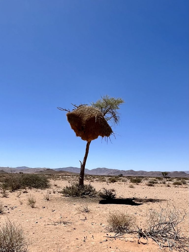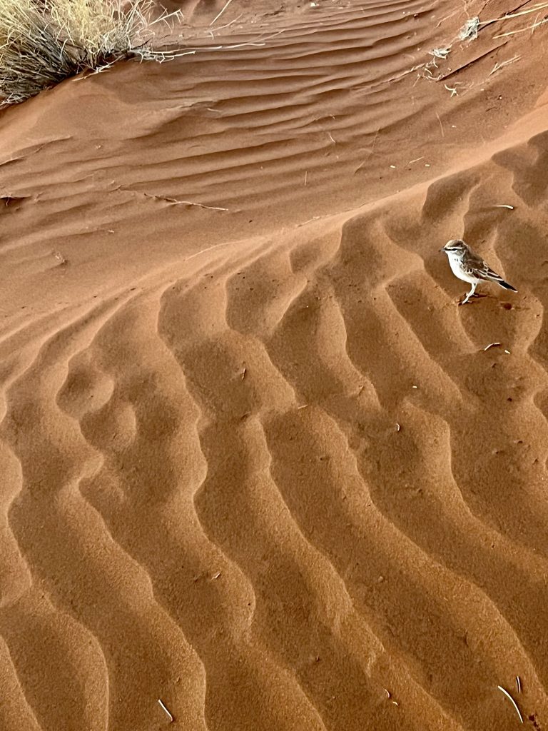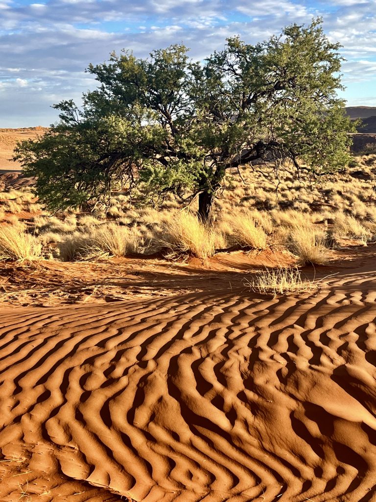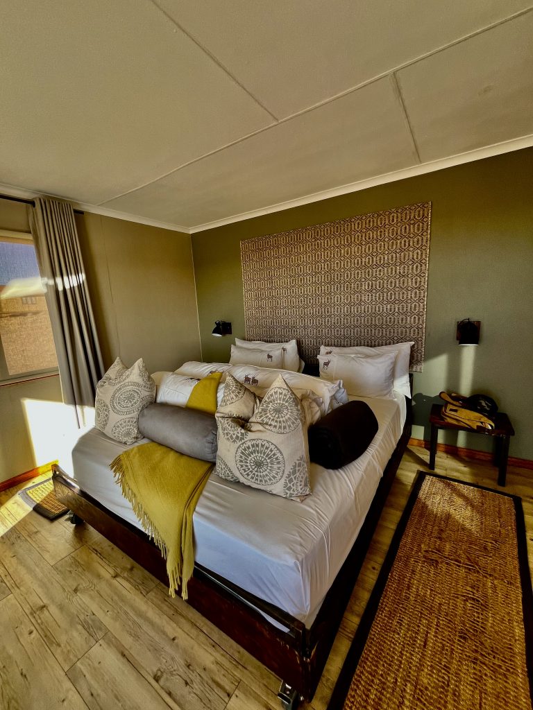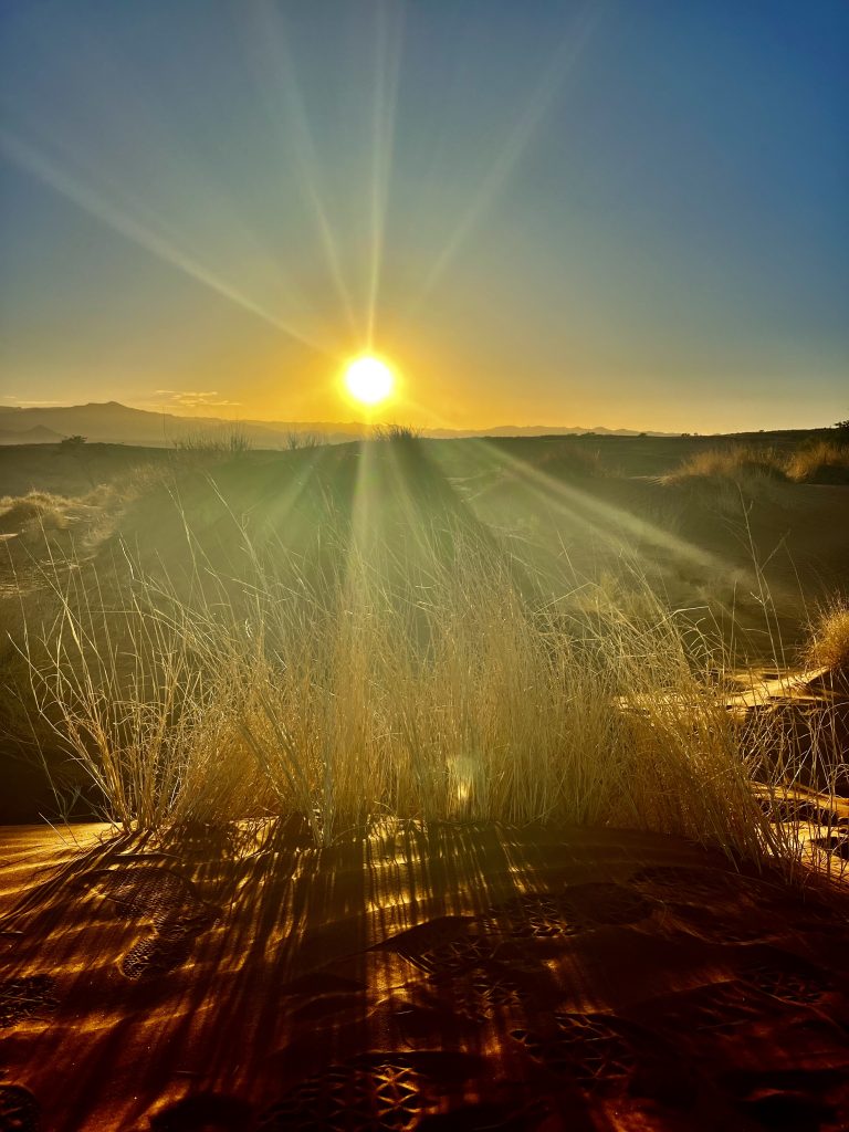 Heute können wir mal ganz in Ruhe frühstücken und müssen nicht schon in aller Herrgottsfrühe aufstehen. Auch mal ganz nett! Aber um 10:00 Uhr müssen wir dennoch unser Zelthaus geräumt haben. Heute ist die Frühstücksterrasse aber leer. Ach, der Bus mit den österreichischen Gemüsebauern ist abgefahren. Das war lustig. Mindestens 30 Gemüselandwirtsehepaare 🧑🌾👩🌾waren hier eingekehrt, um eben auch die Wüste zu erkunden. Einer meinte, sie könnten ja nur in dieser Jahreszeit reisen, wo es zu Hause nichts Wichtiges zu tun gäbe. Stimmt! Wir lassen es uns erstmal schmecken, packen dann unsere sieben Sachen zusammen und machen uns auf den nicht so langen Weg zur Namibia Desert Lodge, von der wir dann weiter zum Dune Star Camp gebracht werden.
