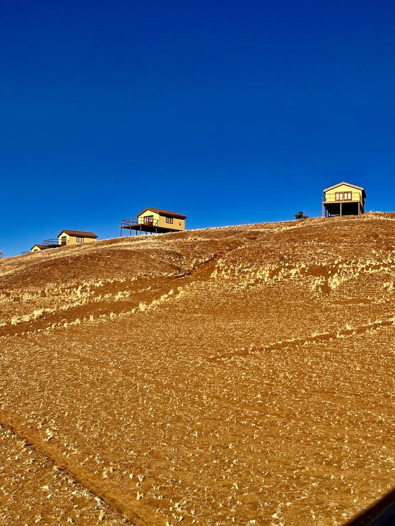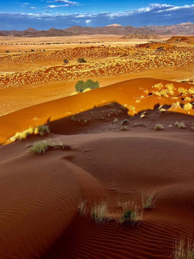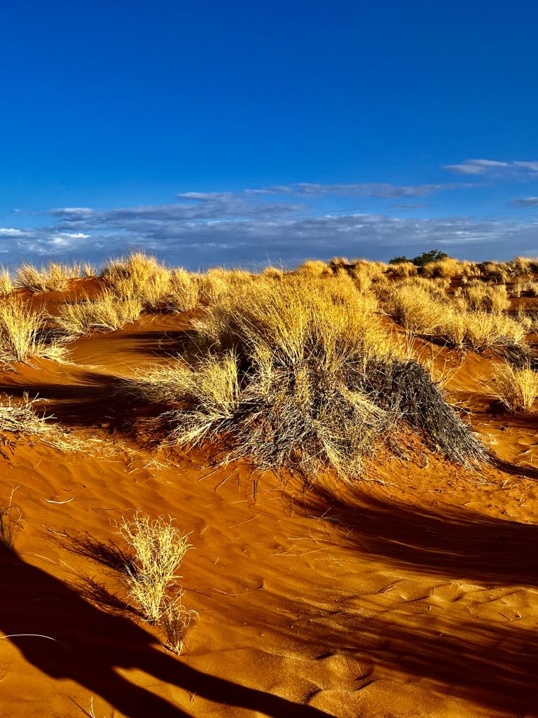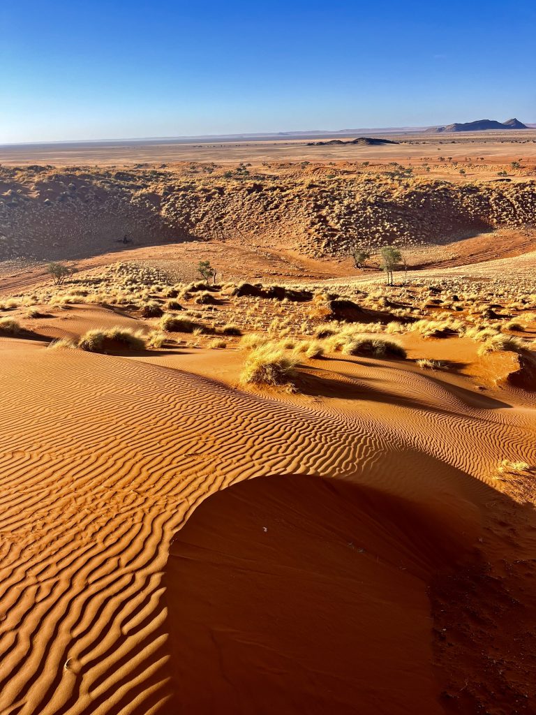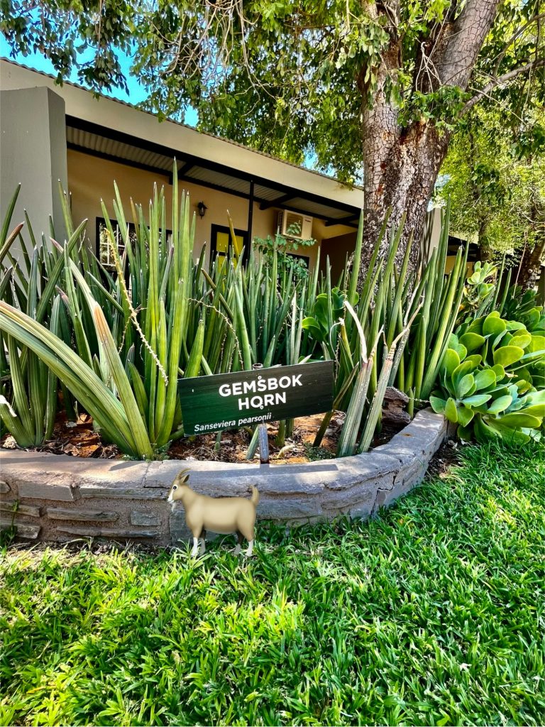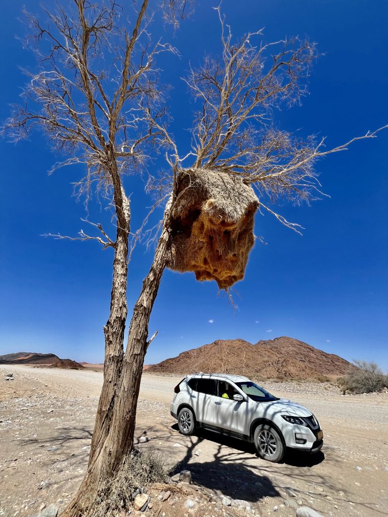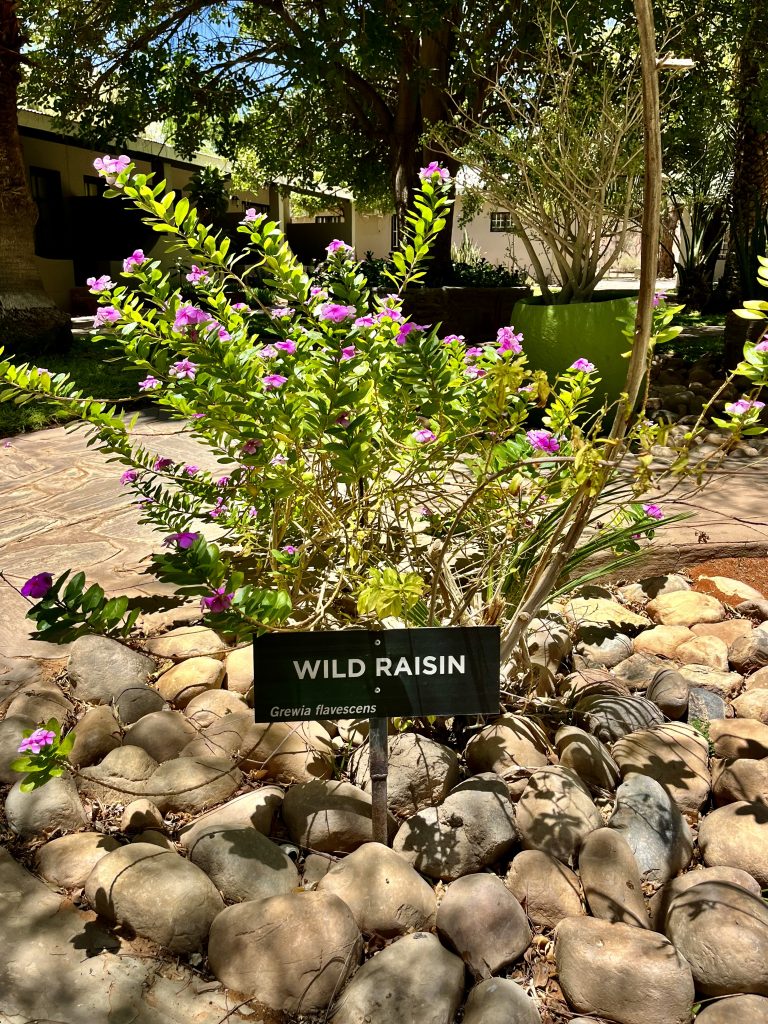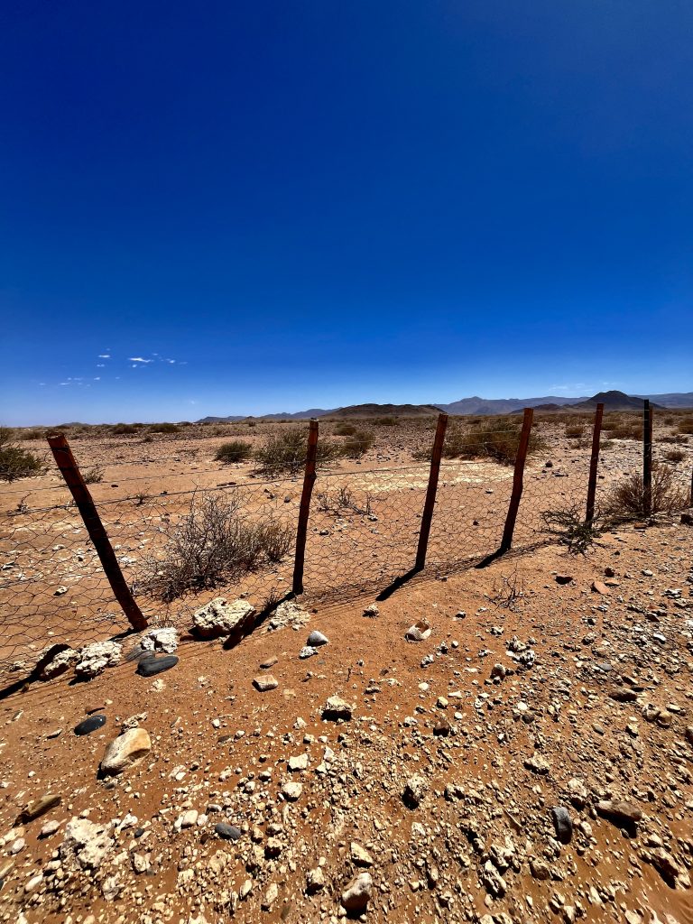 Heute können wir mal ganz in Ruhe frühstücken und müssen nicht schon in aller Herrgottsfrühe aufstehen. Auch mal ganz nett! Aber um 10:00 Uhr müssen wir dennoch unser Zelthaus geräumt haben. Heute ist die Frühstücksterrasse aber leer. Ach, der Bus mit den österreichischen Gemüsebauern ist abgefahren. Das war lustig. Mindestens 30 Gemüselandwirtsehepaare 🧑🌾👩🌾waren hier eingekehrt, um eben auch die Wüste zu erkunden. Einer meinte, sie könnten ja nur in dieser Jahreszeit reisen, wo es zu Hause nichts Wichtiges zu tun gäbe. Stimmt! Wir lassen es uns erstmal schmecken, packen dann unsere sieben Sachen zusammen und machen uns auf den nicht so langen Weg zur Namibia Desert Lodge, von der wir dann weiter zum Dune Star Camp gebracht werden.