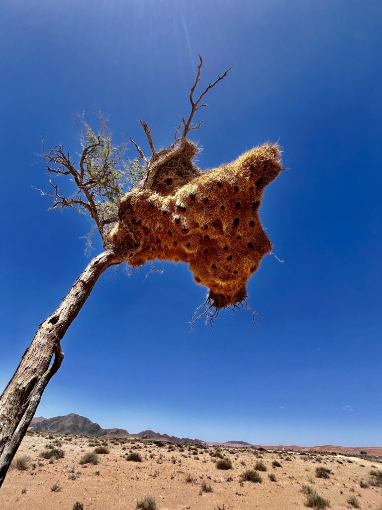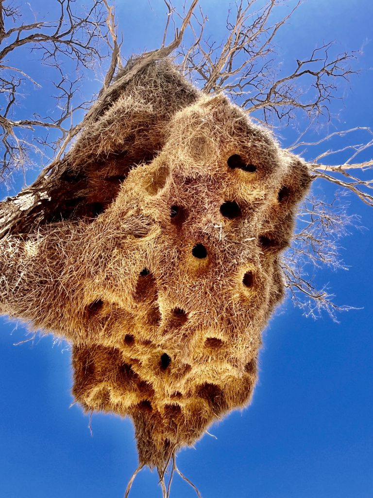Jeder hat seinen eigenen Eingang, und wie finden sie die richtige Öffnung? Bei den Webervögeln bauen die Männchen die Nester. Auch beim Gemeinschaftsnestbau sind es die Männchen, die konstruieren und bauen. Hat ein Weibchen die Bruthöhle angenommen, kümmert sie sich um den Innenausbau und die « Dekoration ». 😜 An so einem Nest wird ständig weitergebaut. Daher kann es auch passieren, dass irgendwann der Trägerbaum zusammenbricht. 😬