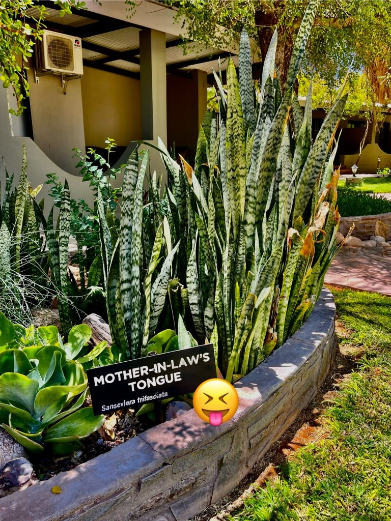 Das ist aber schon eine recht einseitige Belastung! 😬 Na, wir fahren dann mal weiter… und kommen auch zackizacki um 11:30 Uhr bei der Desert Lodge an. Die Empfangsdame kommt sogar mit den Begrüßungssäften bis vor zu uns ans Auto… 😎. Wir saßen mal eben einen Moment länger drinnen, um die Lage zu peilen und zu checken, ob wir hier auch richtig sind. Sieht ganz so aus.