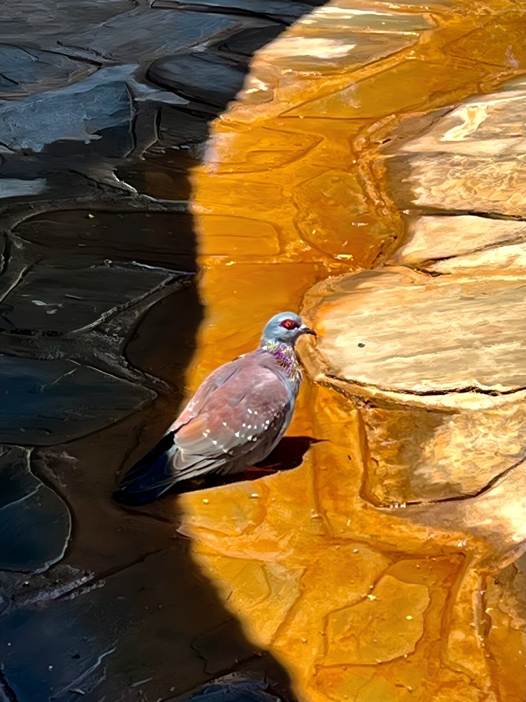 Später werden wir uns noch leckere Salate bestellen und vom gestrengen Taubenblick beobachtet.