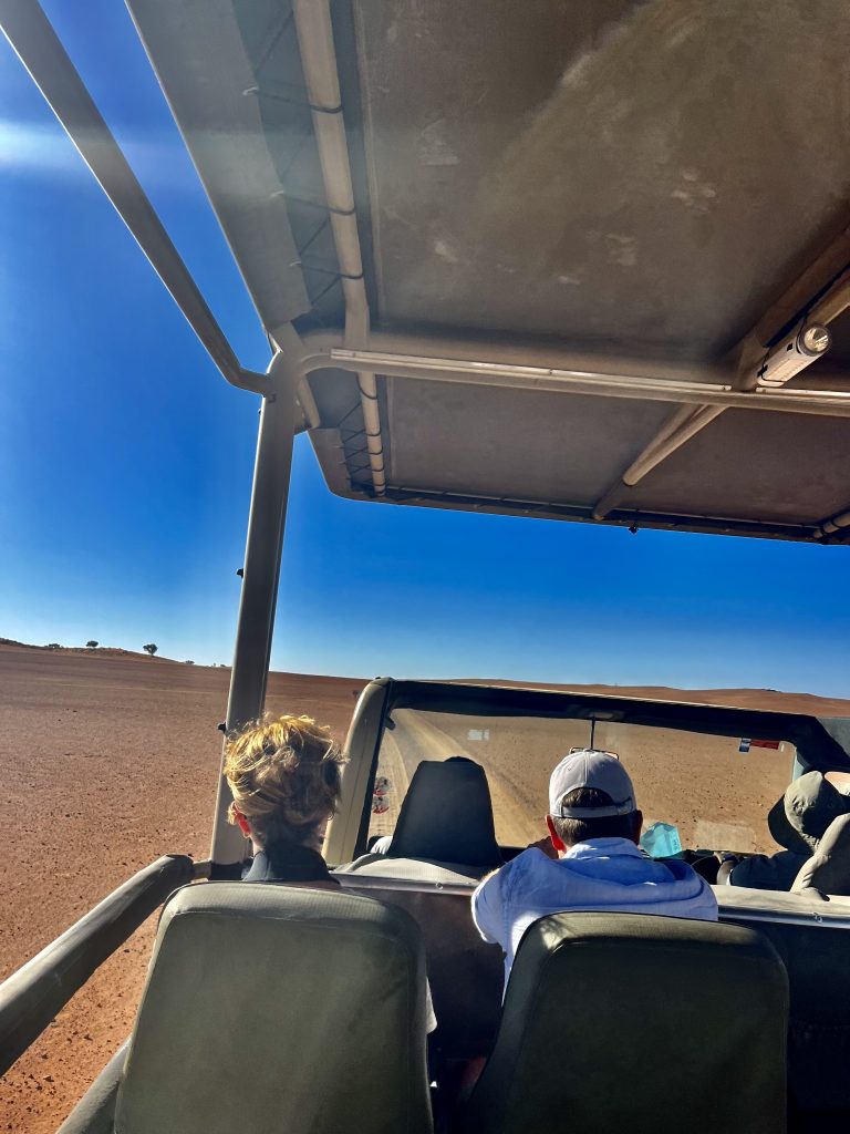Die Fahrt ist rumpelig und pumpelig und führt uns hoch auf eine mächtige Düne.