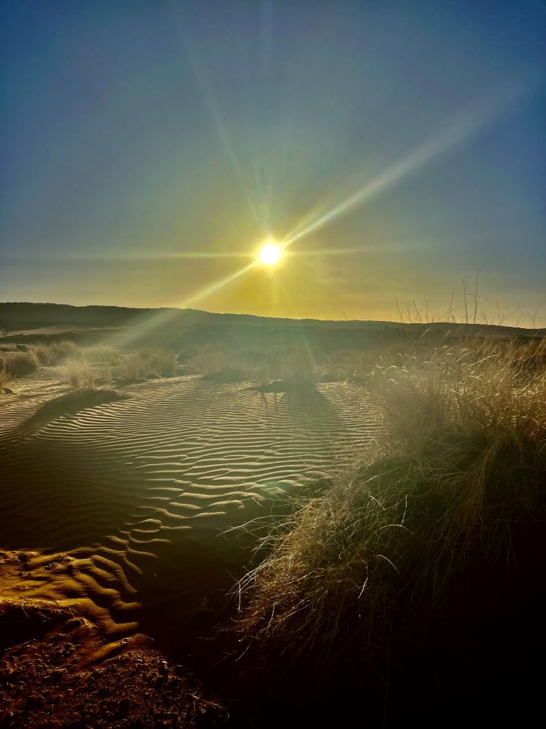 Alles muss vorbereitet sein, wenn wir nachher vom Scorpions Walk 🦂🦂🦂 zurückkommen. Ja, unser Guide ist unermüdlich und wir auch. Nur wir, die anderen sind schon in ihren Betten. Wir tasten uns mit Schwarzlichttaschenlampen durch die Dünen. Aber die Skorpione sind sehr scheu und vorsichtig. Sobald sie unsere Schritte wahrnehmen, zischen sie in ihre Löcher zurück. Einen kleinen Skorpion kann ich ganz kurz zur Hälfte erhaschen. Da verkriecht er sich auch schon wieder in seinem Erdloch. Ja, giftig sind die schon, aber für uns besteht keine Gefahr. Sie sind einfach zu vorsichtig und die Terrasse auf Stelzen kommen sie nicht hoch. Sie leben als Einzelgänger und vermeiden den gegenseitigen Kontakt. Denn sind die Zeiten schlecht, fressen sie sich gerne auch gegenseitig. Selbst die Mutter verspeist dann ihre Kinder und bei der Paarung auch gerne danach das Männchen. Da verstehe ich gut, dass sie das Einsiedlerleben bevorzugen! Jetzt aber ab ins Bett und unter den Sternenhimmel.