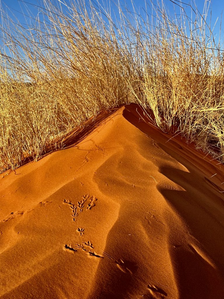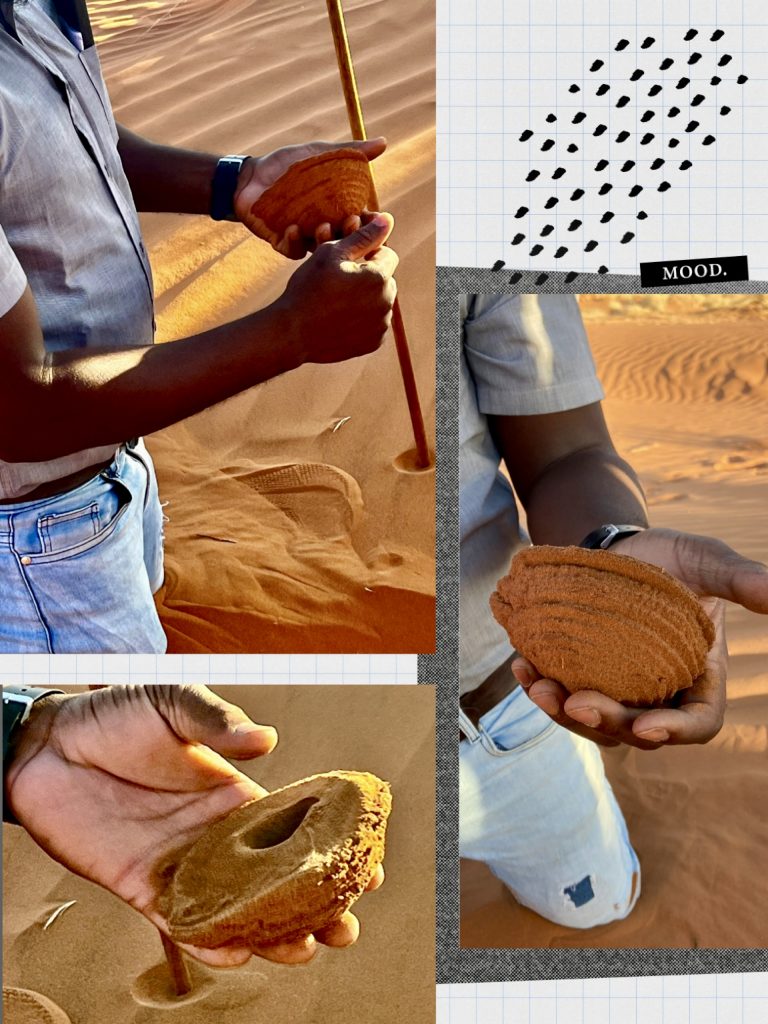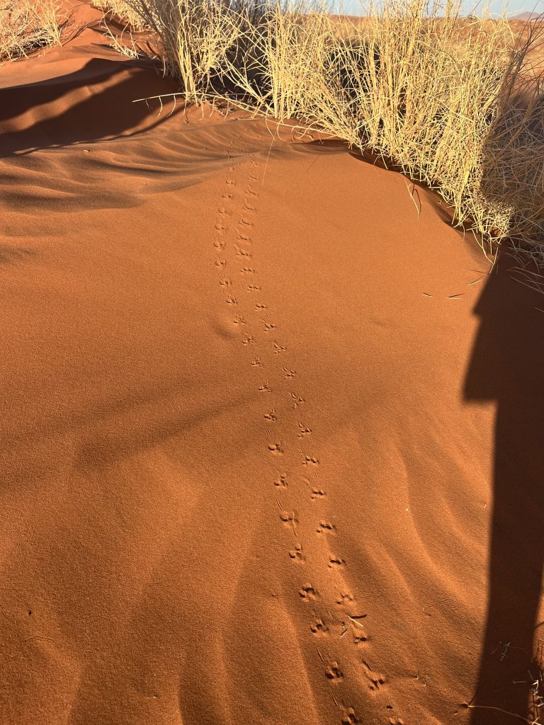 Dann zeigt er uns noch Spuren von Skorpionen, Vögeln, Hyänen, Schakalen, Hasen, der White Spider, handtellergroß und Termiten. Eine beißt mir gerade in den Zeh… aua!