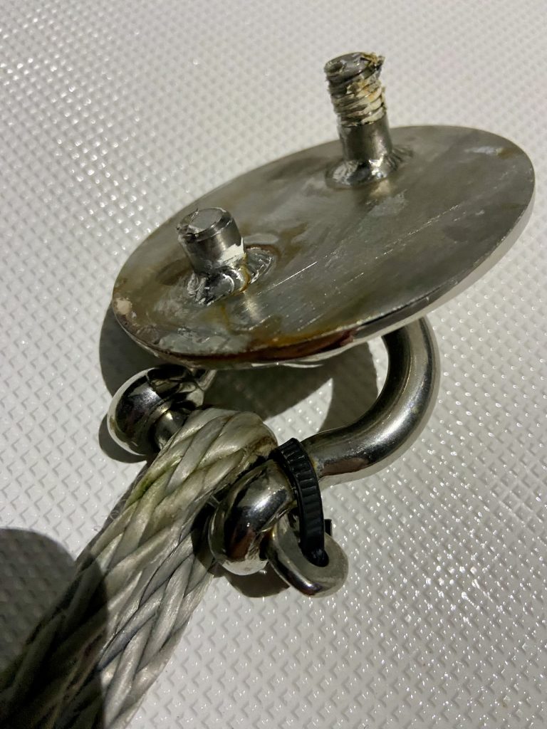Die ist ja gar nicht rausgerissen, die Verschraubung ist abgebrochen… 😔. Wo sitzt denn nur die Gegenplatte und die Muttern?? Wir müssen morgen, bei Helligkeit, nochmal alles kontrollieren und mit Seawind Kontakt aufnehmen. Subito! Nun schießen die Gedanken ins Kraut, wie ist d a s bloß zu reparieren????? Soviel vorne weg, heute Nacht machen wir fast kein Auge mehr zu. 😥