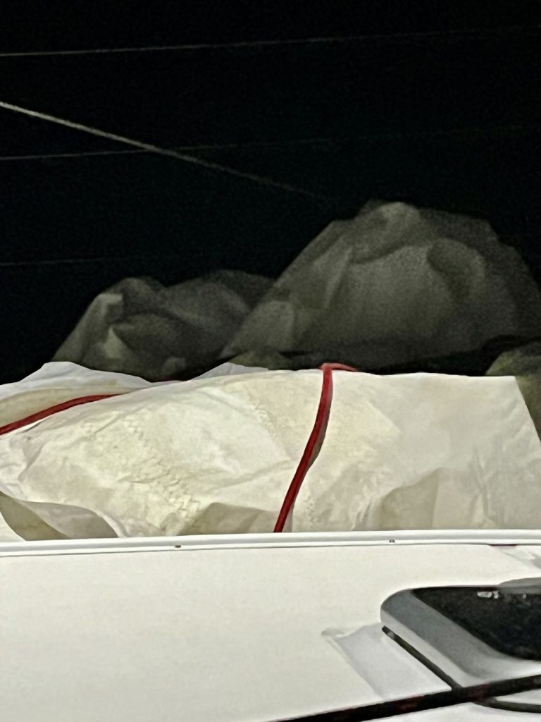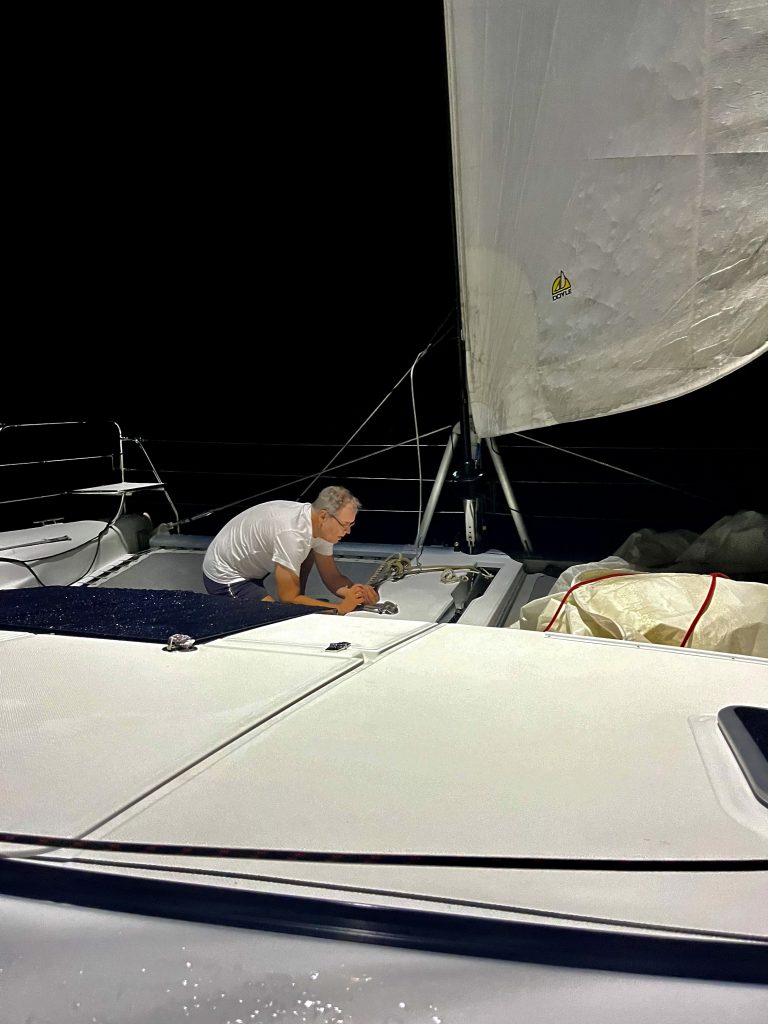 Vorne das eingerollte Jib, hinten das Screecher, befestigt an der „Verlängerungsstange“, dem Bugspriet. Seitlich ist dieses Bugspriet mit 2 Dyneemaleinen rechts und links an den Rümpfen, mit jeweils einer Edelstahlplatte, der sogenannten Augplatte, befestigt. Diese Augplatte rechts ist rausgerissen, das Bugspriet taumelt hin und her, das Screecher kann nicht mehr eingerollt werden. Ich soll es augenblicklich runter lassen, oben vom Mast. Klaus steht vorne und versucht es mit seinen Händen einzufangen, 66 Quadratmeter Segel…😱. Beide Motoren laufen volle Kraft voraus, um den Wind abzuschwächen. Es regnet immer stärker, es ist dunkel und es schaukelt hin und her. Hoffentlich reißt ihn das Segel nicht auch noch über Bord!!! Dann soll ich das Segel ganz schnell runterlassen, schreit er. Okay, nichts wie runter damit. Es ist unten. Ich humpel vor, und wir versuchen das Segel etwas zusammenzufassen und mit Leinen auf dem Trampolin zu sichern. Wir sind rattennass, alles ist rutschig. Und der Frachter? Wo ist der? Der ist noch weit weg, sage ich einfach so. Ich weiß es nicht… Das Segel ist gesichert, Klaus braucht nun eine Taschenlampe, um sich den Schaden am Rumpf anzusehen. 🔦 Ich hole sie, kann aber echt nicht mehr viel erkennen, die Brille ist verregnet, die Augen brennen vom Salzwasser, der Fuß? Naja…. Okay, die Augplatte ist rausgerissen, wir haben jetzt Löcher im Rumpf, und zwar eher unter der Wasserlinie. Läuft jetzt das Boot voll? 😱😱 Wir eilen zurück ins Trockene, müssen aber erstmal die triefenden Klamotten von uns schmeißen. Ein Blick in die Bilge gibt die erste Entwarnung. Da läuft nichts erkennbar rein. Jetzt müssen wir hinter meinem Klo den Schapp ausräumen, um hineinzuklettern und durchs Guckloch in die Crashbox der Rumpfspitze schauen zu können. Macht Klaus, er kann aber nichts erkennen.