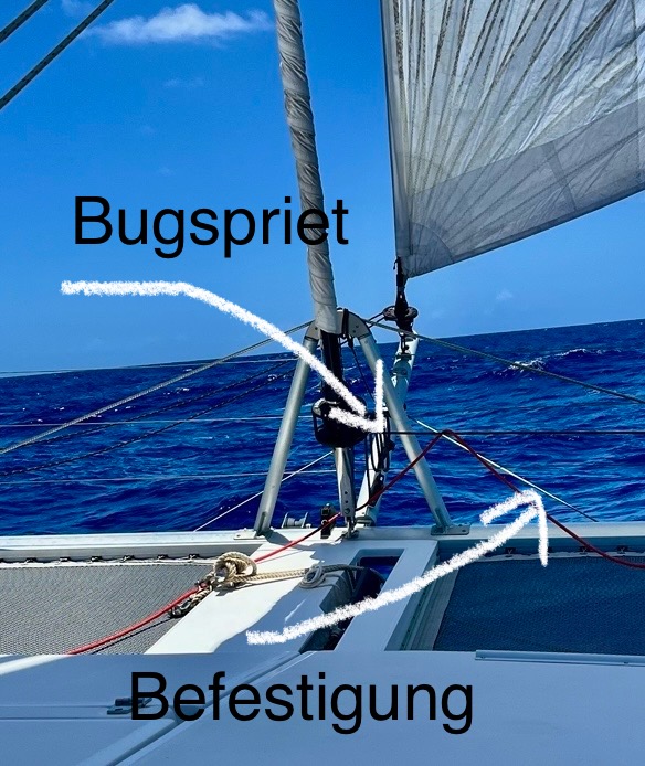 Klaus schläft, ich nicht! 😁 Ziemlich genau mit Einsetzen des Regens, gegen 22:00 Uhr, das Schiff hat uns noch nicht passiert, gibt es einen lauten Schlag und ein metallisches Geklöder. Erschrocken schaue ich nach vorne aus dem Fenster, das Screecher schlägt hin und her. Klaus, Klaus, wach auf‼️Irgendetwas ist passiert‼️ Ich weiß immer noch nicht was eigentlich??? Klaus sieht’s sofort. Die Halterung des Bugspriets ist aus dem Rumpf gerissen und alles schlägt hin und her. Das Segel ist nicht mehr auf Spannung.