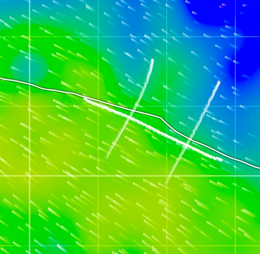 Wir segeln in die völlig falsche Richtung. Der Wind hatte gedreht, war aber zu stark, um das Screecher auf die andere Seite zu holen. So musste der Kurs immer wieder geändert werden, die falsche Richtung entstand. Gut zu erkennen auf unserer Trackinglinie.