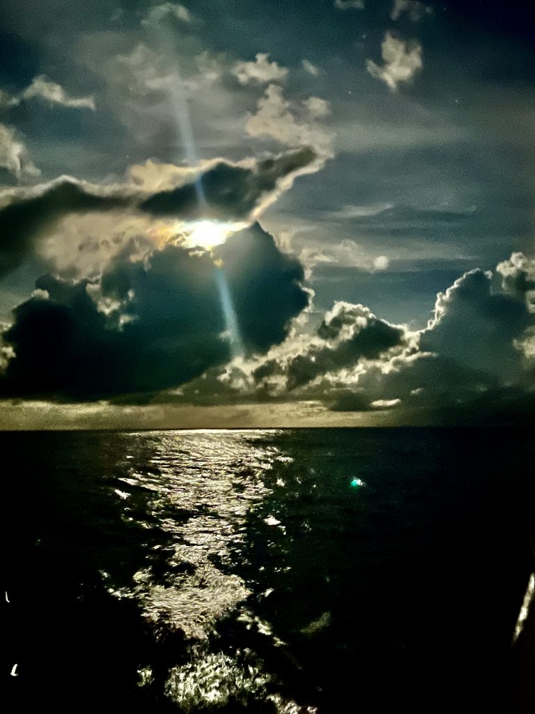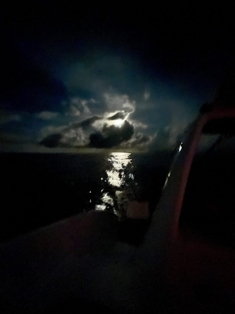 Erst segeln wir noch mit dem Jib in die Nacht, holen es aber bald wieder rein, da es eigentlich nur nervig hin und her scheppert. Wir fahren mit Motor und Strömung und kommen immerhin auf durchschnittlich 6 Knoten, mal kurz…