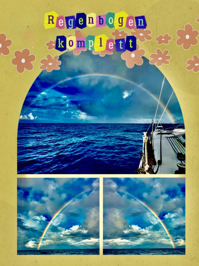 6:20 Uhr, wir scheinen uns gerade in einer Konvergenzzone zu bewegen. Wind von vorne UND Wind von hinten, gleichzeitig! Auch der Äquator schickt seine Vorboten zu uns. Immer und immer wieder ergießen sich kräftige Schauer über uns. Dann kommt die Sonne wieder hervor, manchmal auch beides gleichzeitig. Regenbogen sind dann das schöne Ergebnis.