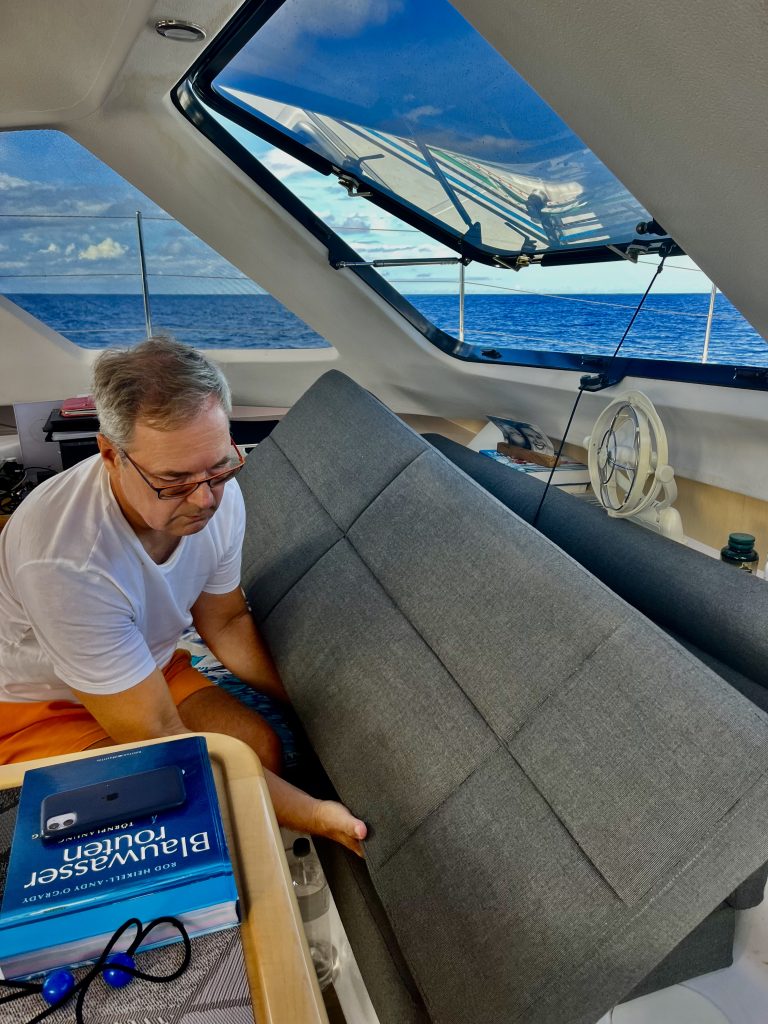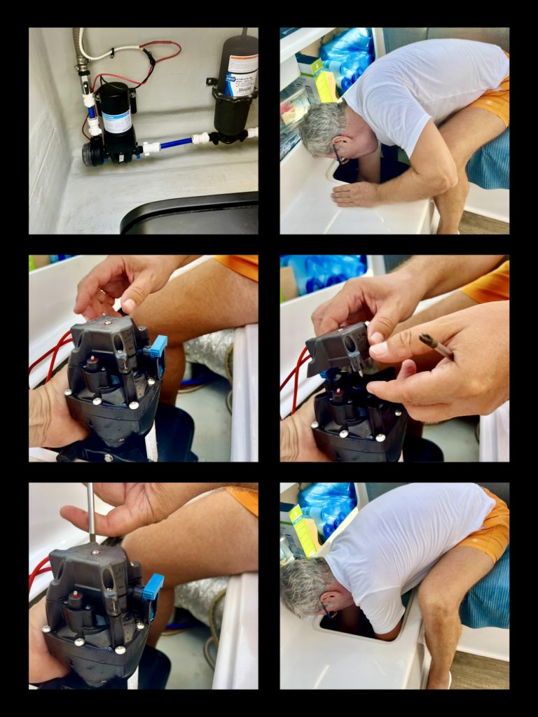 Als ich nach meiner kurzen Schlafphase wieder im Salon erscheine, liegen doch tatsächlich keine weiteren Dramen oder Probleme auf dem Tisch. Tatsächlich?? Tatsächlich!! Aber ehe ich es vergesse, kurz bevor ich schlafen ging und mir noch die Zähne putzen wollte…, machte die Frischwasserpumpe wieder schlapp. 😤 Erneut wird die Bank abgebaut, die Pumpe rausgeschraubt und der Drucktaster, der vermutete Übeltäter, neu eingestellt. Okay, sie geht wieder. Für drei Pumpstöße? Oder länger?? Nerv!!! ☹️😤🤔🥴🤬🫤😡☹️😓😞