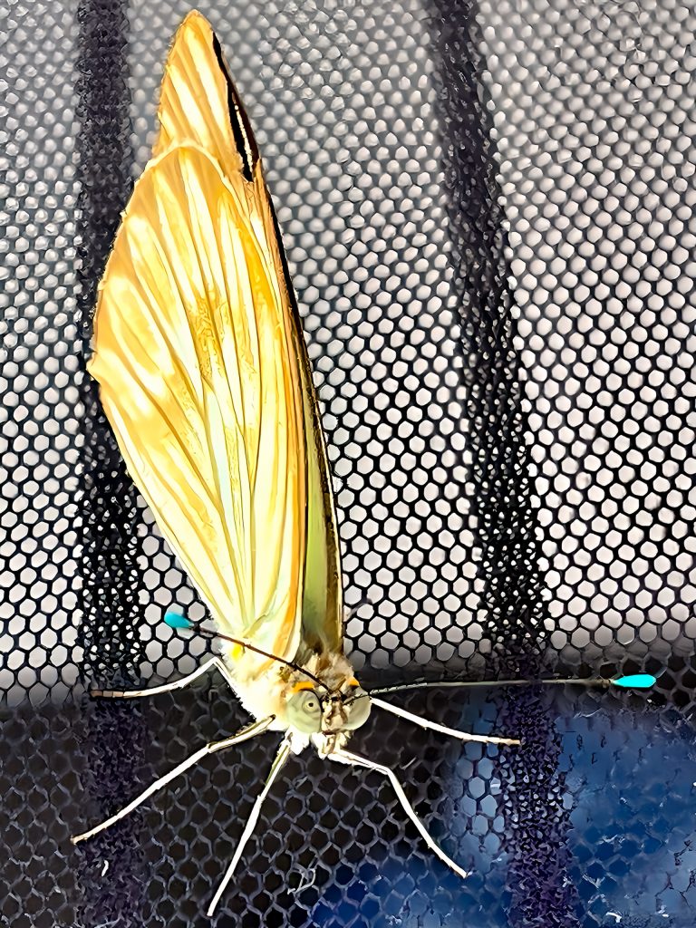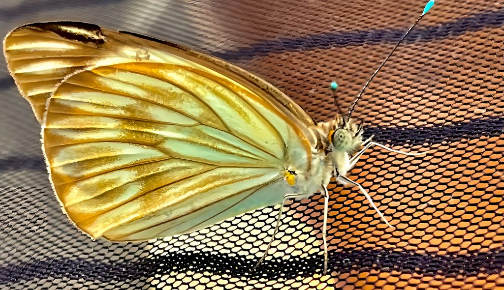 Immer mehr Motten, Fliegen und Käfer finden sich bei uns am Boot ein. Bähhh. Auch ein Schmetterling oder Tagesfalter sitzt plötzlich an unserem Mückenschutz. Schöne türkisfarbene Fühlerenden schmücken ihn.