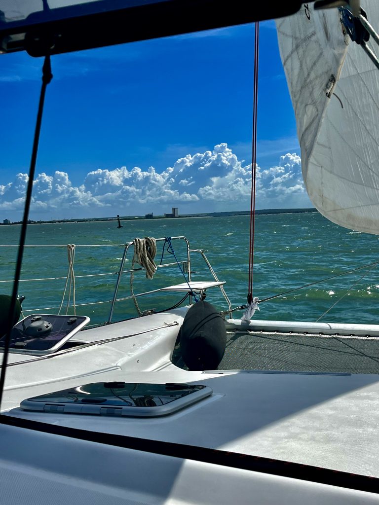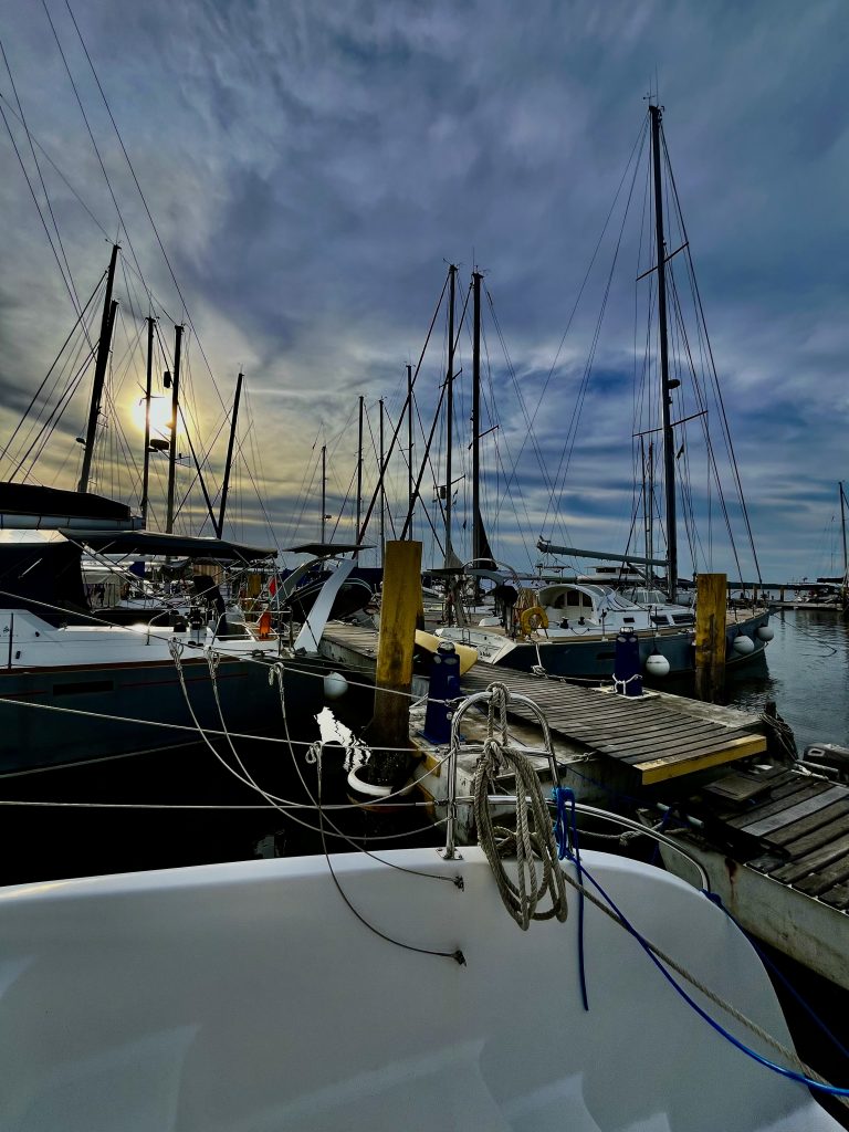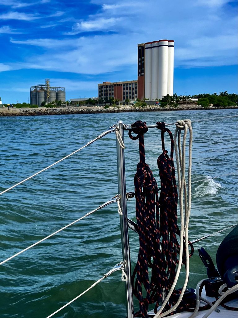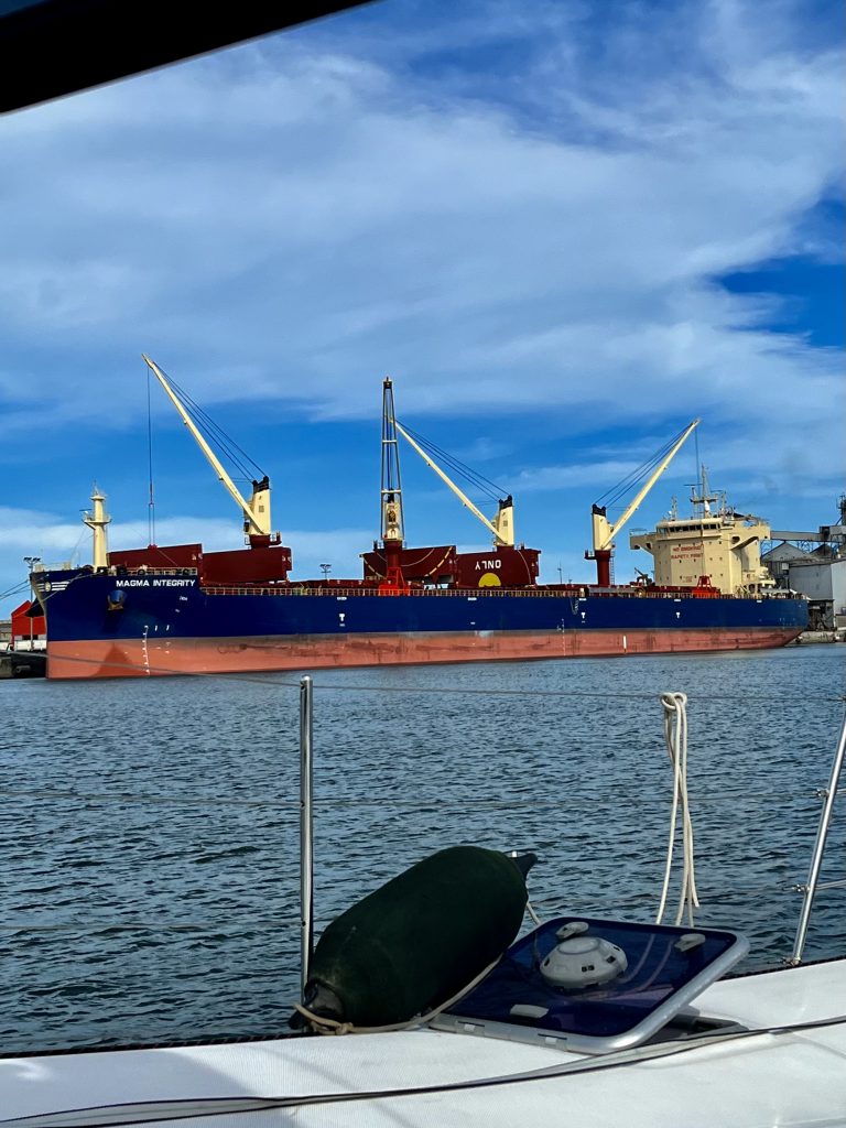Mittlerweile habe ich die Fender und Festmacherleinen befestigt und bin bereit fürs Anlegen in der Marina. 🫡 Ich muss gerade an das schwedisch oder norwegische Seglerpaar denken, das wir kurz in Richard’s Bay kennengelernt hatten. Immer wenn die ein neues Land erreichen, fängt sie lauthals an zu schreien. Aber wie! Sie machte es uns vor. 🙉 Es gibt schon eigenartige Menschen unter den Langfahrtseglern, das muss ich schon sagen! Vielleicht werden wir ja auch sonderbar, so mit der Zeit? 😵💫