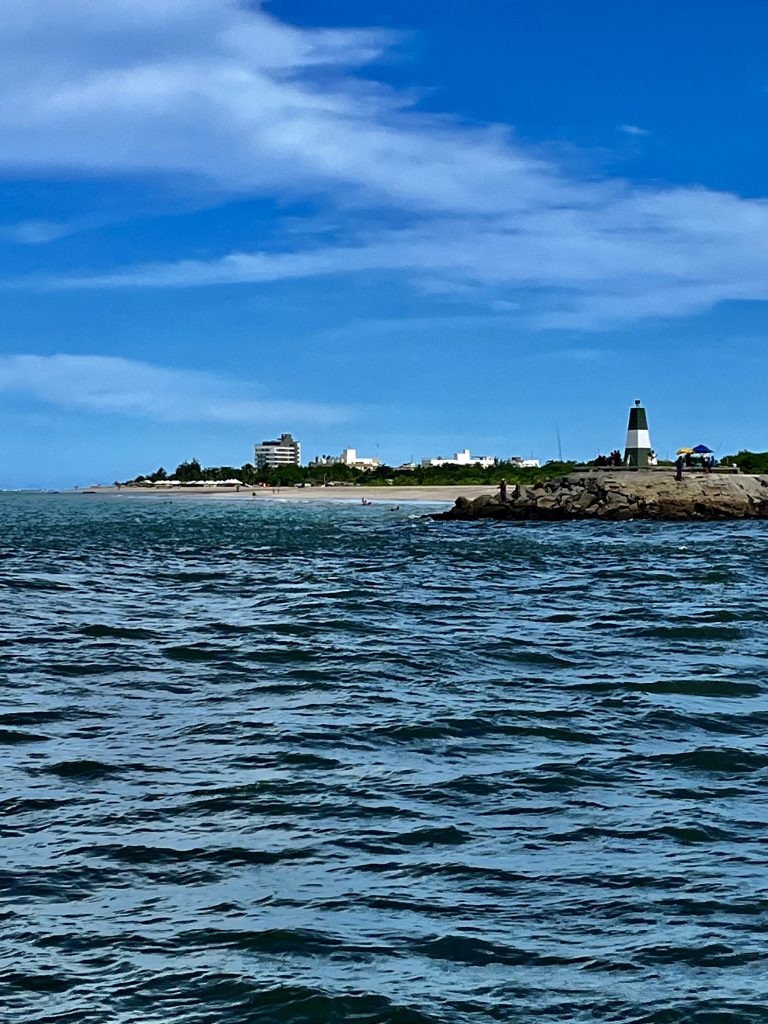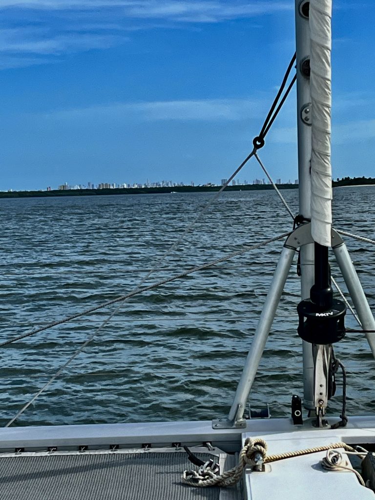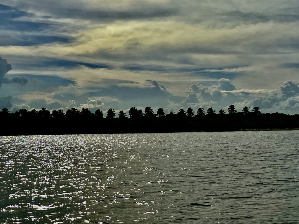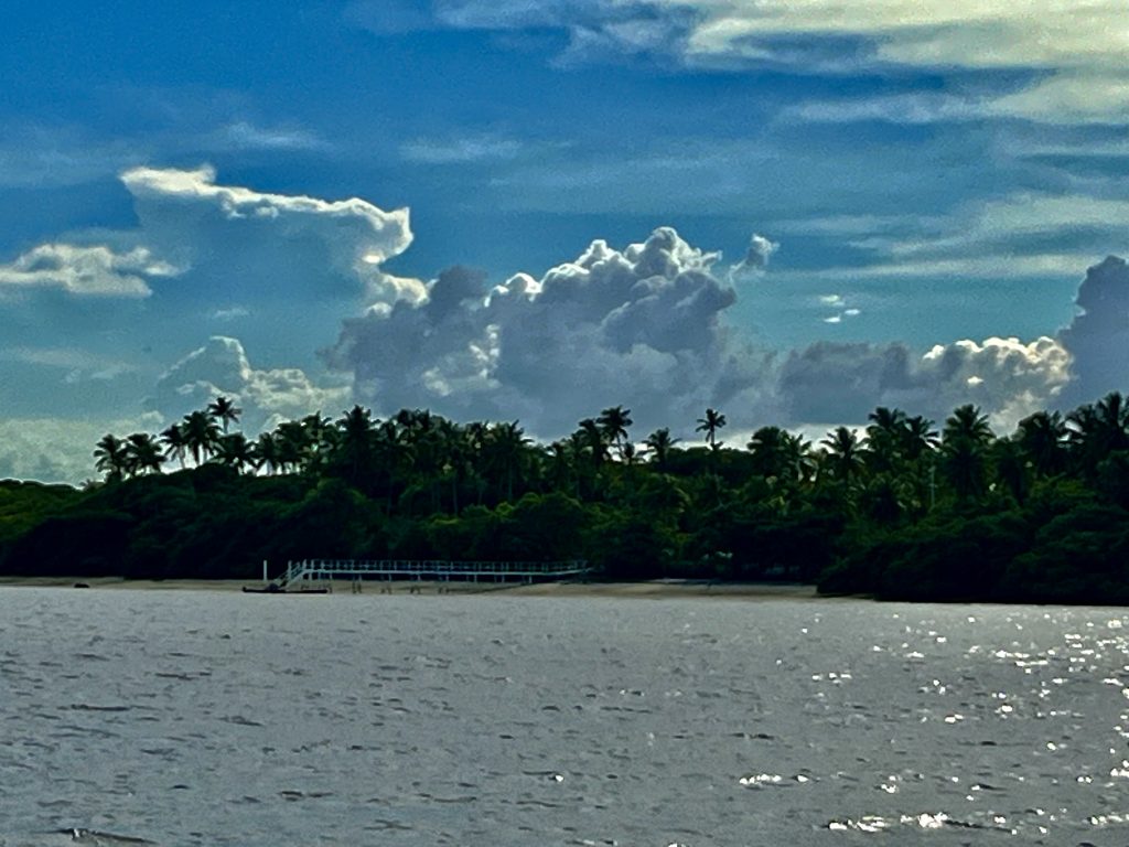 In der Nacht hatten wir den Motor für ein paar Stunden ausgeschaltet und sind rumgedümpelt. Jetzt, um kurz vor 9:00 Uhr, wird ein Motor wieder gestartet und wir dieseln gemütlich Richtung Mündung des Paraíba do Norte River. Da wir ja immer noch nicht unsere Uhren zurückgestellt haben, genießen wir immer später die aufgehende Sonne.