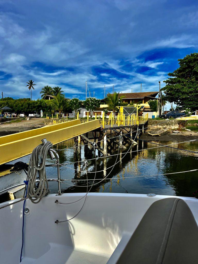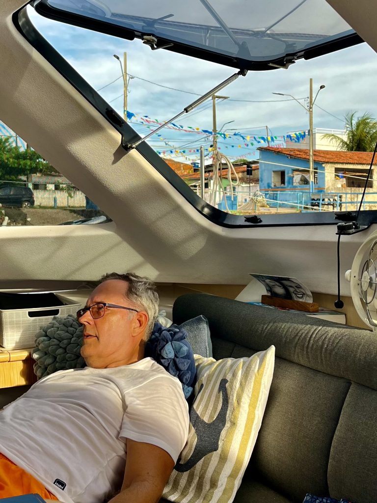 Dann schreiben wir Christoph, dem deutschen Problemlöser aller Dinge und dürfen sogar noch bei ihm vorbeikommen, trotz Feierabend. Er ist nicht weit von der Marina ansässig und empfängt uns freundlich. Wir besprechen all unsere Probleme, er ist kompetent, clever, sehr fix im Denken und hat sofort Lösungen part. Er ist vielleicht Mitte 60, fit und echt umsetzungsstark. Am Montag, nach unserer erfolgten Einklarierung, kommt er an Bord und schaut sich vor allem unser Hauptproblem vor Ort an. Da werden wir nicht schlecht staunen, wie fix er die Sachen angeht… 🤭. Von ihm laufen wir, Klaus läuft, ich humple, Richtung Stadt Jacaré, um noch Geld zu besorgen. Klaus hat einen Geldautomaten ausfindig gemacht und meint, das wäre nicht weit… Falsch gemein! Eine Schnellstraße, höher gelegt, erschwert das Weiterkommen. Dazu mache ich schlapp, mein Fuß schmerzt zu arg. Ich will auch nicht mehr zu Fuß zurück. Wir rasten an einer Tanke,