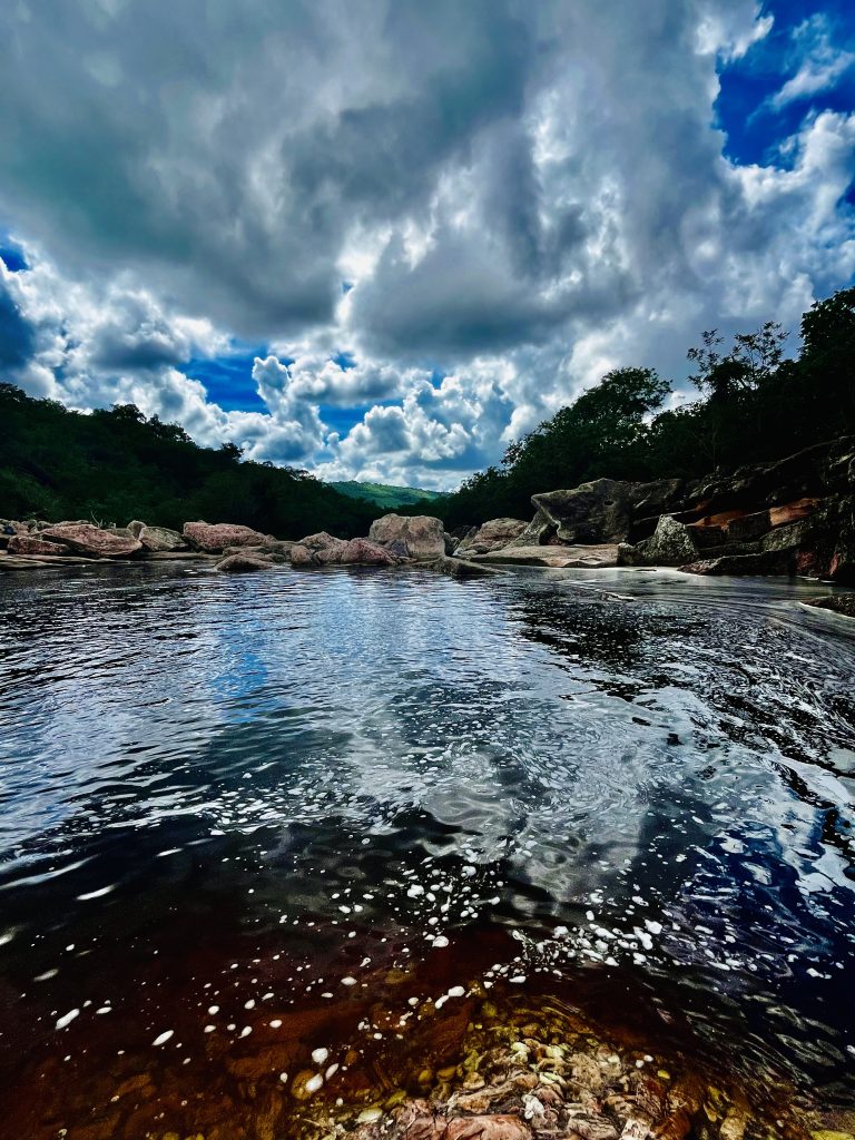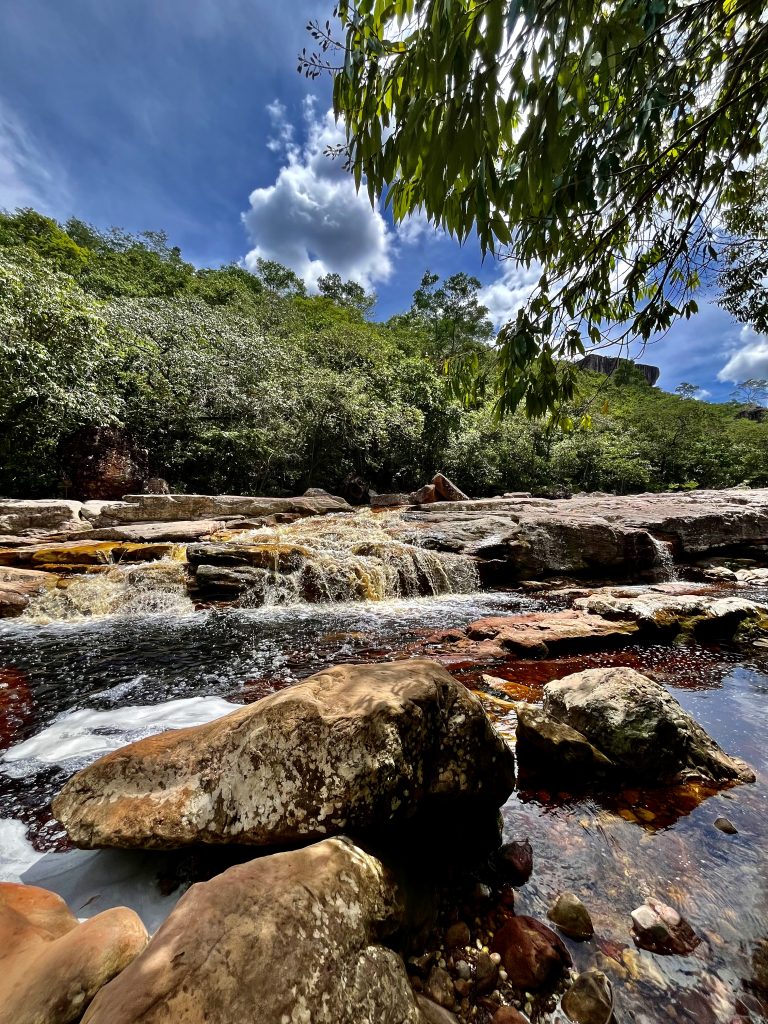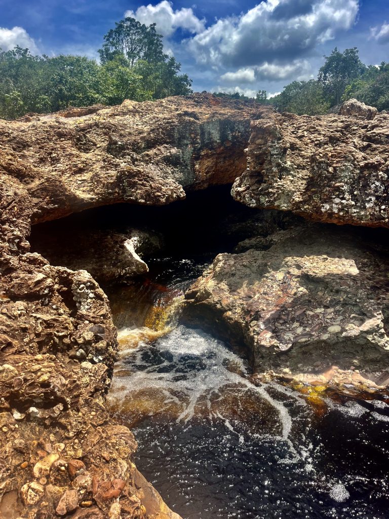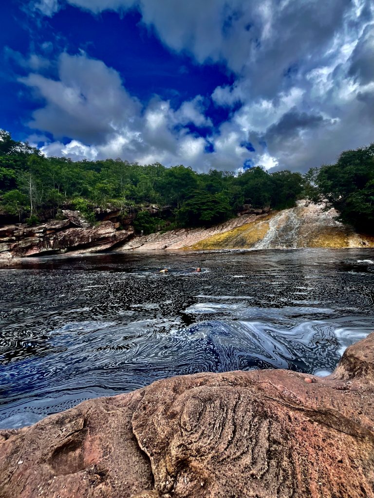 Wir schwitzen! Es ist heiß und schwül. Der Schweiß fließt in Bächen den Rücken herunter und vom Kopf in meine Augen, die brennen jetzt. 😓 Da kommt es sehr gelegen, dass wir soeben ein natürliches Schwimmbecken erreichen. Eine sehr schöne Wasserlandschaft überrascht uns, kleinere Wasserfälle inklusive.