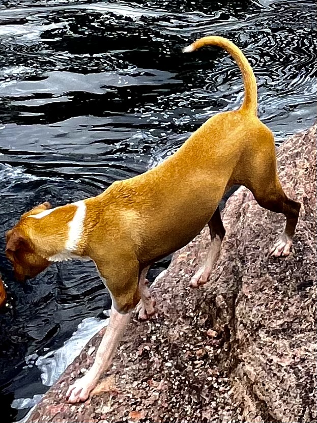 Eher eine Wasserrutschbahn, die da lockt. Wir sind aber nicht allein. Eine Schwimmerin mit Hund ist bereits im erfrischenden Nass.