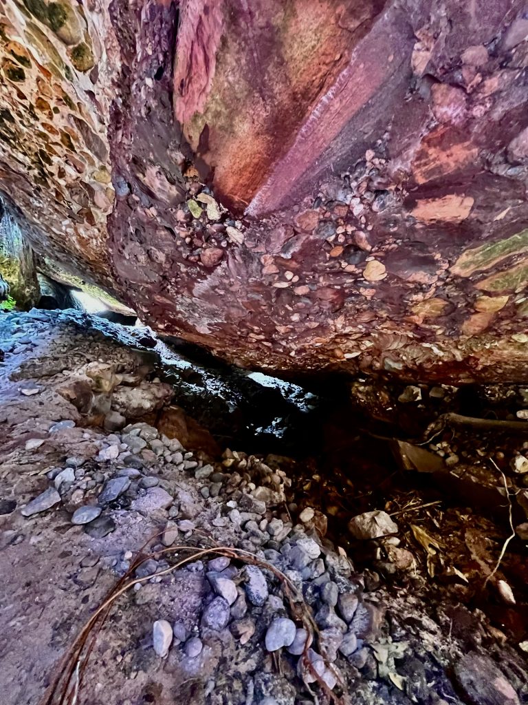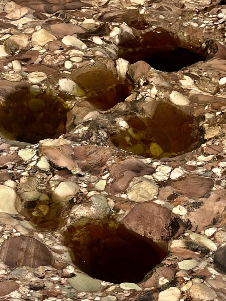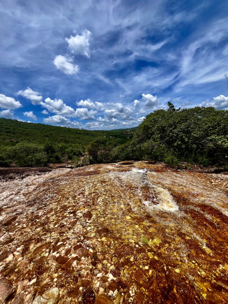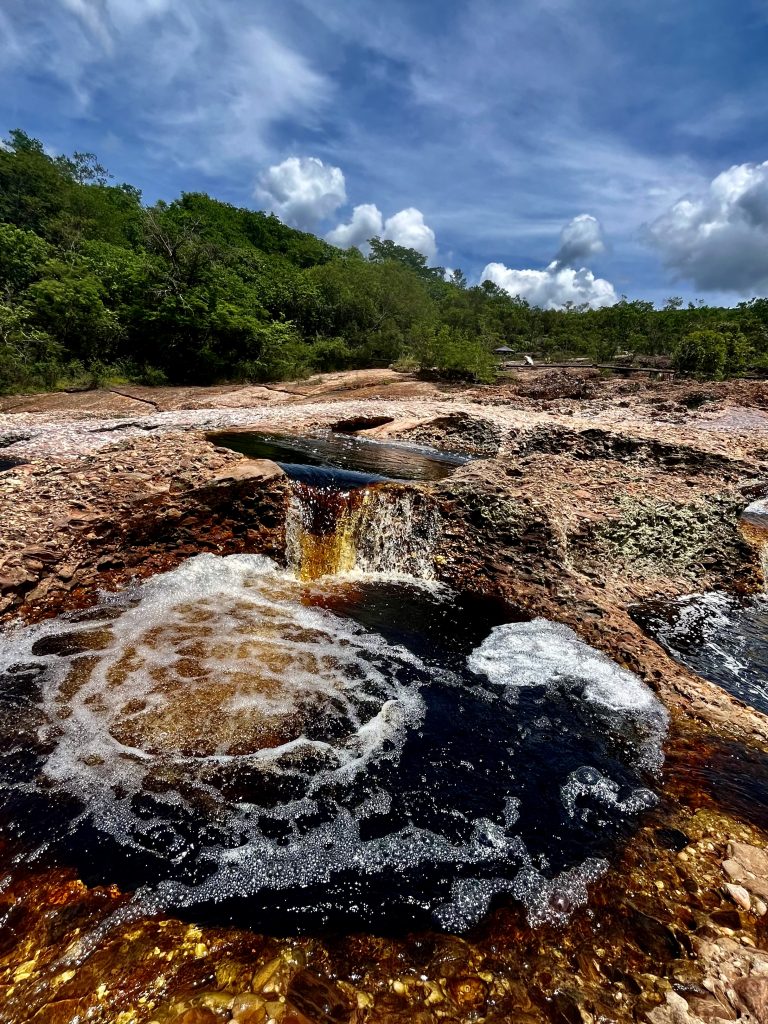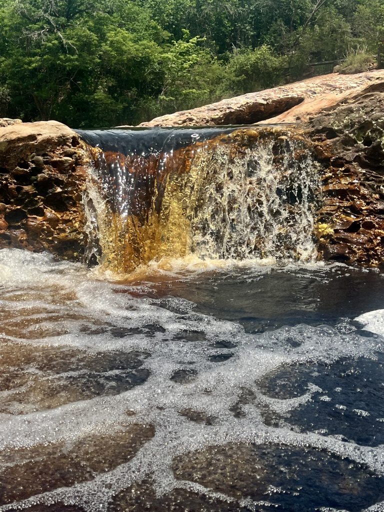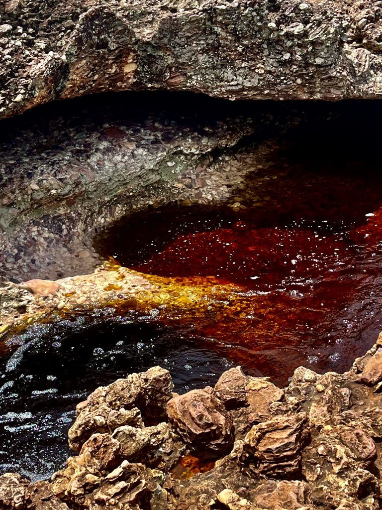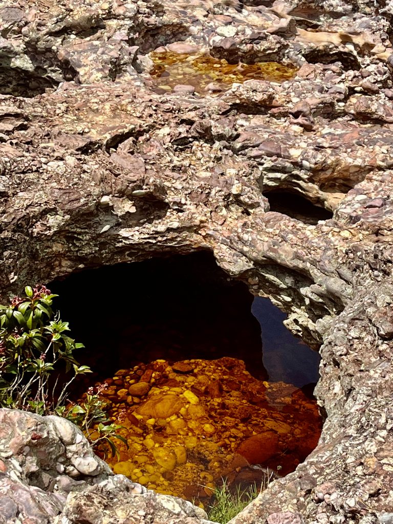 Jetzt müsste man sich schütteln können wie ein Hund und man wäre trocken. Stattdessen wechseln wir die T-Shirts, von ganz nass zu nass, die Badehose lasse ich an. Auf dem Rückweg kommen wir an dollen Steinformationen und Wasserströmen vorbei. Wobei das Wasser eher wie Coca Cola aussieht. Viele Mineralien sind im Wasser gelöst, besonders Eisen.