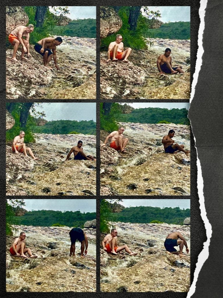 Ich könnt’ Tränen lachen, wenn ich mir anschaue, wie Antonio da runtersaust und regelrecht hochhopst, bevor er ins Wasser klatscht. 💦 😂 Das soll Klaus ihm jetzt nachmachen, ich eigentlich auch, aber barfuß komme ich mit den Fußschmerzen da nicht hoch. 😔 Antonio geht mit Klaus mit und zeigt ihm die geeignete Startposition. 😆