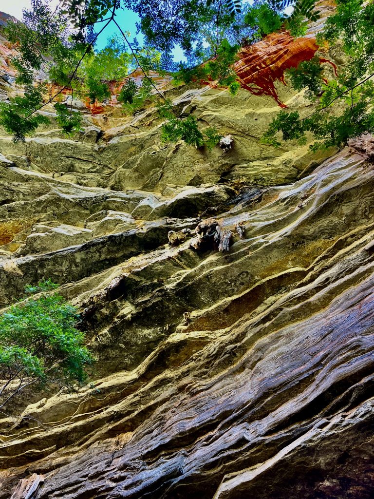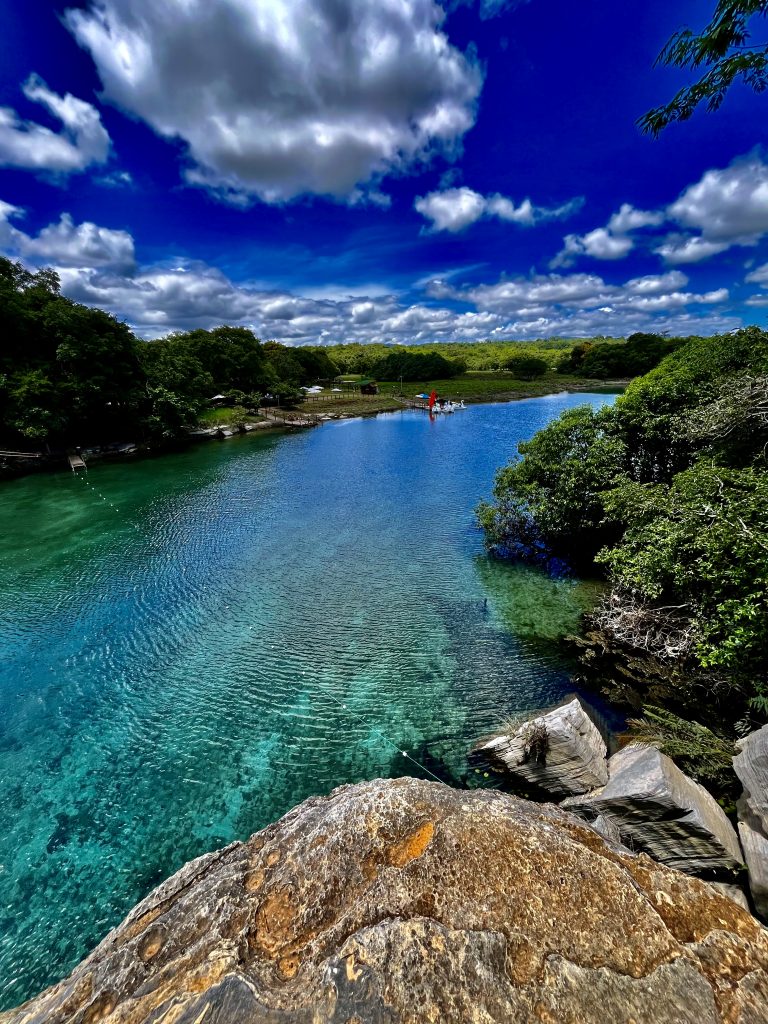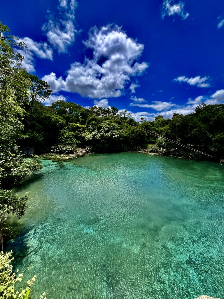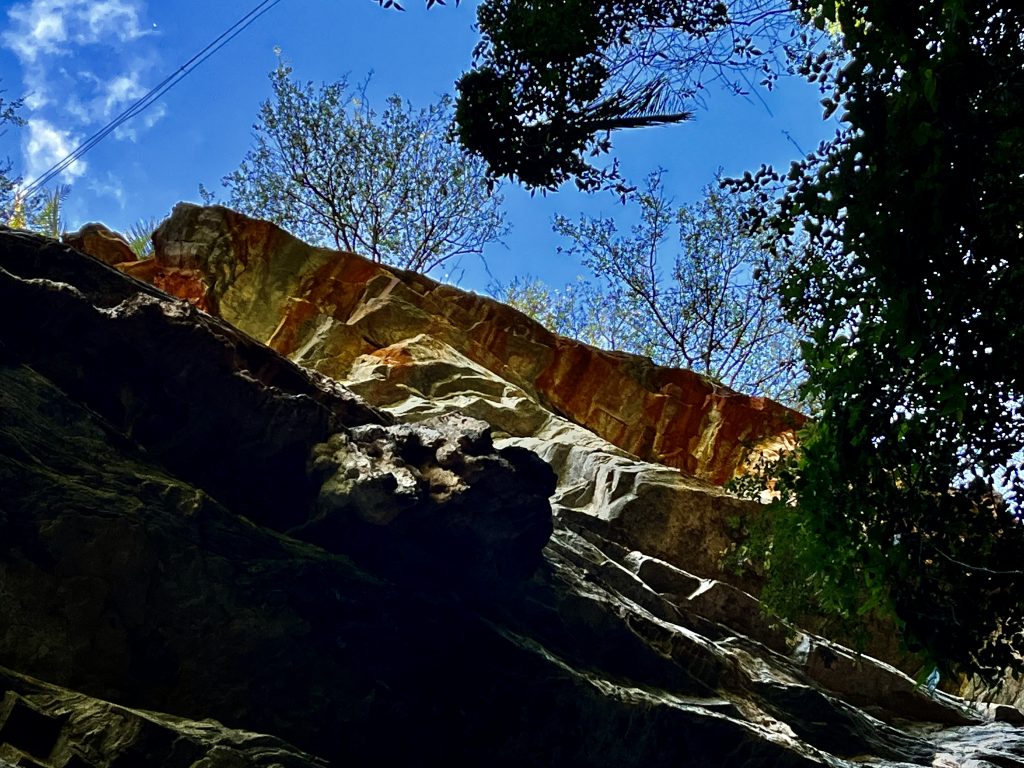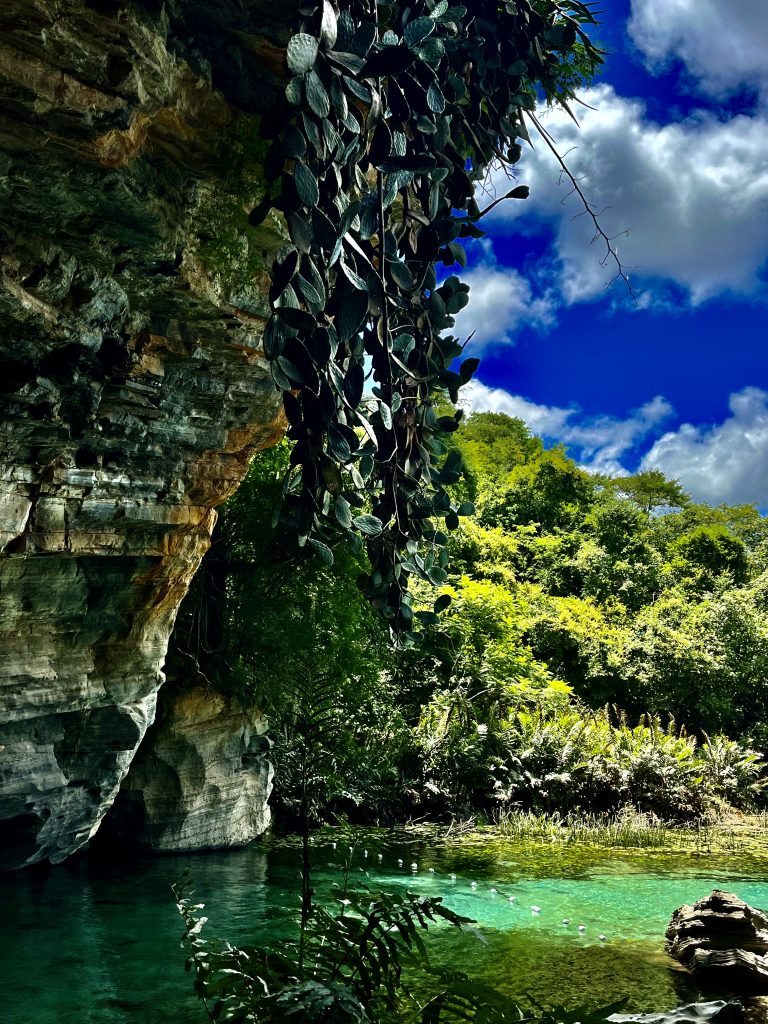 Der Weg hat sich aber schon gelohnt. Nett ist es hier. Auch gibt es eine kleine Restauration. Also erstmal baden, dann mampfen. Tief ist das Wasser nicht, aber wie versprochen sehr schön klar. So klar, dass ich auch die kleinen Fischchen sehen kann, die sich an meinen zwei kleinen Zehenblasen zu schaffen machen. Aua!!! Haben die vergessen, dass sie k e i n e Piranhas sind?!? Die beißen ganz schön zu! 😳 So, jetzt reicht‘s, raus aus dem Wasser, die allseits nassen Klamotten wechseln und ein bisschen was essen und trinken. Antonio wird unruhig. Er möchte uns noch die „Blaue Grotte“ zeigen, die sei auch ganz flott zu erreichen. Hmmm…, wenn Antonio sagt, das dauert nur 10 Minuten, dann dauert‘s mindestens 20 Minuten… Also gut, wir laufen hin.