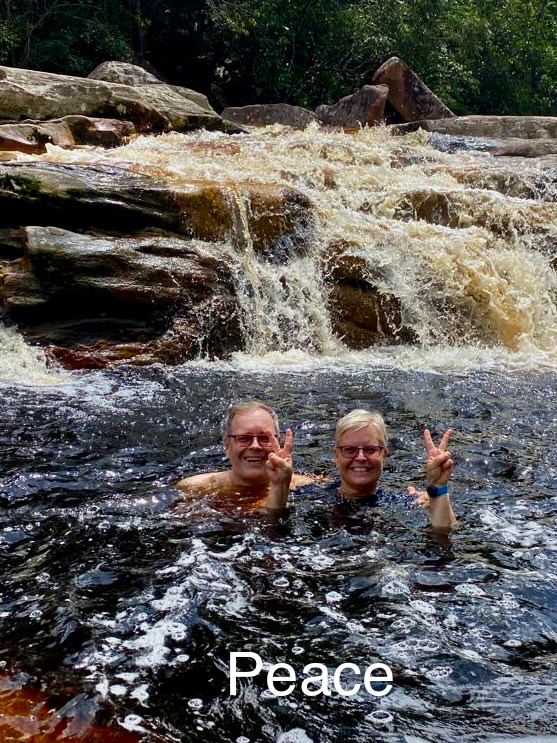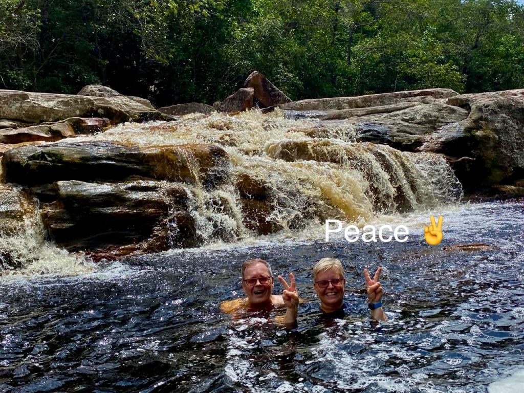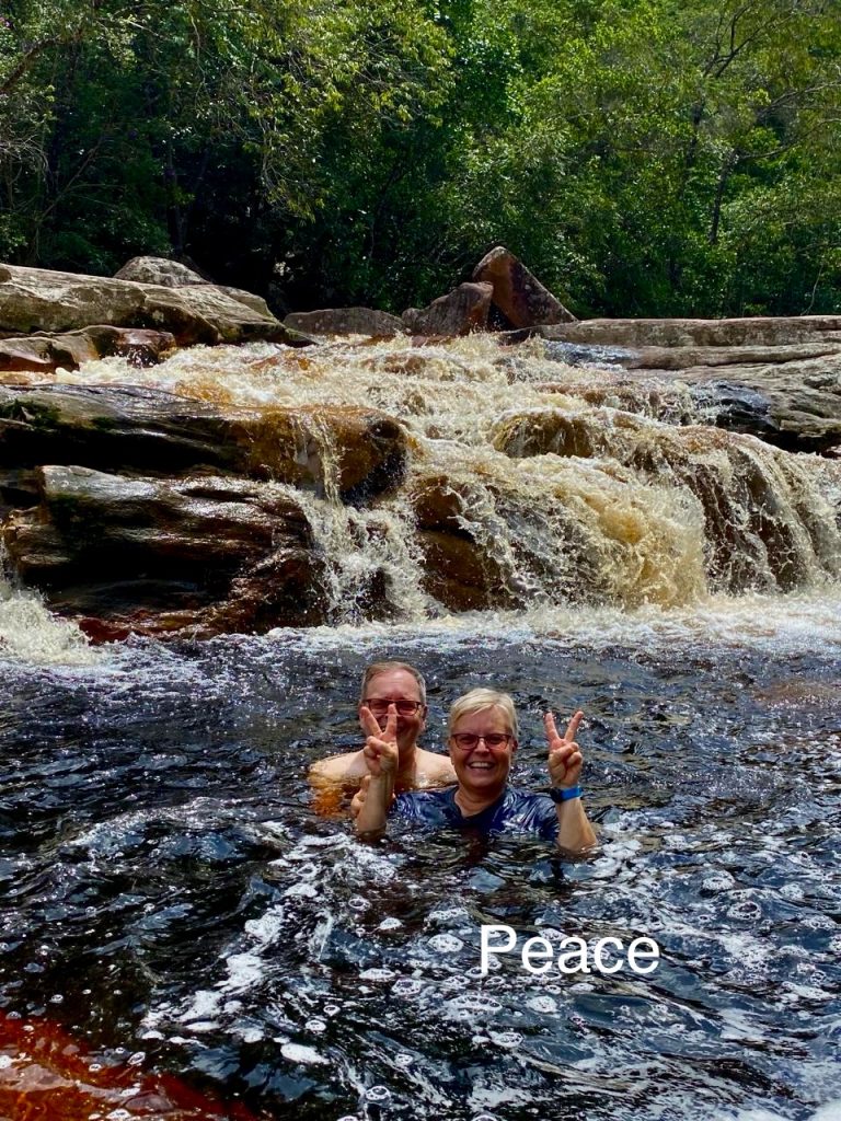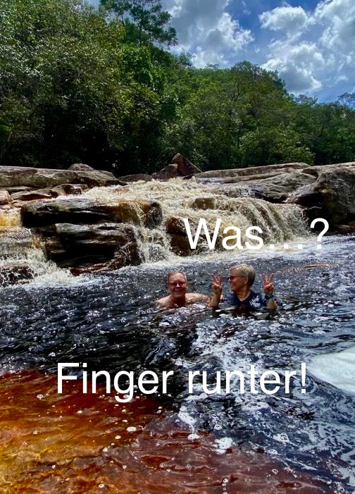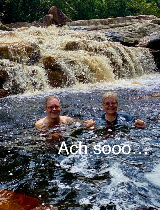 So, nass sind wir sowieso schon, dann könnten wir ja auch weiter, oder? Nein! Keine Chance! Antonio ist der Meinung, nee, nee, da sollten wir jetzt aber schon baden gehen und uns unter den Fall stellen… Naaa guuut. Ich gehe zu erst, stelle mich voll drunter, werde von der Wucht des fallenden Wassers sofort nach hinten umgeworfen, schnappe nach Luft, rappele mich wieder auf und drücke mich durch den Fall nach vorne zurück. Von Klaus bekomme ich gleich einen drauf, denn da wo ich war, darf man gar nicht hin. Bla bla bla… 🥱. Er stellt sich ganz brav nur seitlich unter den Fall.