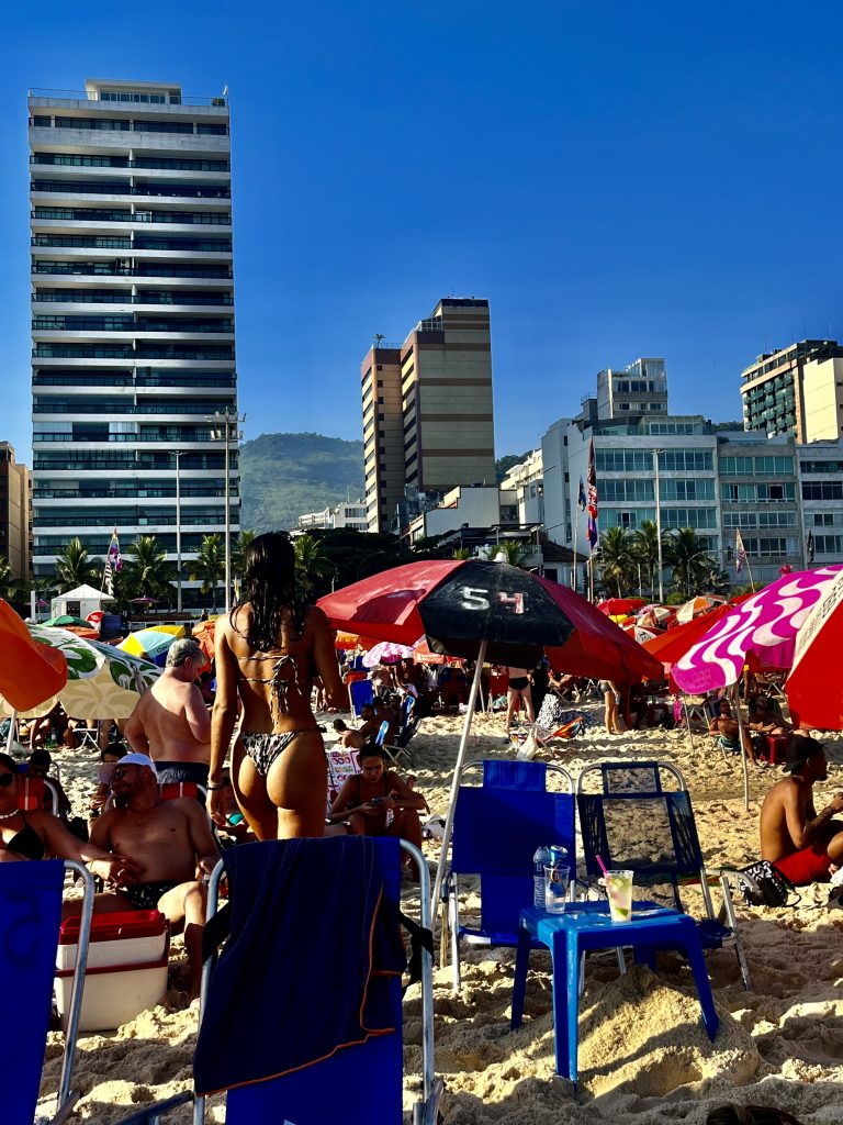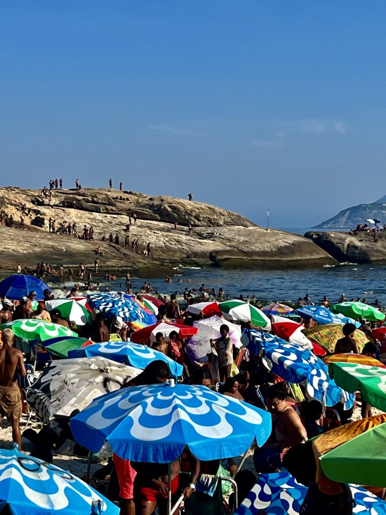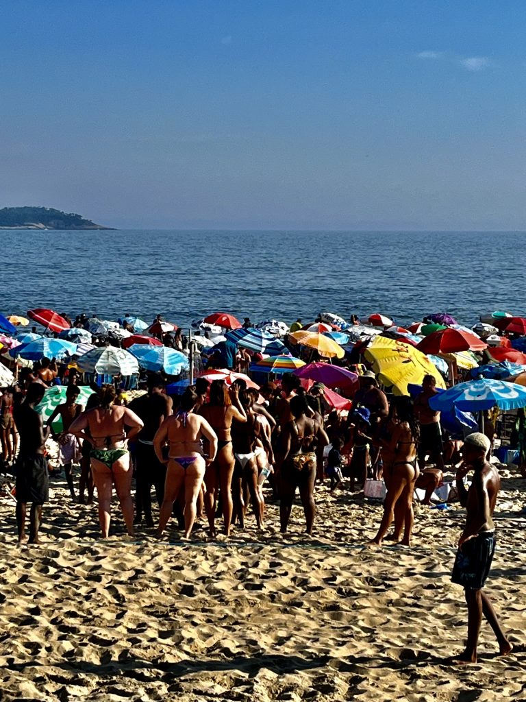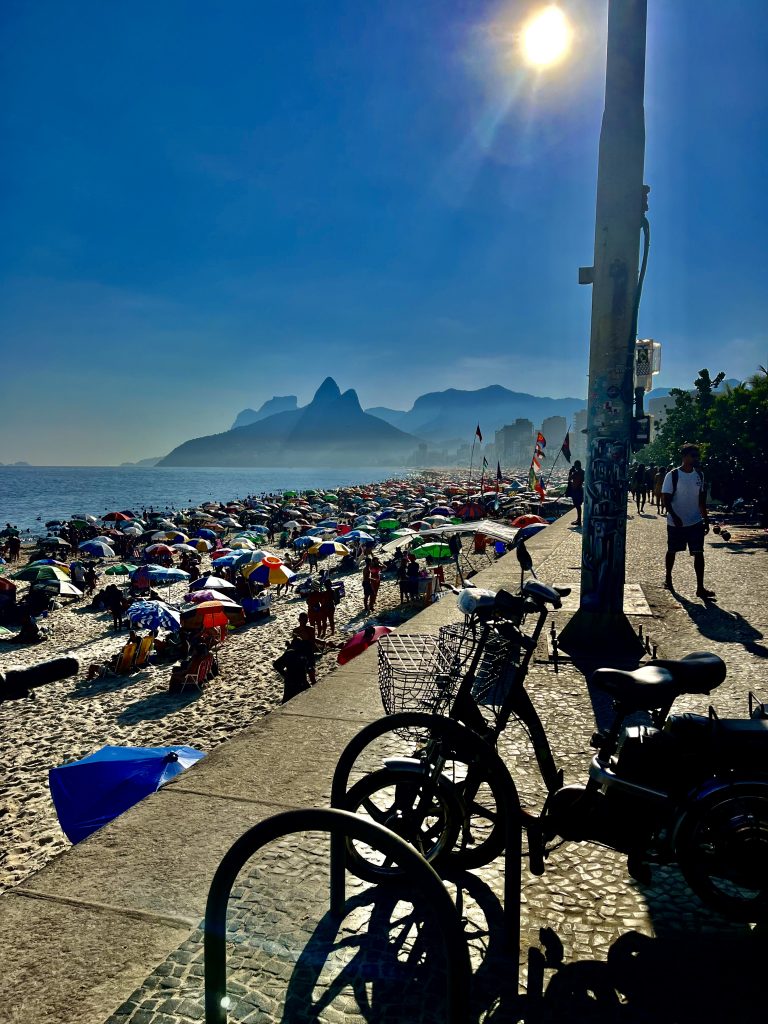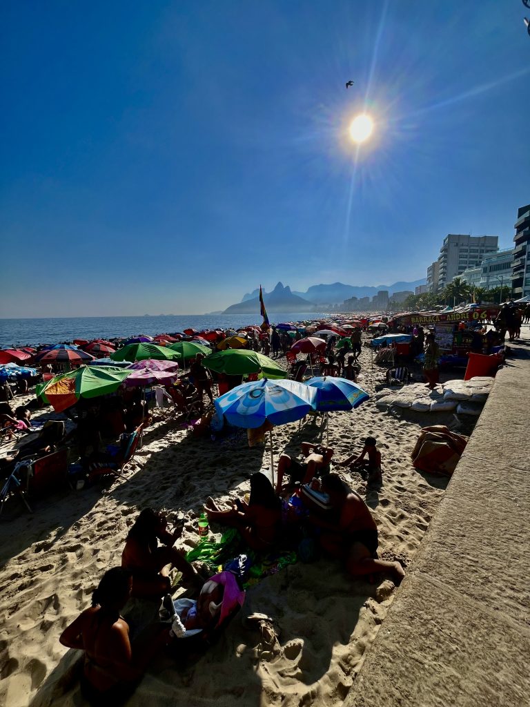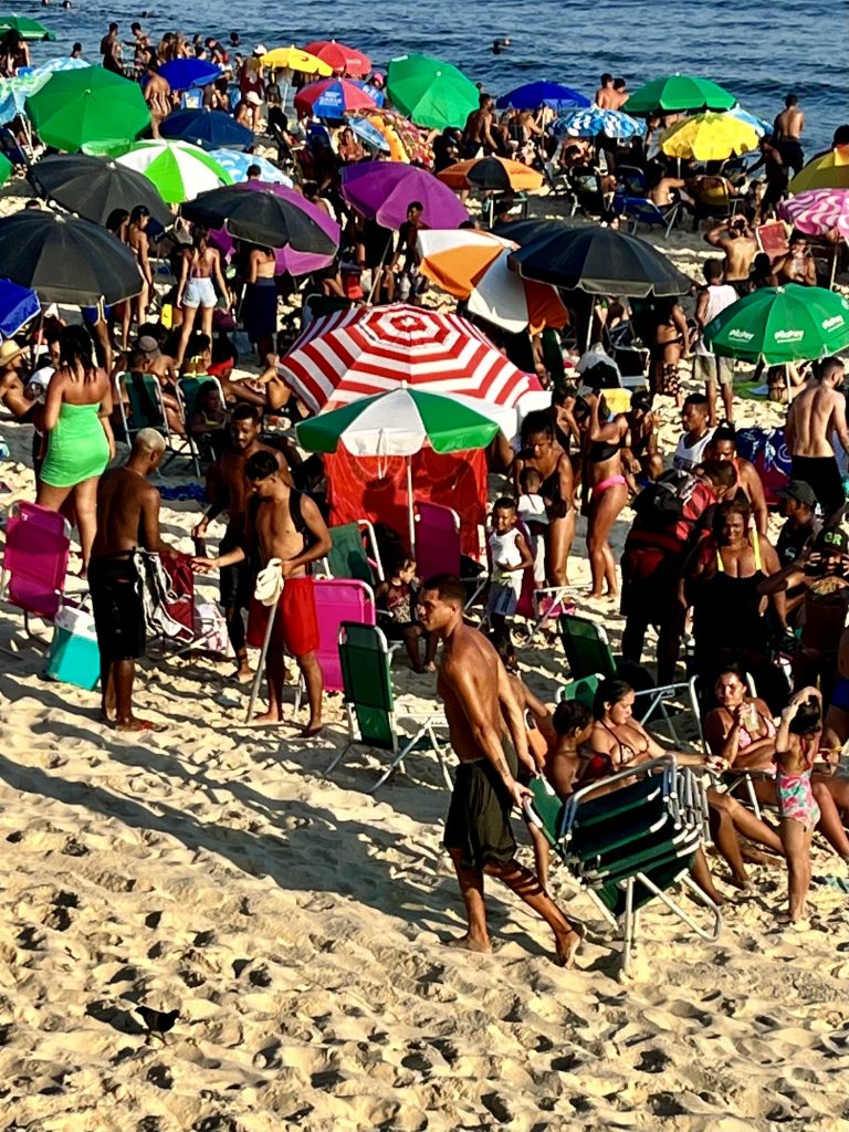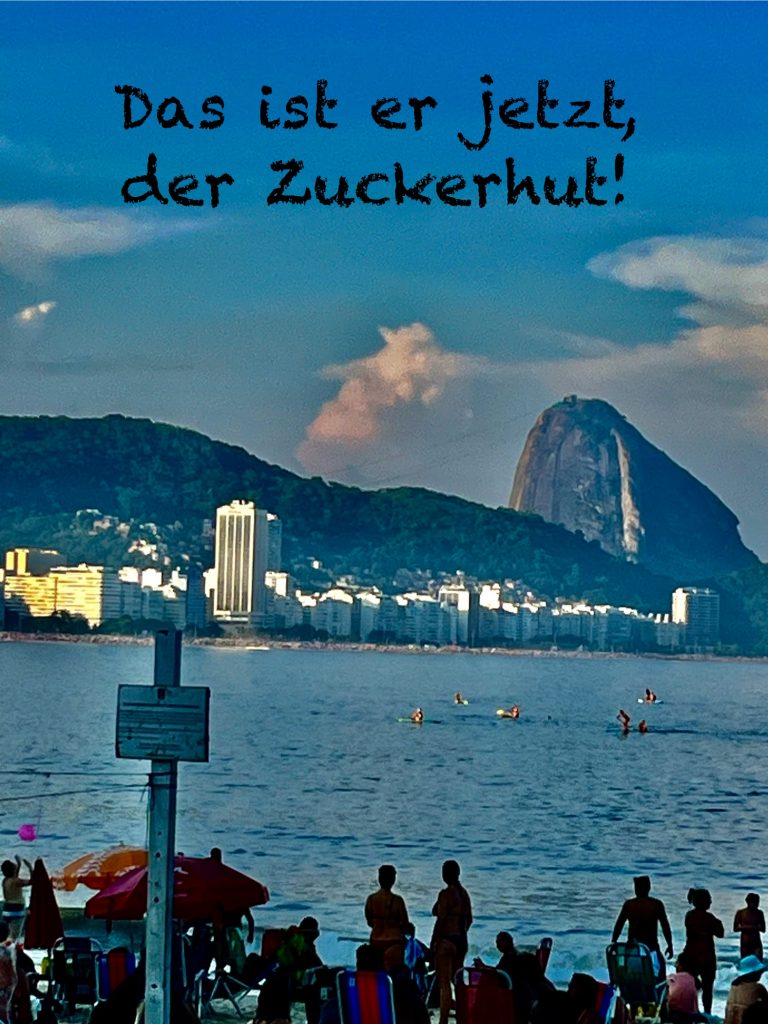 Ach, ich bin irgendwie ganz aufgedreht und furchtbar neugierig auf diese Stadt! Also flott etwas frischmachen und ab. Wir laufen los zum Ipanema Strand. Klaus geht ständig das Lied vom „Girl von Ipanema“ durch den Kopf. Er mag diesen Song sehr 🎶🎵🎶🎵…. Wenige Minuten später sind wir da. Ach du meine Güte, was ist denn hier los 😳! Menschenmassen liegen am Strand wie die sprichwörtlichen Sardinen. Auf den Wegen und der heute (Sonntag) für den Straßenverkehr gesperrten Straße, ist alles was Beine hat unterwegs. Es ist sehr heiß und es weht kein Lüftchen. Ich bin schier erschlagen von all den Eindrücken!