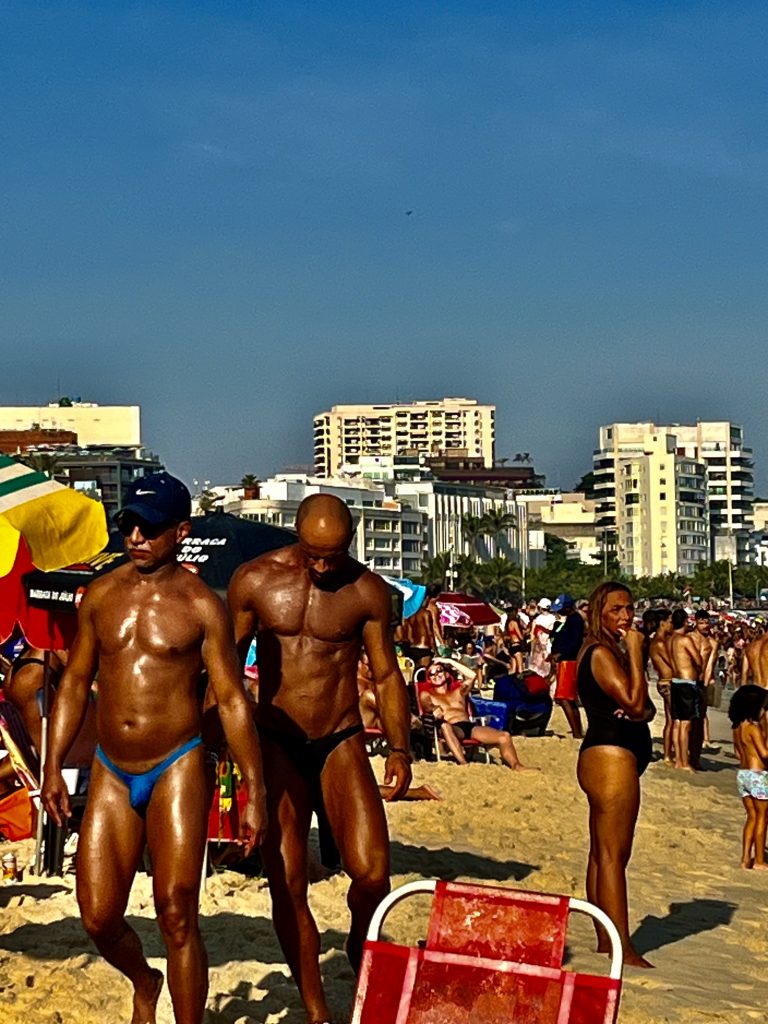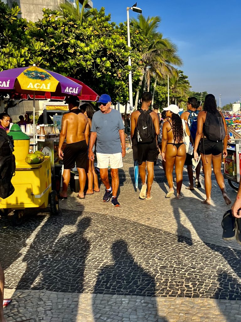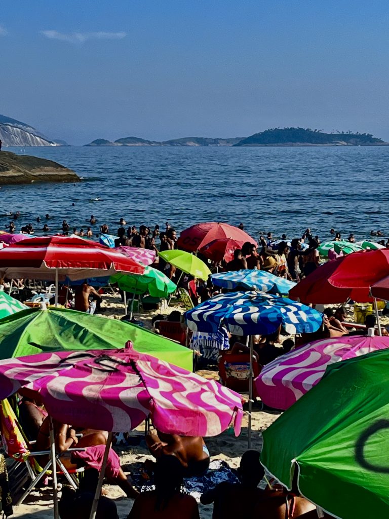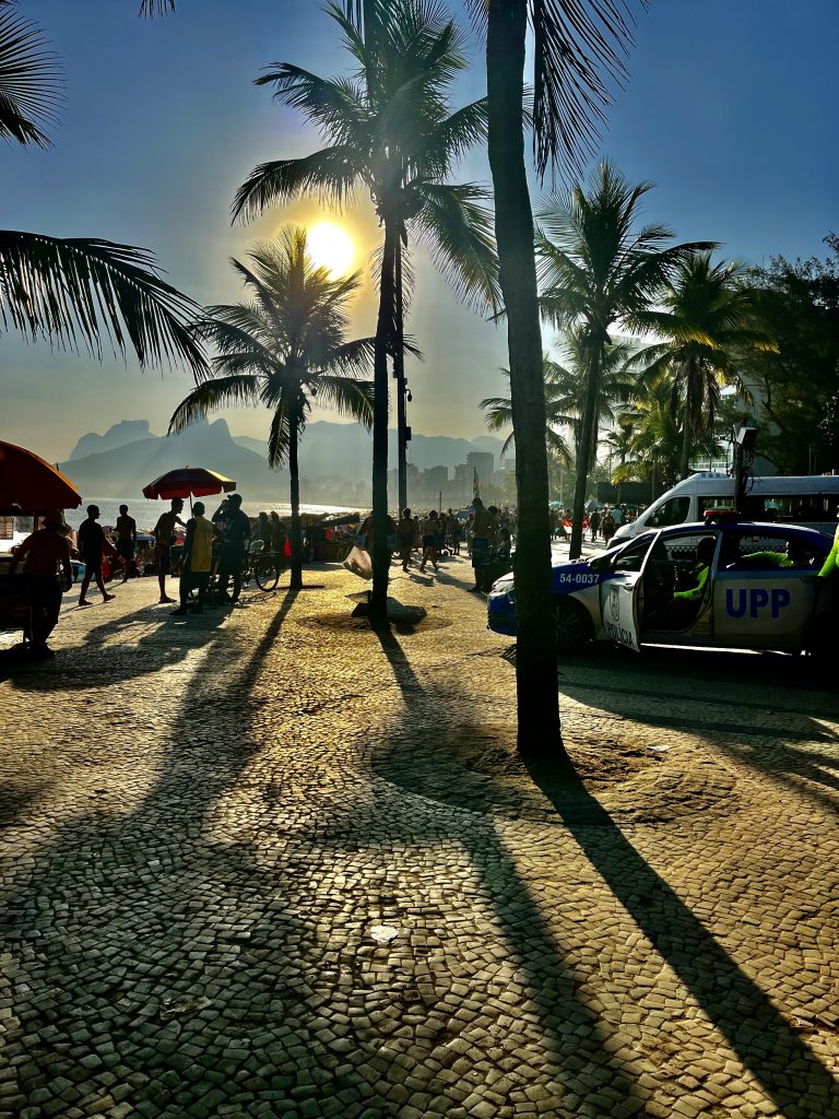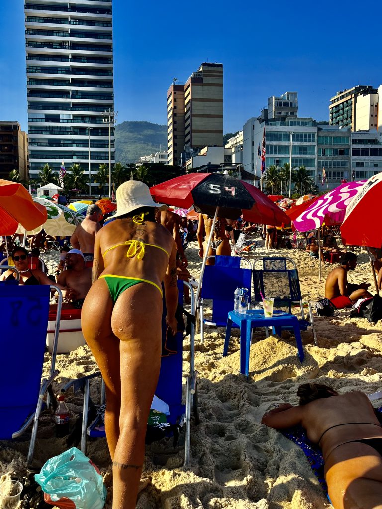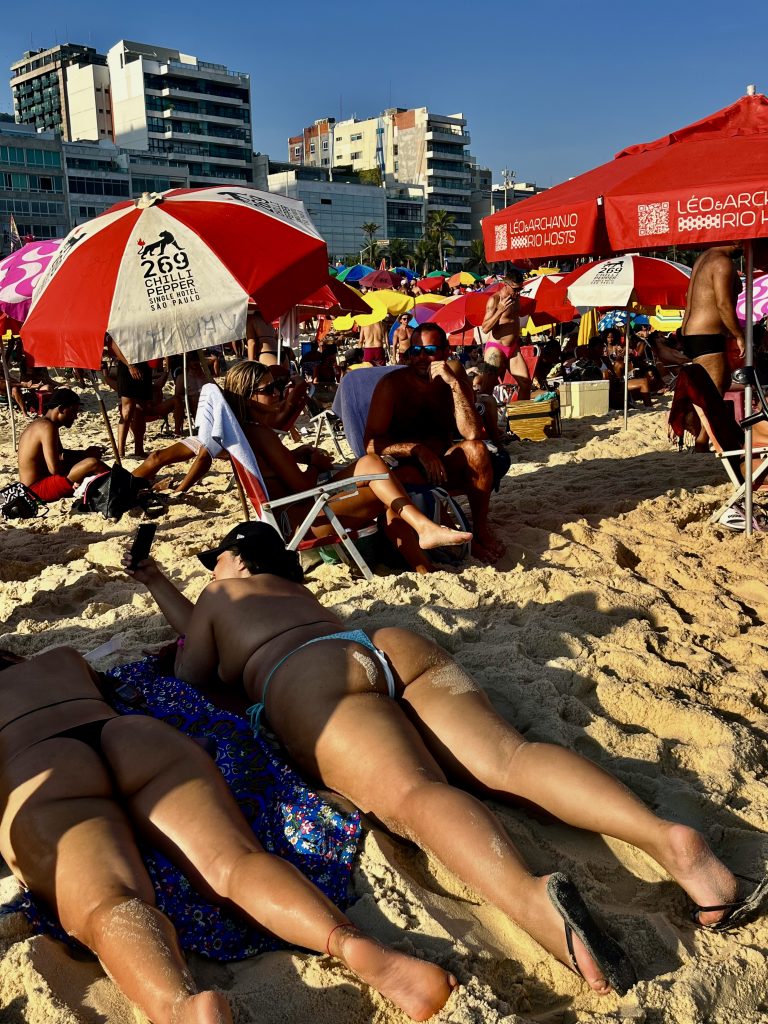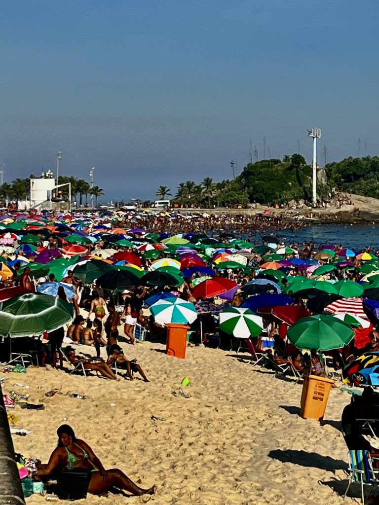 Ach, ich bin irgendwie ganz aufgedreht und furchtbar neugierig auf diese Stadt! Also flott etwas frischmachen und ab. Wir laufen los zum Ipanema Strand. Klaus geht ständig das Lied vom „Girl von Ipanema“ durch den Kopf. Er mag diesen Song sehr 🎶🎵🎶🎵…. Wenige Minuten später sind wir da. Ach du meine Güte, was ist denn hier los 😳! Menschenmassen liegen am Strand wie die sprichwörtlichen Sardinen. Auf den Wegen und der heute (Sonntag) für den Straßenverkehr gesperrten Straße, ist alles was Beine hat unterwegs. Es ist sehr heiß und es weht kein Lüftchen. Ich bin schier erschlagen von all den Eindrücken!