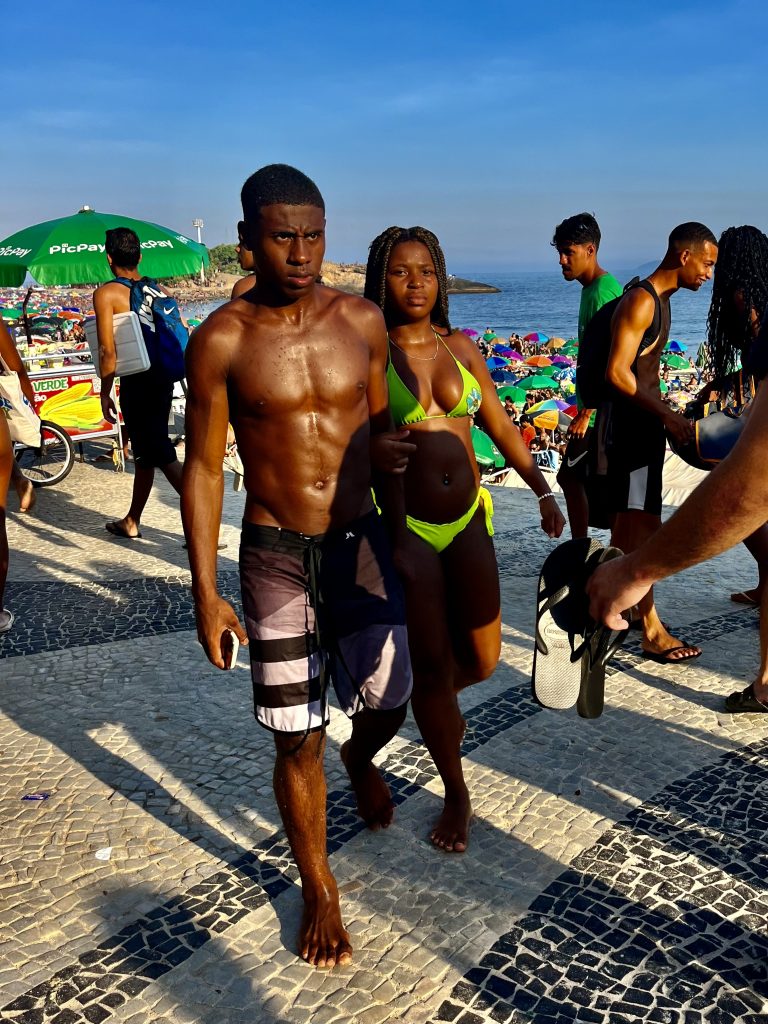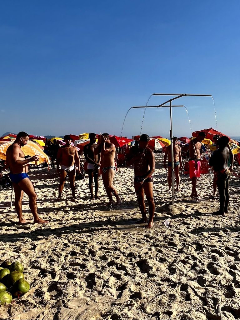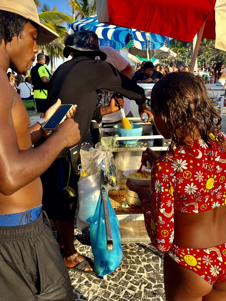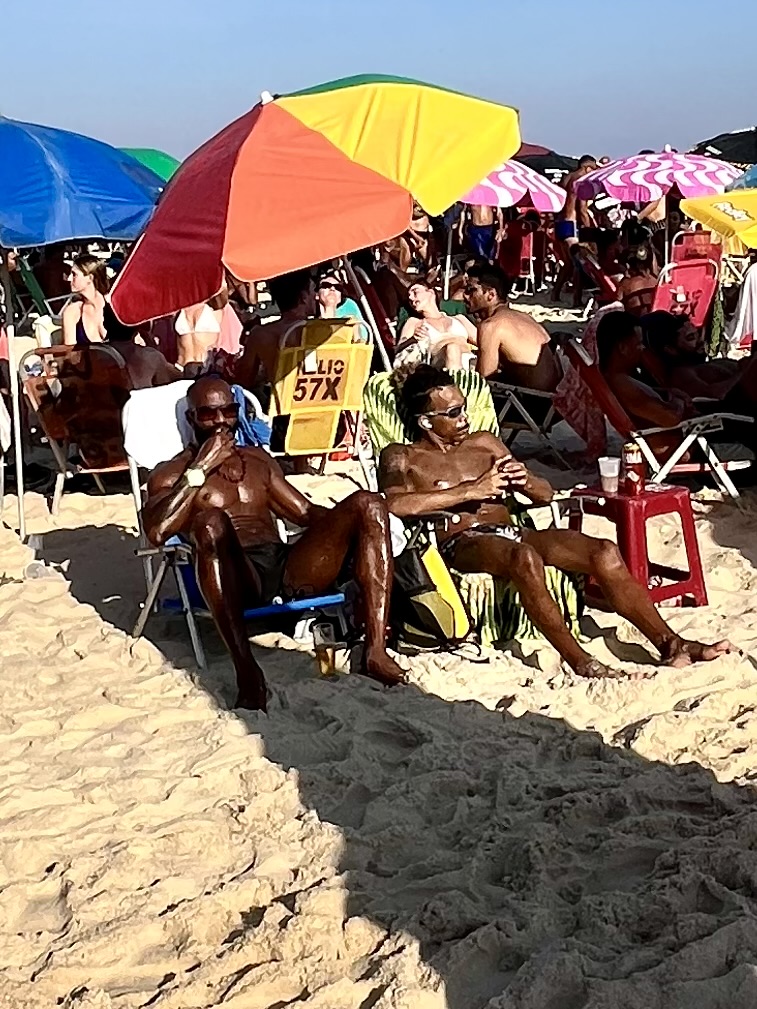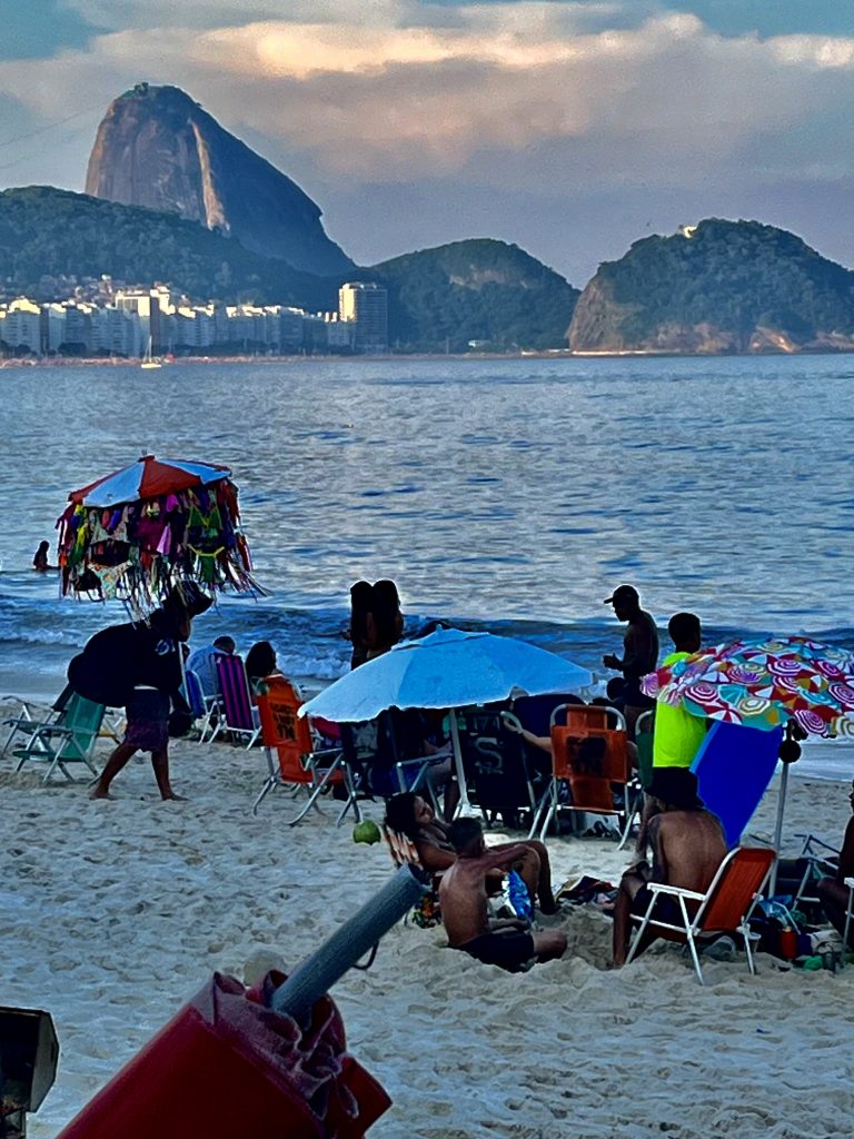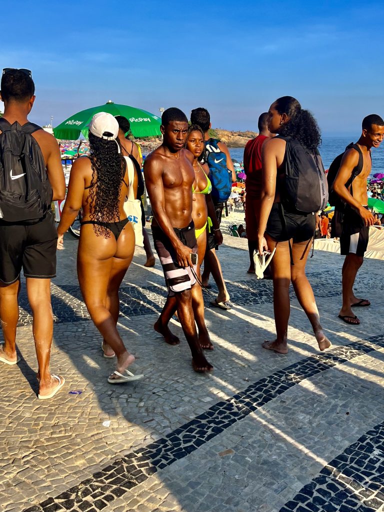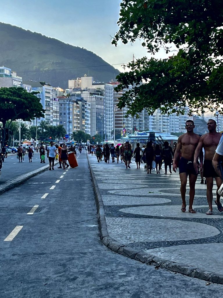 Ach, ich bin irgendwie ganz aufgedreht und furchtbar neugierig auf diese Stadt! Also flott etwas frischmachen und ab. Wir laufen los zum Ipanema Strand. Klaus geht ständig das Lied vom „Girl von Ipanema“ durch den Kopf. Er mag diesen Song sehr 🎶🎵🎶🎵…. Wenige Minuten später sind wir da. Ach du meine Güte, was ist denn hier los 😳! Menschenmassen liegen am Strand wie die sprichwörtlichen Sardinen. Auf den Wegen und der heute (Sonntag) für den Straßenverkehr gesperrten Straße, ist alles was Beine hat unterwegs. Es ist sehr heiß und es weht kein Lüftchen. Ich bin schier erschlagen von all den Eindrücken!