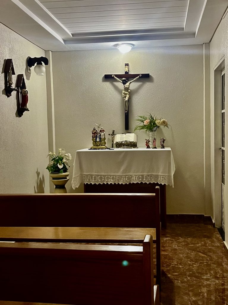 Nun sind wir da, das ist unser Hotel für 2 Nächte. Die Lobby ist okay, das einfache Zimmer sehr klein, mit nur einem klitzekleinen Fenster und kleinem, ollen Bad. Dafür haben wir eine hoteleigene Kapelle. 😉