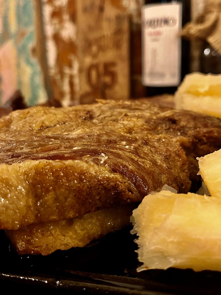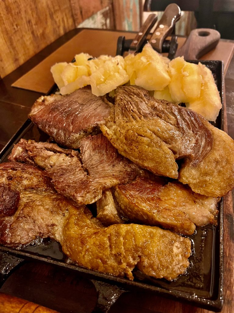 Auf der Karte lese ich etwas von Slow cooked Steak. Das möchte ich ausprobieren. Klaus schließt sich an, denn das gibt es nur ab 2 Personen, aufwärts. Was dann aber kommt, erschlägt uns fast. 🫣