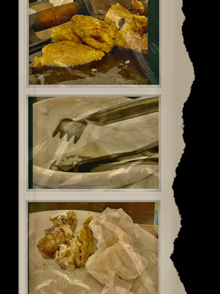 Das Fleisch ist sehr fett, zäh und sehnig. Vieles muss ich abschneiden oder „zurückgeben“. 🤢 Auch Klaus ist nicht glücklich. Mitgefangen, mitgehangen…