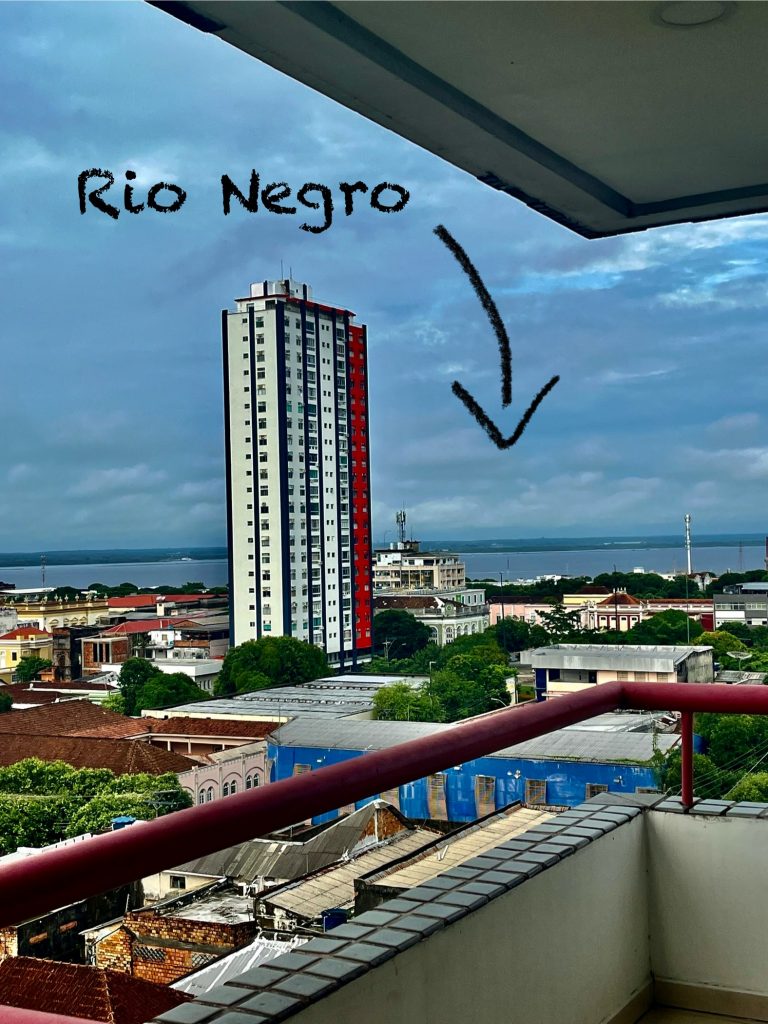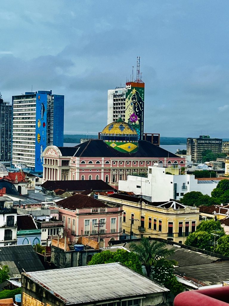Erst fliegen wir von Foz do Iguaçu nach São Paulo, haben aber schon beim Start zum ersten Mal Verspätung. Alle Mitreisenden mit Folgeflügen werden nervös. Wir auch etwas… Es geht aber alles gut, wir erreichen noch vor Boarding das neue Gate und besteigen das zweite Flugzeug. Jetzt erleben wir die 2. Verspätung mit Folgen für unser Nervensystem. Wir sind umringt von Familien mit kleinen Kindern, sehr kleinen Kindern. Wir sitzen angeschnallt und aufrecht in unseren Sitzen und warten auf den Start. Das Kind vor uns, ein süßes Mädchen von 2-3 Jahren soll auch auf ihrem Sitz angeschnallt sitzen. Das will sie aber nicht, sie will auf Mamas Schoß! Die Stewardessen verlangen das Sitzen auf ihrem Sitz, bis das Flugzeug gestartet ist und seine Flughöhe erreicht hat. Es startet aber nicht und sie will nicht sitzen. Sie schreit, schreit mittlerweile aus Leibeskräften und windet sich immer wieder aus ihrem Anschnallgurt heraus. Minuten später hat sie sich so eingeschrieen, dass auch das verbotene auf den Schoß nehmen der Mutter und auch des gegenüber sitzenden Vaters nichts mehr nützen. Sie schreit des Schreiens wegen. Bis wir starten vergehen laaange 45 Minuten… Hinter uns sitzt ein Elternpaar mit Baby, welches mit einem eigens mitgenommenen Bespaßungsprogramm auf dem IPad bei Laune gehalten wird. Lalalalalalaaa, lalalaa, lalaaalala… , Peng, Peng, Krach, Knack, (die härteren Videos werden aufgefahren, das Schreien vorne muss überstimmt werden) Lach, wirf hoch das Kind und Landung in Klaus Rückenlehne, auaaa…. 🙈🙉🙊 Ich muss mir teils die Ohren zuhalten. Alle anderen Fluggäste, die Maschine ist gerammelt voll, bleiben ruhig und gelassen. Ich bekomme zappelige Beine 😣. Nach einer knappen Stunde schläft das Schreimädchen ein und das Baby hinter uns schaut sein 4. Video… Wir sind mittlerweile in der Luft, und einige Fluggäste fangen an zu schnäuzen, zu husten und zu niesen. 😖 Hinter uns sitzt noch eine junge Frau, die die restlichen 3 Stunden des Fluges ihre Nase hochrotzt. Furchtbar‼️‼️‼️Wir erreichen Manaus mit 50 Minuten Verspätung. Auch das Gepäck lässt lange auf sich warten. Mein neuer Militärrucksack, hoffentlich kommt der auch. 🙏 Er kommt, auch Klaus‘ Tasche ist da. Noch im Flugzeug sitzend, informiert Klaus mit einer Notfallnummer unseren Abholer über unsere Verspätung. Kein Problem, er wisse Bescheid und warte auf uns. Sehr schön 👍! Endlich sind wir draußen und werden von einem englisch sprechenden Brasilianer empfangen. Er sprudelt auf uns ein, während er uns zu unserem Hotel bringt. Es ist dunkel und kurz vor 21:00 Uhr. Wie lange bleiben wir in Manaus, der 3 Millionenmetropole? Ach nur bis morgen Vormittag? Wir müssten uns unbedingt noch die Altstadt anschauen, die Oper besuchen und, und, und… Jooo, wir schauen morgen mal aus dem Fenster, ich glaube wir sehen dann schon alles. Und so ist es auch. Wir haben von unserem Zimmer aus einen guten Blick über die Altstadt.