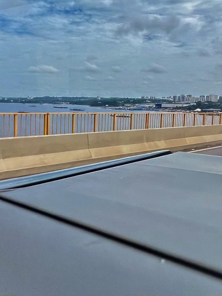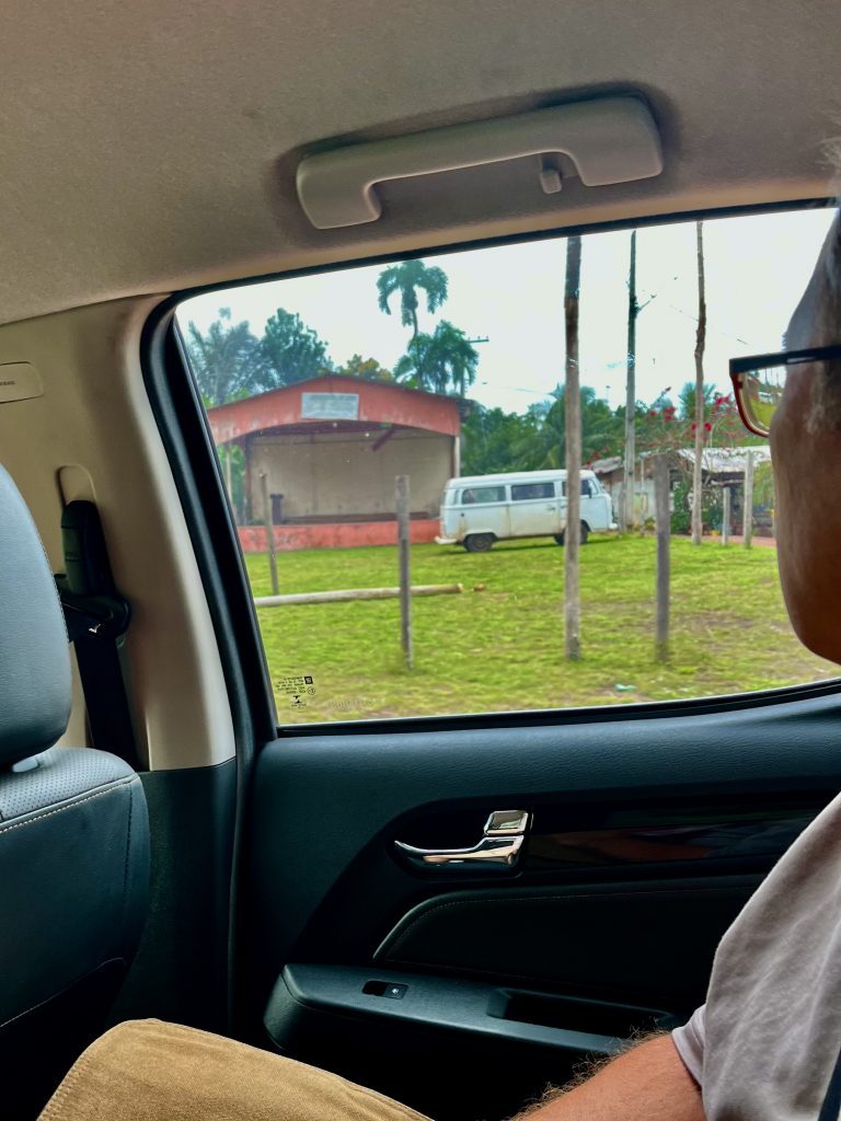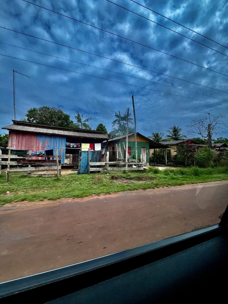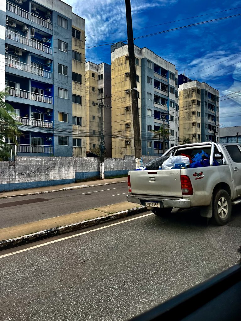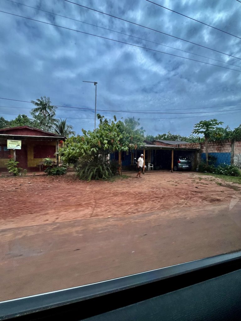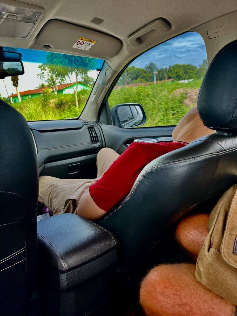 Über diesen schwarzen Fluss werden wir später noch zur Lodge tuckern. Nach einem guten Frühstück packen wir unsere 7 Sachen zusammen und warten in der Lobby auf unsere Abholung. Da steht sie schon da, die Chefin der Lodge höchstpersönlich. Sie, Fabiola und ihr Sohn holen uns mit ihrem Pick-up, einem Chrysler, ab. Wie jetzt? Nur uns beide? Ja! Nur uns beide. 😳 Wir dachten da würde eine ganze Gruppe Gäste abgeholt werden. Auch an unseren vorherigen Destinationen hatten wir nie damit gerechnet einen Guide für uns ganz allein zu haben. Tsss … Wir und unser Gepäck nehmen Platz, und werden nun 2 Stunden durchs Land zum Hafen chauffiert, um von dort mit dem Boot weitergebracht zu werden. Es geht durch Manaus und aus Manaus heraus, …