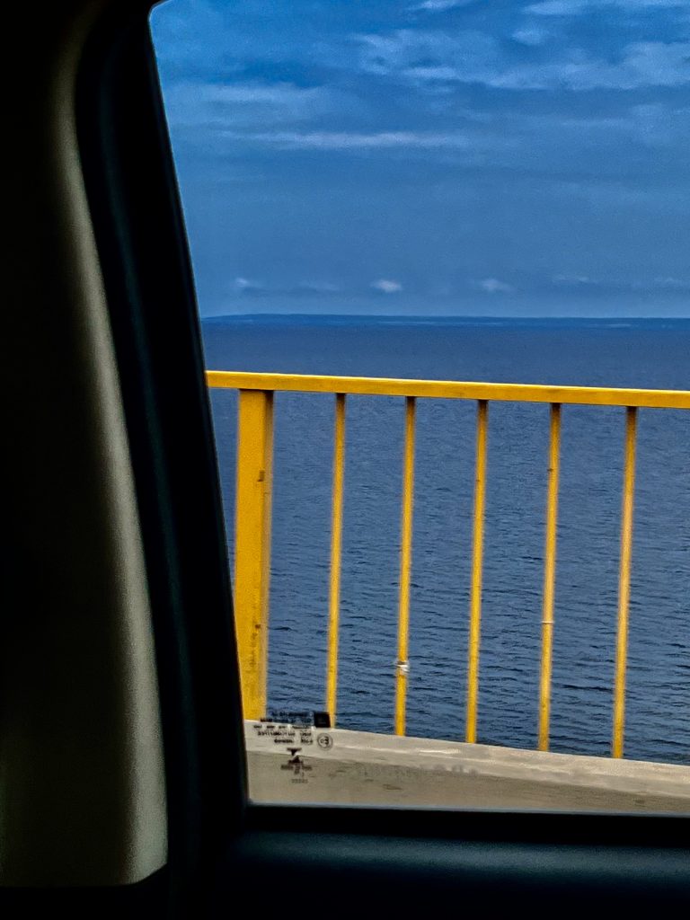 Hinter der Brücke wird es ländlich und die Natur üppig. Der Sohnemann, noch nicht ganz der Pubertät entwachsen, klappt seine Rückenlehne nach hinten und pennt ein. Dummerweise sitzt Klaus hinter ihm und muss seine Beine nun schräg stellen. 😏
